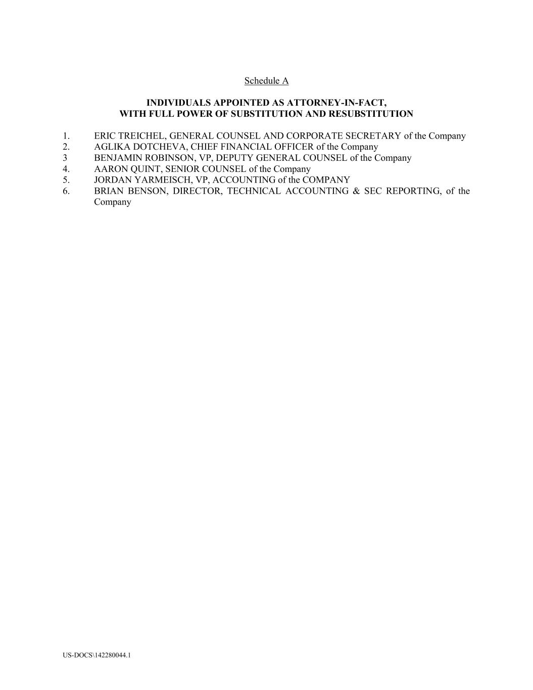 US-DOCS\142280044.1 Schedule A INDIVIDUALS APPOINTED AS ATTORNEY-IN-FACT, WITH FULL POWER OF SUBSTITUTION AND RESUBSTITUTION 1. ERIC TREICHEL, GENERAL COUNSEL AND CORPORATE SECRETARY of the Company 2. AGLIKA DOTCHEVA, CHIEF FINANCIAL OFFICER of the Company 3 BENJAMIN ROBINSON, VP, DEPUTY GENERAL COUNSEL of the Company 4. AARON QUINT, SENIOR COUNSEL of the Company 5. JORDAN YARMEISCH, VP, ACCOUNTING of the COMPANY 6. BRIAN BENSON, DIRECTOR, TECHNICAL ACCOUNTING & SEC REPORTING, of the Company