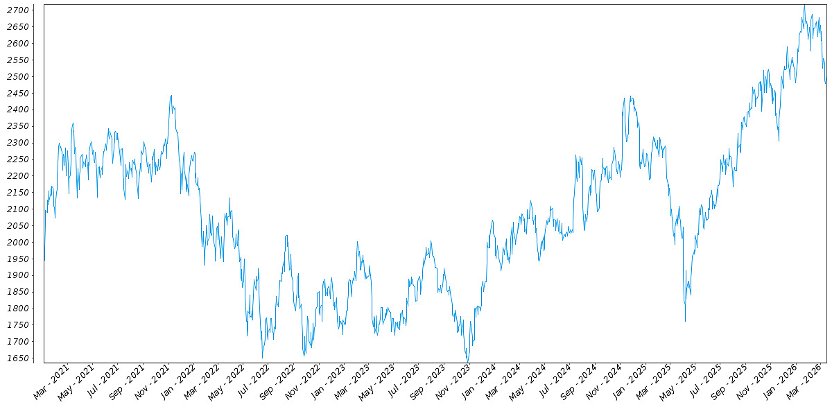 The following graph sets forth the daily historical performance of the SPX in the period from January 2, 2021 through the pricing date. We obtained this historical data from Bloomberg L.P. We have not independently verified the accuracy or completeness of the information obtained from Bloomberg L.P. On the pricing date, the closing level of the SPX was 6,699.38.