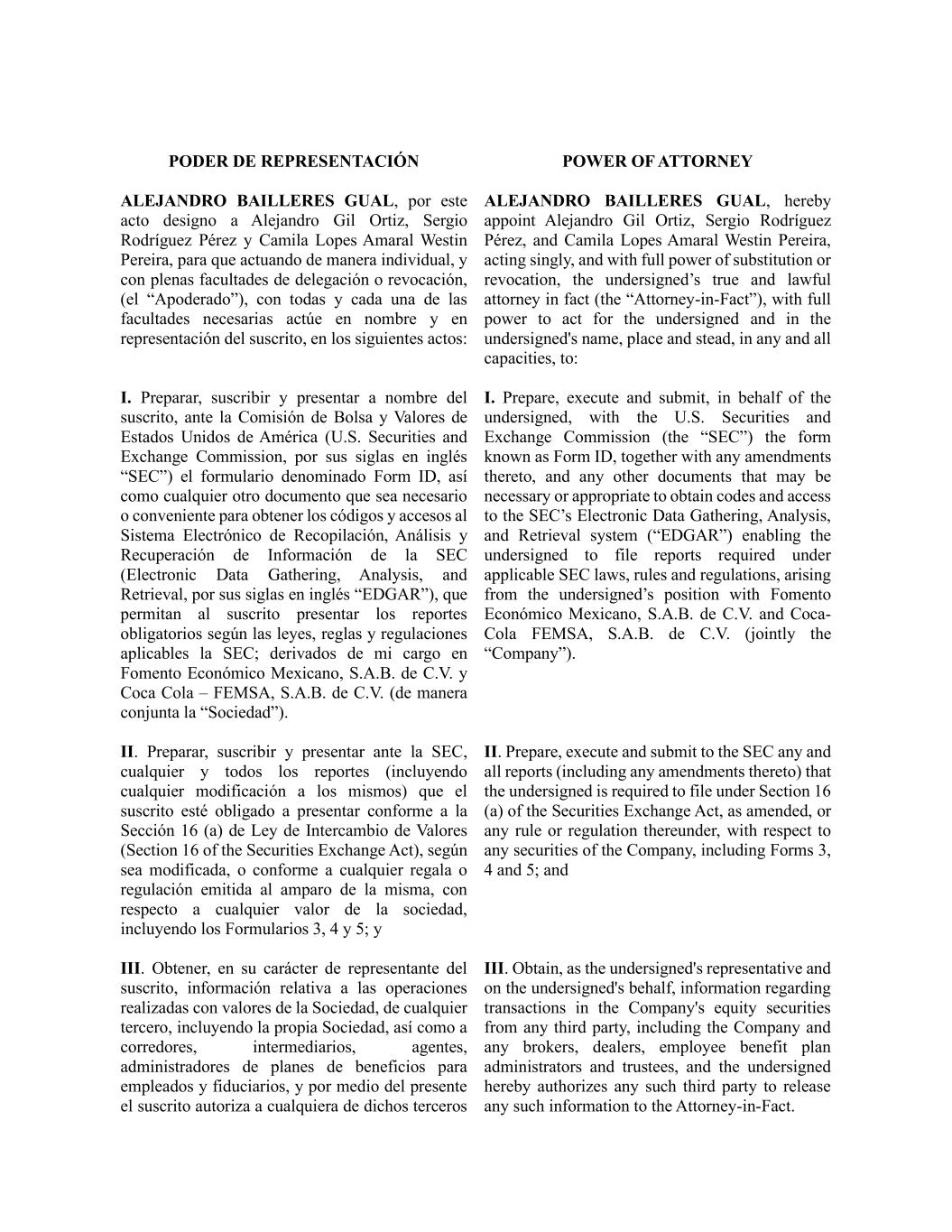 PODER DE REPRESENTACIÓN POWER OF ATTORNEY ALEJANDRO BAILLERES GUAL, por este acto designo a Alejandro Gil Ortiz, Sergio Rodríguez Pérez y Camila Lopes Amaral Westin Pereira, para que actuando de manera individual, y con plenas facultades de delegación o revocación, (el “Apoderado”), con todas y cada una de las facultades necesarias actúe en nombre y en representación del suscrito, en los siguientes actos: ALEJANDRO BAILLERES GUAL, hereby appoint Alejandro Gil Ortiz, Sergio Rodríguez Pérez, and Camila Lopes Amaral Westin Pereira, acting singly, and with full power of substitution or revocation, the undersigned’s true and lawful attorney in fact (the “Attorney-in-Fact”), with full power to act for the undersigned and in the undersigned's name, place and stead, in any and all capacities, to: I. Preparar, suscribir y presentar a nombre del suscrito, ante la Comisión de Bolsa y Valores de Estados Unidos de América (U.S. Securities and Exchange Commission, por sus siglas en inglés “SEC”) el formulario denominado Form ID, así como cualquier otro documento que sea necesario o conveniente para obtener los códigos y accesos al Sistema Electrónico de Recopilación, Análisis y Recuperación de Información de la SEC (Electronic Data Gathering, Analysis, and Retrieval, por sus siglas en inglés “EDGAR”), que permitan al suscrito presentar los reportes obligatorios según las leyes, reglas y regulaciones aplicables la SEC; derivados de mi cargo en Fomento Económico Mexicano, S.A.B. de C.V. y Coca Cola – FEMSA, S.A.B. de C.V. (de manera conjunta la “Sociedad”). I. Prepare, execute and submit, in behalf of the undersigned, with the U.S. Securities and Exchange Commission (the “SEC”) the form known as Form ID, together with any amendments thereto, and any other documents that may be necessary or appropriate to obtain codes and access to the SEC’s Electronic Data Gathering, Analysis, and Retrieval system (“EDGAR”) enabling the undersigned to file reports required under applicable SEC laws, rules and regulations, arising from the undersigned’s position with Fomento Económico Mexicano, S.A.B. de C.V. and Coca- Cola FEMSA, S.A.B. de C.V. (jointly the “Company”). II. Preparar, suscribir y presentar ante la SEC, cualquier y todos los reportes (incluyendo cualquier modificación a los mismos) que el suscrito esté obligado a presentar conforme a la Sección 16 (a) de Ley de Intercambio de Valores (Section 16 of the Securities Exchange Act), según sea modificada, o conforme a cualquier regala o regulación emitida al amparo de la misma, con respecto a cualquier valor de la sociedad, incluyendo los Formularios 3, 4 y 5; y II. Prepare, execute and submit to the SEC any and all reports (including any amendments thereto) that the undersigned is required to file under Section 16 (a) of the Securities Exchange Act, as amended, or any rule or regulation thereunder, with respect to any securities of the Company, including Forms 3, 4 and 5; and III. Obtener, en su carácter de representante del suscrito, información relativa a las operaciones realizadas con valores de la Sociedad, de cualquier tercero, incluyendo la propia Sociedad, así como a corredores, intermediarios, agentes, administradores de planes de beneficios para empleados y fiduciarios, y por medio del presente el suscrito autoriza a cualquiera de dichos terceros III. Obtain, as the undersigned's representative and on the undersigned's behalf, information regarding transactions in the Company's equity securities from any third party, including the Company and any brokers, dealers, employee benefit plan administrators and trustees, and the undersigned hereby authorizes any such third party to release any such information to the Attorney-in-Fact.