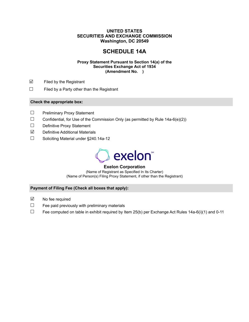 UNITED STATES SECURITIES AND EXCHANGE COMMISSION Washington, DC 20549 SCHEDULE 14A Proxy Statement Pursuant to Section 14(a) of the Securities Exchange Act of 1934 (Amendment No. ) ☑ Filed by the Registrant ☐ Filed by a Party other than the Registrant Check the appropriate box: ☐ Preliminary Proxy Statement ☐ Confidential, for Use of the Commission Only (as permitted by Rule 14a-6(e)(2)) ☐ Definitive Proxy Statement ☑ Definitive Additional Materials ☐ Soliciting Material under §240.14a-12 Exelon Corporation (Name of Registrant as Specified In Its Charter) (Name of Person(s) Filing Proxy Statement, if other than the Registrant) Payment of Filing Fee (Check all boxes that apply): ☑ No fee required ☐ Fee paid previously with preliminary materials ☐ Fee computed on table in exhibit required by Item 25(b) per Exchange Act Rules 14a-6(i)(1) and 0-11