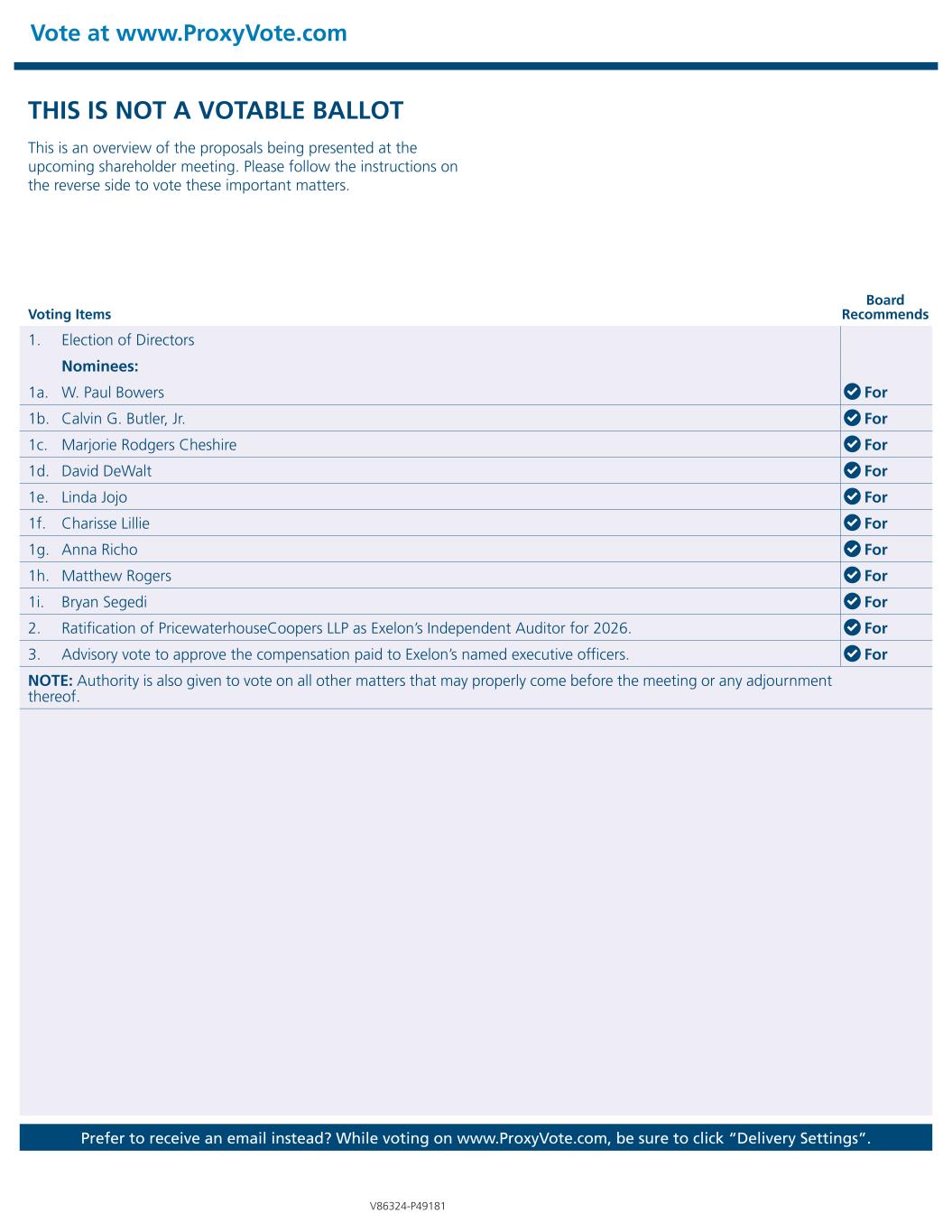 Vote at www.ProxyVote.com Prefer to receive an email instead? While voting on www.ProxyVote.com, be sure to click “Delivery Settings”. Voting Items Board Recommends V86324-P49181 THIS IS NOT A VOTABLE BALLOT This is an overview of the proposals being presented at the upcoming shareholder meeting. Please follow the instructions on the reverse side to vote these important matters. 1. Election of Directors Nominees: 1a. W. Paul Bowers For 1b. Calvin G. Butler, Jr. For 1c. Marjorie Rodgers Cheshire For 1d. David DeWalt For 1e. Linda Jojo For 1f. Charisse Lillie For 1g. Anna Richo For 1h. Matthew Rogers For 1i. Bryan Segedi For 2. Ratification of PricewaterhouseCoopers LLP as Exelon’s Independent Auditor for 2026. For 3. Advisory vote to approve the compensation paid to Exelon’s named executive officers. For NOTE: Authority is also given to vote on all other matters that may properly come before the meeting or any adjournment thereof.