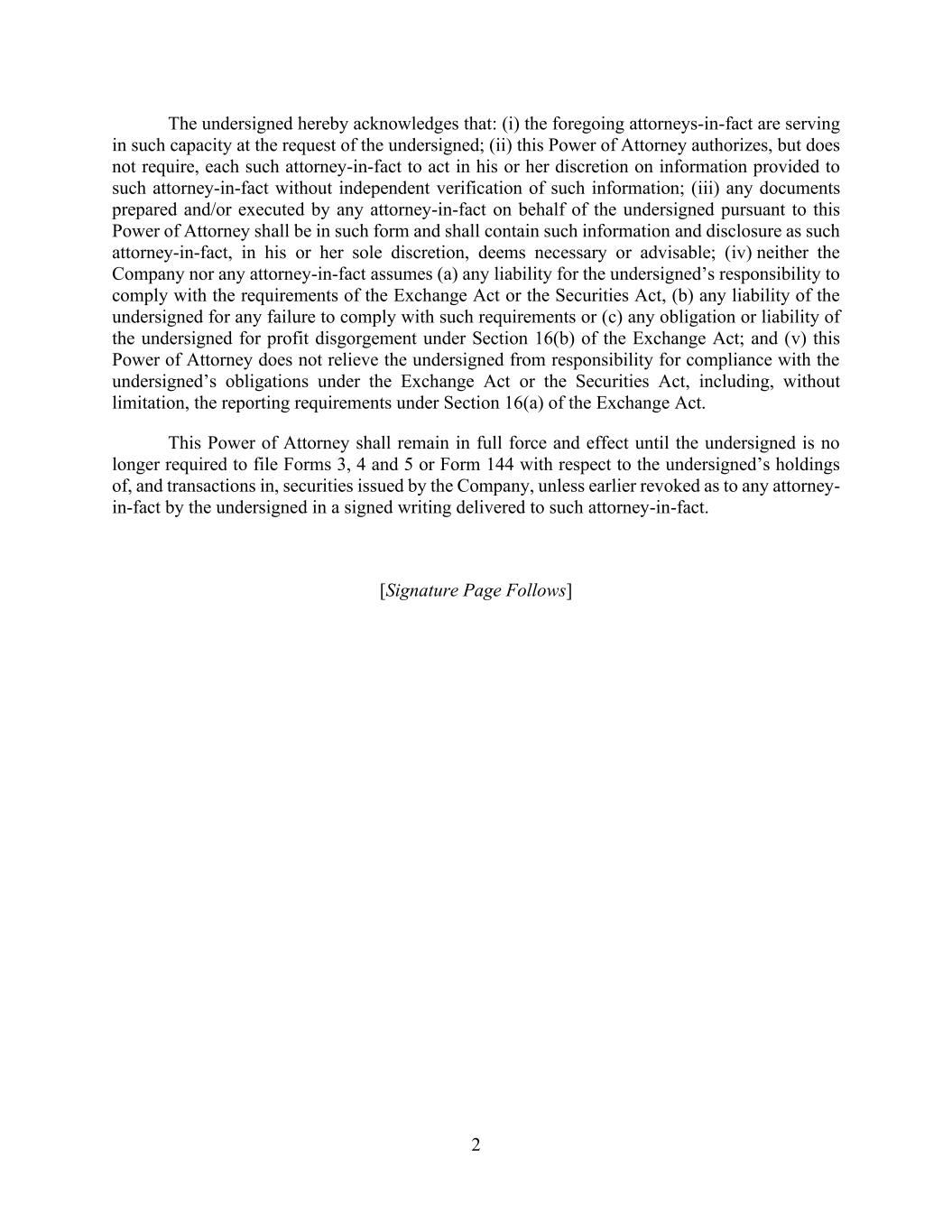 2 The undersigned hereby acknowledges that: (i) the foregoing attorneys-in-fact are serving in such capacity at the request of the undersigned; (ii) this Power of Attorney authorizes, but does not require, each such attorney-in-fact to act in his or her discretion on information provided to such attorney-in-fact without independent verification of such information; (iii) any documents prepared and/or executed by any attorney-in-fact on behalf of the undersigned pursuant to this Power of Attorney shall be in such form and shall contain such information and disclosure as such attorney-in-fact, in his or her sole discretion, deems necessary or advisable; (iv) neither the Company nor any attorney-in-fact assumes (a) any liability for the undersigned’s responsibility to comply with the requirements of the Exchange Act or the Securities Act, (b) any liability of the undersigned for any failure to comply with such requirements or (c) any obligation or liability of the undersigned for profit disgorgement under Section 16(b) of the Exchange Act; and (v) this Power of Attorney does not relieve the undersigned from responsibility for compliance with the undersigned’s obligations under the Exchange Act or the Securities Act, including, without limitation, the reporting requirements under Section 16(a) of the Exchange Act. This Power of Attorney shall remain in full force and effect until the undersigned is no longer required to file Forms 3, 4 and 5 or Form 144 with respect to the undersigned’s holdings of, and transactions in, securities issued by the Company, unless earlier revoked as to any attorney- in-fact by the undersigned in a signed writing delivered to such attorney-in-fact. [Signature Page Follows]