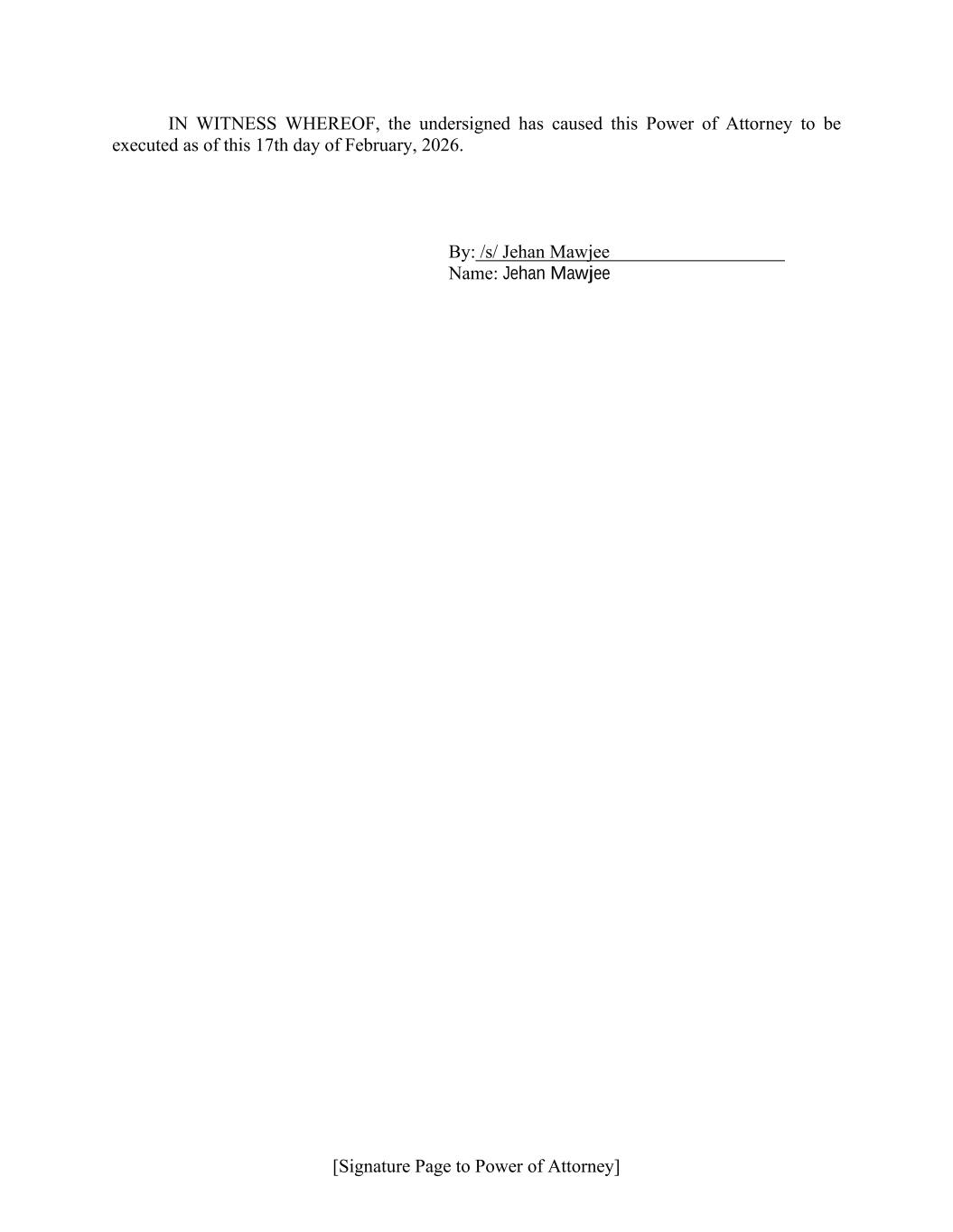 [Signature Page to Power of Attorney] IN WITNESS WHEREOF, the undersigned has caused this Power of Attorney to be executed as of this 17th day of February, 2026. By: /s/ Jehan Mawjee Name: Jehan Mawjee