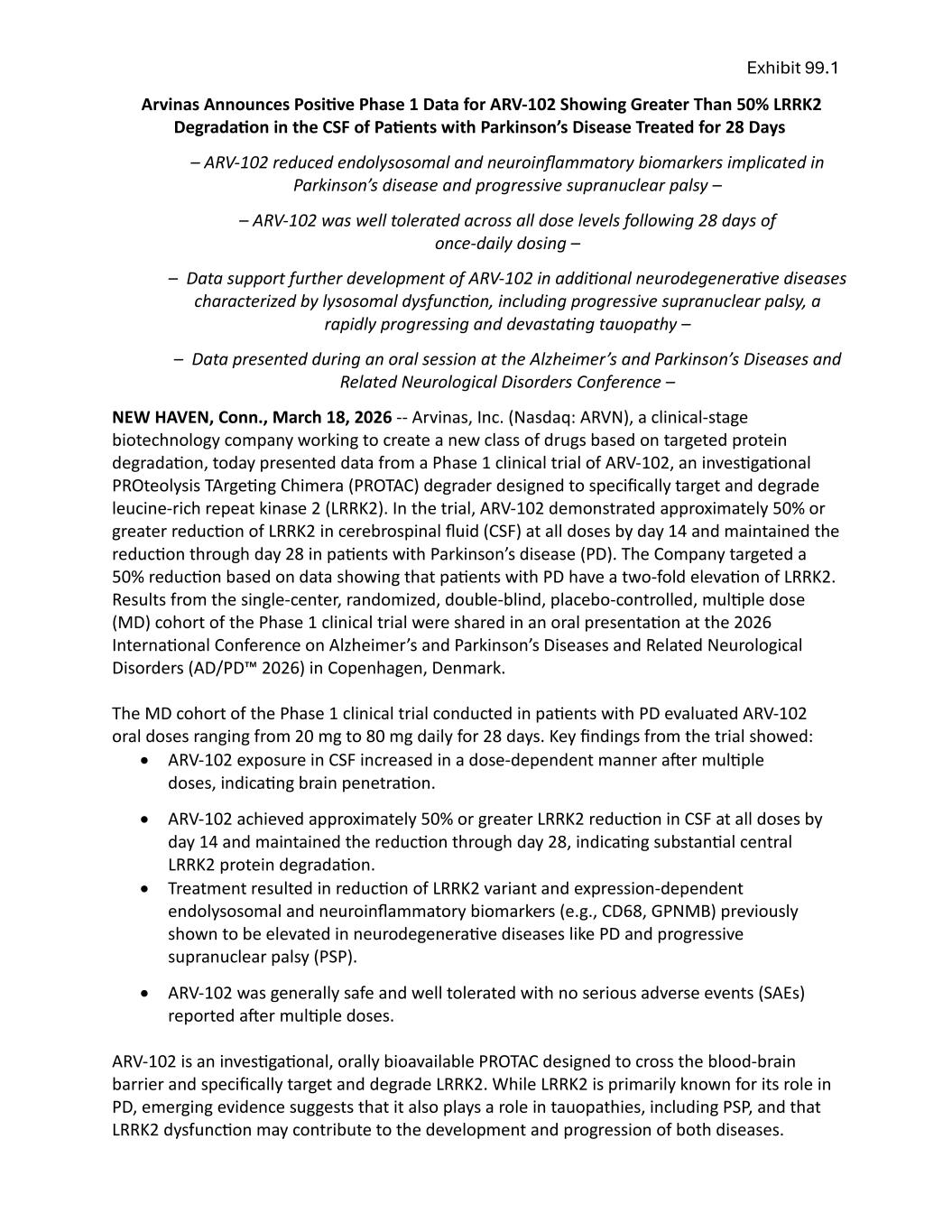 Exhibit 99.1 Arvinas Announces Positive Phase 1 Data for ARV-102 Showing Greater Than 50% LRRK2 Degradation in the CSF of Patients with Parkinson’s Disease Treated for 28 Days – ARV-102 reduced endolysosomal and neuroinflammatory biomarkers implicated in Parkinson’s disease and progressive supranuclear palsy – – ARV-102 was well tolerated across all dose levels following 28 days of once-daily dosing – – Data support further development of ARV-102 in additional neurodegenerative diseases characterized by lysosomal dysfunction, including progressive supranuclear palsy, a rapidly progressing and devastating tauopathy – – Data presented during an oral session at the Alzheimer’s and Parkinson’s Diseases and Related Neurological Disorders Conference – NEW HAVEN, Conn., March 18, 2026 -- Arvinas, Inc. (Nasdaq: ARVN), a clinical-stage biotechnology company working to create a new class of drugs based on targeted protein degradation, today presented data from a Phase 1 clinical trial of ARV-102, an investigational PROteolysis TArgeting Chimera (PROTAC) degrader designed to specifically target and degrade leucine-rich repeat kinase 2 (LRRK2). In the trial, ARV-102 demonstrated approximately 50% or greater reduction of LRRK2 in cerebrospinal fluid (CSF) at all doses by day 14 and maintained the reduction through day 28 in patients with Parkinson’s disease (PD). The Company targeted a 50% reduction based on data showing that patients with PD have a two-fold elevation of LRRK2. Results from the single-center, randomized, double-blind, placebo-controlled, multiple dose (MD) cohort of the Phase 1 clinical trial were shared in an oral presentation at the 2026 International Conference on Alzheimer’s and Parkinson’s Diseases and Related Neurological Disorders (AD/PD™ 2026) in Copenhagen, Denmark. The MD cohort of the Phase 1 clinical trial conducted in patients with PD evaluated ARV-102 oral doses ranging from 20 mg to 80 mg daily for 28 days. Key findings from the trial showed: • ARV-102 exposure in CSF increased in a dose-dependent manner after multiple doses, indicating brain penetration. • ARV-102 achieved approximately 50% or greater LRRK2 reduction in CSF at all doses by day 14 and maintained the reduction through day 28, indicating substantial central LRRK2 protein degradation. • Treatment resulted in reduction of LRRK2 variant and expression-dependent endolysosomal and neuroinflammatory biomarkers (e.g., CD68, GPNMB) previously shown to be elevated in neurodegenerative diseases like PD and progressive supranuclear palsy (PSP). • ARV-102 was generally safe and well tolerated with no serious adverse events (SAEs) reported after multiple doses. ARV-102 is an investigational, orally bioavailable PROTAC designed to cross the blood-brain barrier and specifically target and degrade LRRK2. While LRRK2 is primarily known for its role in PD, emerging evidence suggests that it also plays a role in tauopathies, including PSP, and that LRRK2 dysfunction may contribute to the development and progression of both diseases.