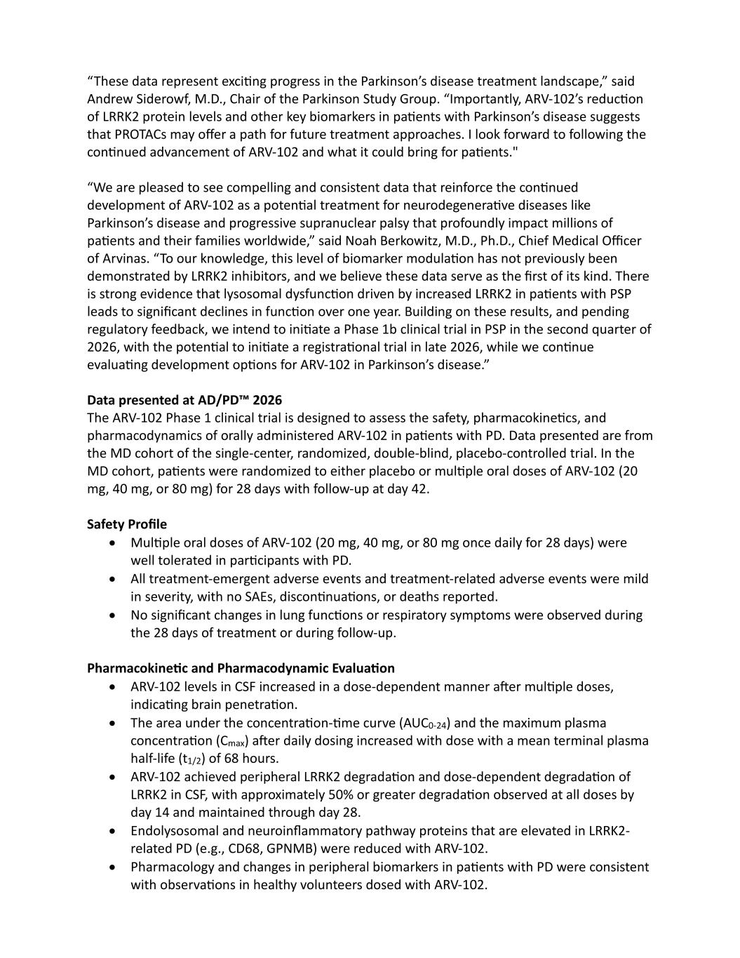 “These data represent exciting progress in the Parkinson’s disease treatment landscape,” said Andrew Siderowf, M.D., Chair of the Parkinson Study Group. “Importantly, ARV-102’s reduction of LRRK2 protein levels and other key biomarkers in patients with Parkinson’s disease suggests that PROTACs may offer a path for future treatment approaches. I look forward to following the continued advancement of ARV-102 and what it could bring for patients." “We are pleased to see compelling and consistent data that reinforce the continued development of ARV-102 as a potential treatment for neurodegenerative diseases like Parkinson’s disease and progressive supranuclear palsy that profoundly impact millions of patients and their families worldwide,” said Noah Berkowitz, M.D., Ph.D., Chief Medical Officer of Arvinas. “To our knowledge, this level of biomarker modulation has not previously been demonstrated by LRRK2 inhibitors, and we believe these data serve as the first of its kind. There is strong evidence that lysosomal dysfunction driven by increased LRRK2 in patients with PSP leads to significant declines in function over one year. Building on these results, and pending regulatory feedback, we intend to initiate a Phase 1b clinical trial in PSP in the second quarter of 2026, with the potential to initiate a registrational trial in late 2026, while we continue evaluating development options for ARV-102 in Parkinson’s disease.” Data presented at AD/PD™ 2026 The ARV-102 Phase 1 clinical trial is designed to assess the safety, pharmacokinetics, and pharmacodynamics of orally administered ARV-102 in patients with PD. Data presented are from the MD cohort of the single-center, randomized, double-blind, placebo-controlled trial. In the MD cohort, patients were randomized to either placebo or multiple oral doses of ARV-102 (20 mg, 40 mg, or 80 mg) for 28 days with follow-up at day 42. Safety Profile • Multiple oral doses of ARV-102 (20 mg, 40 mg, or 80 mg once daily for 28 days) were well tolerated in participants with PD. • All treatment-emergent adverse events and treatment-related adverse events were mild in severity, with no SAEs, discontinuations, or deaths reported. • No significant changes in lung functions or respiratory symptoms were observed during the 28 days of treatment or during follow-up. Pharmacokinetic and Pharmacodynamic Evaluation • ARV-102 levels in CSF increased in a dose-dependent manner after multiple doses, indicating brain penetration. • The area under the concentration-time curve (AUC0-24) and the maximum plasma concentration (Cmax) after daily dosing increased with dose with a mean terminal plasma half-life (t1/2) of 68 hours. • ARV-102 achieved peripheral LRRK2 degradation and dose-dependent degradation of LRRK2 in CSF, with approximately 50% or greater degradation observed at all doses by day 14 and maintained through day 28. • Endolysosomal and neuroinflammatory pathway proteins that are elevated in LRRK2- related PD (e.g., CD68, GPNMB) were reduced with ARV-102. • Pharmacology and changes in peripheral biomarkers in patients with PD were consistent with observations in healthy volunteers dosed with ARV-102.