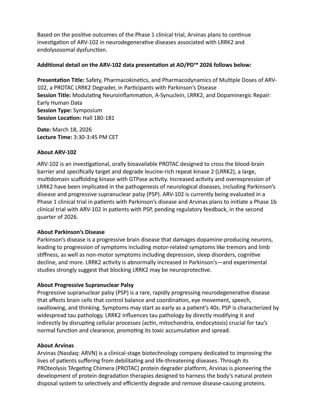Based on the positive outcomes of the Phase 1 clinical trial, Arvinas plans to continue investigation of ARV-102 in neurodegenerative diseases associated with LRRK2 and endolysosomal dysfunction. Additional detail on the ARV-102 data presentation at AD/PD™ 2026 follows below: Presentation Title: Safety, Pharmacokinetics, and Pharmacodynamics of Multiple Doses of ARV- 102, a PROTAC LRRK2 Degrader, in Participants with Parkinson’s Disease Session Title: Modulating Neuroinflammation, Α-Synuclein, LRRK2, and Dopaminergic Repair: Early Human Data Session Type: Symposium Session Location: Hall 180-181 Date: March 18, 2026 Lecture Time: 3:30-3:45 PM CET About ARV-102 ARV-102 is an investigational, orally bioavailable PROTAC designed to cross the blood-brain barrier and specifically target and degrade leucine-rich repeat kinase 2 (LRRK2), a large, multidomain scaffolding kinase with GTPase activity. Increased activity and overexpression of LRRK2 have been implicated in the pathogenesis of neurological diseases, including Parkinson’s disease and progressive supranuclear palsy (PSP). ARV-102 is currently being evaluated in a Phase 1 clinical trial in patients with Parkinson’s disease and Arvinas plans to initiate a Phase 1b clinical trial with ARV-102 in patients with PSP, pending regulatory feedback, in the second quarter of 2026. About Parkinson’s Disease Parkinson’s disease is a progressive brain disease that damages dopamine-producing neurons, leading to progression of symptoms including motor-related symptoms like tremors and limb stiffness, as well as non-motor symptoms including depression, sleep disorders, cognitive decline, and more. LRRK2 activity is abnormally increased in Parkinson’s—and experimental studies strongly suggest that blocking LRRK2 may be neuroprotective. About Progressive Supranuclear Palsy Progressive supranuclear palsy (PSP) is a rare, rapidly progressing neurodegenerative disease that affects brain cells that control balance and coordination, eye movement, speech, swallowing, and thinking. Symptoms may start as early as a patient’s 40s. PSP is characterized by widespread tau pathology. LRRK2 influences tau pathology by directly modifying it and indirectly by disrupting cellular processes (actin, mitochondria, endocytosis) crucial for tau’s normal function and clearance, promoting its toxic accumulation and spread. About Arvinas Arvinas (Nasdaq: ARVN) is a clinical-stage biotechnology company dedicated to improving the lives of patients suffering from debilitating and life-threatening diseases. Through its PROteolysis TArgeting Chimera (PROTAC) protein degrader platform, Arvinas is pioneering the development of protein degradation therapies designed to harness the body’s natural protein disposal system to selectively and efficiently degrade and remove disease-causing proteins.