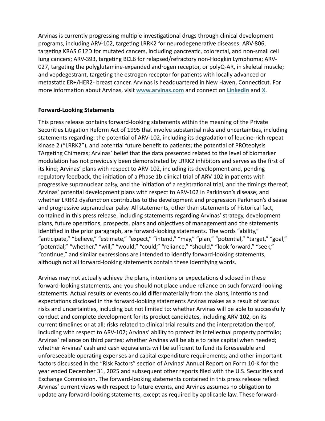 Arvinas is currently progressing multiple investigational drugs through clinical development programs, including ARV-102, targeting LRRK2 for neurodegenerative diseases; ARV-806, targeting KRAS G12D for mutated cancers, including pancreatic, colorectal, and non-small cell lung cancers; ARV-393, targeting BCL6 for relapsed/refractory non-Hodgkin Lymphoma; ARV- 027, targeting the polyglutamine-expanded androgen receptor, or polyQ-AR, in skeletal muscle; and vepdegestrant, targeting the estrogen receptor for patients with locally advanced or metastatic ER+/HER2- breast cancer. Arvinas is headquartered in New Haven, Connecticut. For more information about Arvinas, visit www.arvinas.com and connect on LinkedIn and X. Forward-Looking Statements This press release contains forward-looking statements within the meaning of the Private Securities Litigation Reform Act of 1995 that involve substantial risks and uncertainties, including statements regarding: the potential of ARV-102, including its degradation of leucine-rich repeat kinase 2 (“LRRK2”), and potential future benefit to patients; the potential of PROteolysis TArgeting Chimeras; Arvinas’ belief that the data presented related to the level of biomarker modulation has not previously been demonstrated by LRRK2 inhibitors and serves as the first of its kind; Arvinas’ plans with respect to ARV-102, including its development and, pending regulatory feedback, the initiation of a Phase 1b clinical trial of ARV-102 in patients with progressive supranuclear palsy, and the initiation of a registrational trial, and the timings thereof; Arvinas’ potential development plans with respect to ARV-102 in Parkinson’s disease; and whether LRRK2 dysfunction contributes to the development and progression Parkinson’s disease and progressive supranuclear palsy. All statements, other than statements of historical fact, contained in this press release, including statements regarding Arvinas’ strategy, development plans, future operations, prospects, plans and objectives of management and the statements identified in the prior paragraph, are forward-looking statements. The words “ability,” “anticipate,” “believe,” “estimate,” “expect,” “intend,” “may,” “plan,” “potential,” “target,” “goal,” “potential,” “whether,” “will,” “would,” “could,” “reliance,” “should,” “look forward,” “seek,” “continue,” and similar expressions are intended to identify forward-looking statements, although not all forward-looking statements contain these identifying words. Arvinas may not actually achieve the plans, intentions or expectations disclosed in these forward-looking statements, and you should not place undue reliance on such forward-looking statements. Actual results or events could differ materially from the plans, intentions and expectations disclosed in the forward-looking statements Arvinas makes as a result of various risks and uncertainties, including but not limited to: whether Arvinas will be able to successfully conduct and complete development for its product candidates, including ARV-102, on its current timelines or at all; risks related to clinical trial results and the interpretation thereof, including with respect to ARV-102; Arvinas’ ability to protect its intellectual property portfolio; Arvinas’ reliance on third parties; whether Arvinas will be able to raise capital when needed; whether Arvinas’ cash and cash equivalents will be sufficient to fund its foreseeable and unforeseeable operating expenses and capital expenditure requirements; and other important factors discussed in the “Risk Factors” section of Arvinas’ Annual Report on Form 10-K for the year ended December 31, 2025 and subsequent other reports filed with the U.S. Securities and Exchange Commission. The forward-looking statements contained in this press release reflect Arvinas’ current views with respect to future events, and Arvinas assumes no obligation to update any forward-looking statements, except as required by applicable law. These forward-