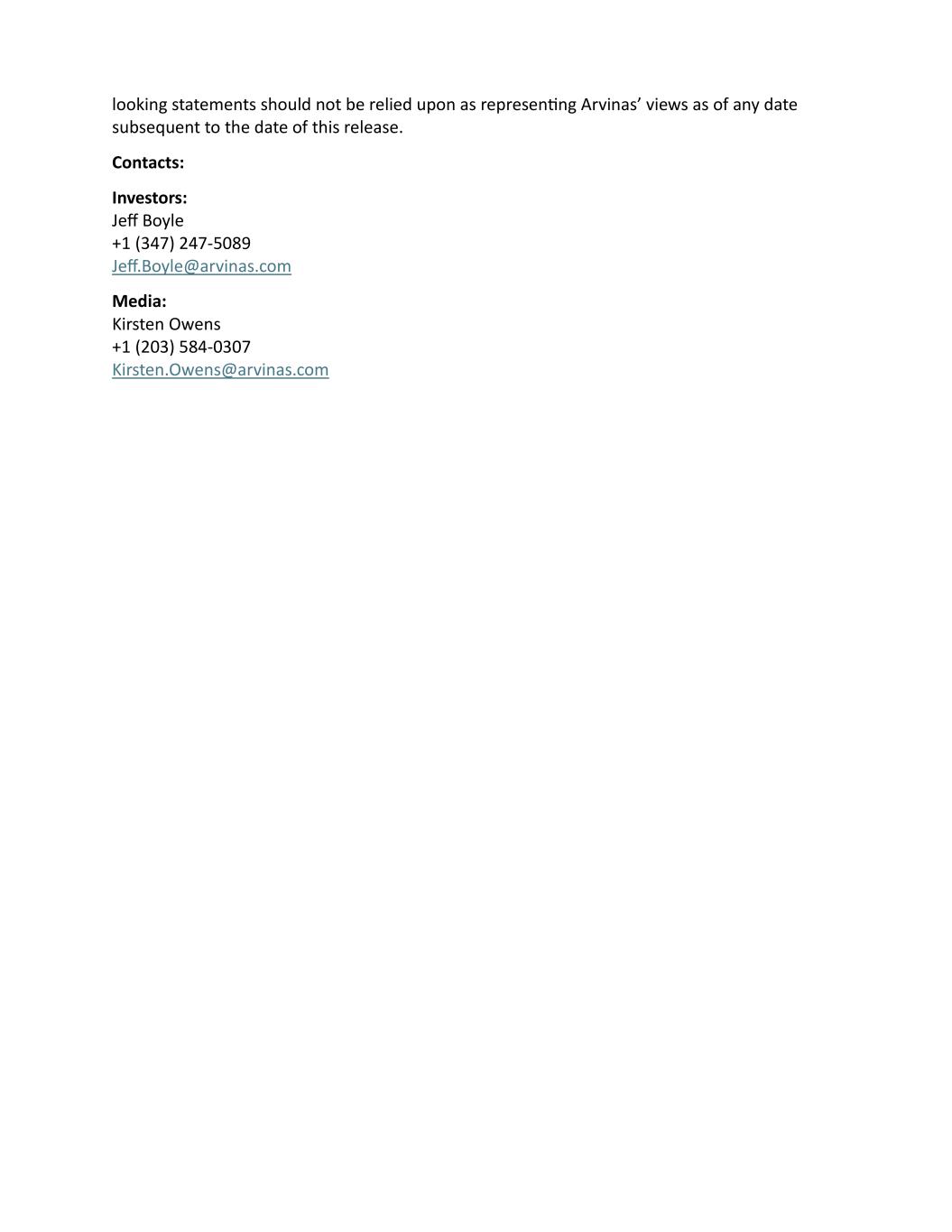 looking statements should not be relied upon as representing Arvinas’ views as of any date subsequent to the date of this release. Contacts: Investors: Jeff Boyle +1 (347) 247-5089 Jeff.Boyle@arvinas.com Media: Kirsten Owens +1 (203) 584-0307 Kirsten.Owens@arvinas.com
