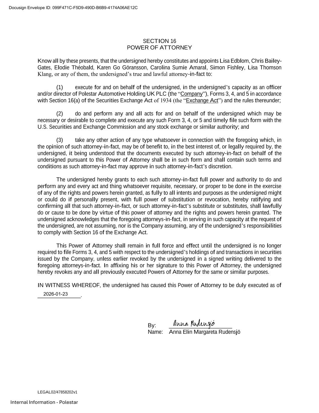 LEGAL02/47858202v1 Internal Information - Polestar SECTION 16 POWER OF ATTORNEY Know all by these presents, that the undersigned hereby constitutes and appoints Lisa Edblom, Chris Bailey- Gates, Elodie Théobald, Karen Go Göransson, Carolina Sumie Amaral, Simon Fishley, Lisa Thomson Klang, or any of them, the undersigned’s true and lawful attorney-in-fact to: (1) execute for and on behalf of the undersigned, in the undersigned’s capacity as an officer and/or director of Polestar Automotive Holding UK PLC (the “Company”), Forms 3, 4, and 5 in accordance with Section 16(a) of the Securities Exchange Act of 1934 (the “Exchange Act”) and the rules thereunder; (2) do and perform any and all acts for and on behalf of the undersigned which may be necessary or desirable to complete and execute any such Form 3, 4, or 5 and timely file such form with the U.S. Securities and Exchange Commission and any stock exchange or similar authority; and (3) take any other action of any type whatsoever in connection with the foregoing which, in the opinion of such attorney-in-fact, may be of benefit to, in the best interest of, or legally required by, the undersigned, it being understood that the documents executed by such attorney-in-fact on behalf of the undersigned pursuant to this Power of Attorney shall be in such form and shall contain such terms and conditions as such attorney-in-fact may approve in such attorney-in-fact’s discretion. The undersigned hereby grants to each such attorney-in-fact full power and authority to do and perform any and every act and thing whatsoever requisite, necessary, or proper to be done in the exercise of any of the rights and powers herein granted, as fully to all intents and purposes as the undersigned might or could do if personally present, with full power of substitution or revocation, hereby ratifying and confirming all that such attorney-in-fact, or such attorney-in-fact’s substitute or substitutes, shall lawfully do or cause to be done by virtue of this power of attorney and the rights and powers herein granted. The undersigned acknowledges that the foregoing attorneys-in-fact, in serving in such capacity at the request of the undersigned, are not assuming, nor is the Company assuming, any of the undersigned’s responsibilities to comply with Section 16 of the Exchange Act. This Power of Attorney shall remain in full force and effect until the undersigned is no longer required to file Forms 3, 4, and 5 with respect to the undersigned’s holdings of and transactions in securities issued by the Company, unless earlier revoked by the undersigned in a signed writing delivered to the foregoing attorneys-in-fact. In affixing his or her signature to this Power of Attorney, the undersigned hereby revokes any and all previously executed Powers of Attorney for the same or similar purposes. IN WITNESS WHEREOF, the undersigned has caused this Power of Attorney to be duly executed as of _______________. By: ______________________ Name: Anna Elin Margareta Rudensjö Docusign Envelope ID: 099F471C-F5D9-490D-B6B9-4174A06AE12C 2026-01-23