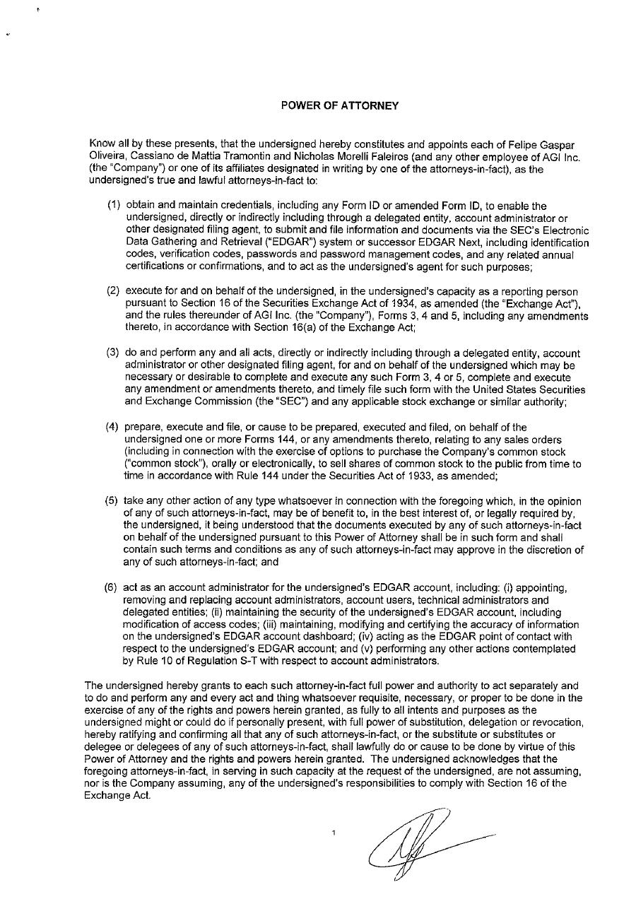 POWER OF ATTORNEY Know all by these presents, that the undersigned hereby constitutes and appoints each of Felipe Gaspar Oliveira, Cassiano de Mattia Tramontln and Nicholas Morelli Faleiros (and any other employee of AGI Inc. (the "Company") or one of its affiliates designated in writing by one of the attorneys-in-fact), as the undersigned's true and lawfui attorneys-in-fact to: (1) obtain and maintain credentials, including any Form ID or amended Form ID, to enable the undersigned, directly or indirectly including through a delegated entity, account administrator or other designated filing agent, to submit and file information and documents via the SEC's Electronic Data Gathering and Retrieval ("EDGAR") system or successor EDGAR Next, including identification codes, verification codes, passwords and password management codes, and any related annual certifications or confirmations, and to act as the undersigned's agent for such purposes; (2) execute for and on behalf of the undersigned, in the undersigned's capacity as a reporting person pursuant to Section 16 of the Securities Exchange Act of 1934, as amended (the "Exchange Act"), and the rules thereunder of AGllnc. (the "Company"), Forms 3, 4 and 5, including any amendments thereto, in accordance with Section 16(a) of the Exchange Act; (3) do and perform any and all acts, directly or indirectly including through a delegated entity, account administrator or other designated filing agent, for and on behalf of the undersigned which may be necessary or desirable to complete and execute any such Form 3, 4 or 5, complete and execute any amendment or amendments thereto, and timely file such form with the United States Securities and Exchange Commission (the "SEC") and any applicable stock exchange or similar authority; (4) prepare, execute and file, or cause to be prepared, executed and filed, on behalf of the undersigned one or more Forms 144, or any amendments thereto, relating to any sales orders (including In connection with the exercise of options to purchase the Company's common stock ("common stock"), orally or electronically, to sell shares of common stock to the public from time to time In accordance with Rule 144 under the Securities Act of 1933, as amended; (5) take any other action of any type whatsoever in connection with the foregoing which, in the opinion of any of such attorneys-In-fact, may be of benefit to, in the best interest of, or legally required by, the undersigned, It being understood that the documents executed by any of such attorneys-in-fact on behalf of the undersigned pursuant to this Power of Attorney shall be In such form and shall contain such terms and conditions as any of such attorneys-in-fact may approve in the discretion of any of such attorneys-in-fact; and (6) act as an account administrator for the undersigned's EDGAR account, Including: (I) appointing, removing and replacing account administrators, account users, technical administrators and delegated entities; (il) maintaining the security of the undersigned's EDGAR account, including modification of access codes; (iii) maintaining, modifying and certifying the accuracy of information on the undersigned's EDGAR account dashboard; (iv) acting as the EDGAR point of contact with respect to the undersigned's EDGAR account; and (v) performing any other actions contemplated by Ruie 10 of Regulation S-T with respect to account administrators. The undersigned hereby grants to each such attorney-in-fact full power and authority to act separately and to do and perform any and every act and thing whatsoever requisite, necessary, or proper to be done In the exercise of any of the rights and powers herein granted, as fully to all intents and purposes as the undersigned might or could do if personally present, with full power of substitution, delegation or revocation, hereby ratifying and confirming all that any of such attorneys-in-fact, or the substitute or substitutes or delegee or delegees of any of such attorneys-in-fact, shall lawfully do or cause to be done by virtue of this Power of Attorney and the rights and powers herein granted. The undersigned acknowledges that the foregoing attorneys-in-fact, In serving in such capacity at the request of the undersigned, are not assuming, nor is the Company assuming, any of the undersigned's responsibilities to comply with Section 16 of the Exchange Act. , , .-;':;:~;fL~~es ,0 C'J,a~ de C,tlI.l"inas -- This Power of Attorney shall remain in full force and effect until the undersigned ceases to be affiliated with the Company and is no longer required to file Forms 3, 4 and 5 with respect to the undersigned's holdings of and transactions in securities issued by the Company, unless earlier revoked by the undersigned in a signed writing delivered to the foregoing attorneys-in-fact. This Power of Attorney supersedes all other powers of attorney previously executed by the undersigned in respect of the subject matter described herein. Name: MATH IN WITNESS WHEREOF, the undersigned has caused this Power of Attorney to be executed as of March 02,2026. ReeDnneeD por seoelhanea 1 Fir..(s)S8! (1) rlATifUS GlRARDI.Doo fe. eaopinas,03/0312026. Ell test. _ _ _ a Verdade. IOCI~ISTIHA BIilJJl)l ,:u'gloIj'rn-~'-~i::':: Valor: Il$ 9,11. SelIfil5!.- Para produzir efeito no Brasil e para valer contra tercelros, devera ser vertido em vernaculo, e registrada a tradu\ao. (NSCGI C"p. - XVI/SE~Ao X/Art. 191.1) """-"" ...... ,,.-'" 2