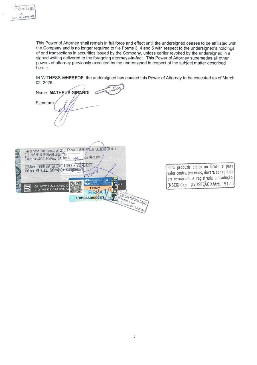 FREE TRANSLATION OF THE NOTARIZED TERMS I recognize by similarity 1 signature(s) WITHOUT ECONOMIC VALUE from (1) MATHEUS GIRARDI. I attest
