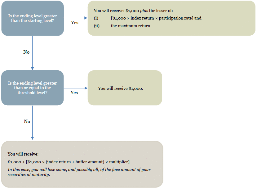 At maturity, the maturity payment amount per $1,000 face amount of securities will be determined as follows: ●If the ending level is greater than the starting level: $1,000 plus the lesser of (i) [$1,000 × index return × participation rate] and (ii) the maximum return ●If the ending level is less than or equal to the starting level, but greater than or equal to the threshold level: $1,000 ●If the ending level is less than the threshold level: $1,000 plus [$1,000 × (index return + buffer amount) × multiplier] If the ending level is less than the threshold level, you will lose some, and possibly all, of the face amount of your securities at maturity. |