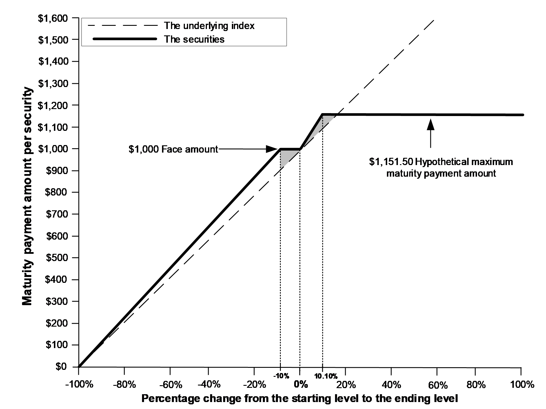 ■The appreciation potential of the securities is limited by the maximum return. The appreciation potential of the securities is limited by the maximum return. Although the participation rate provides 150% exposure to any increase in the ending level over the starting level, because any positive return on the securities will be limited to the maximum return of at least 15.15% of the face amount for the securities (assuming a maximum maturity payment amount of $1,151.50 per security), any increase in the ending level over the starting level by more than 10.10% of the starting level will not further increase the return on the securities.