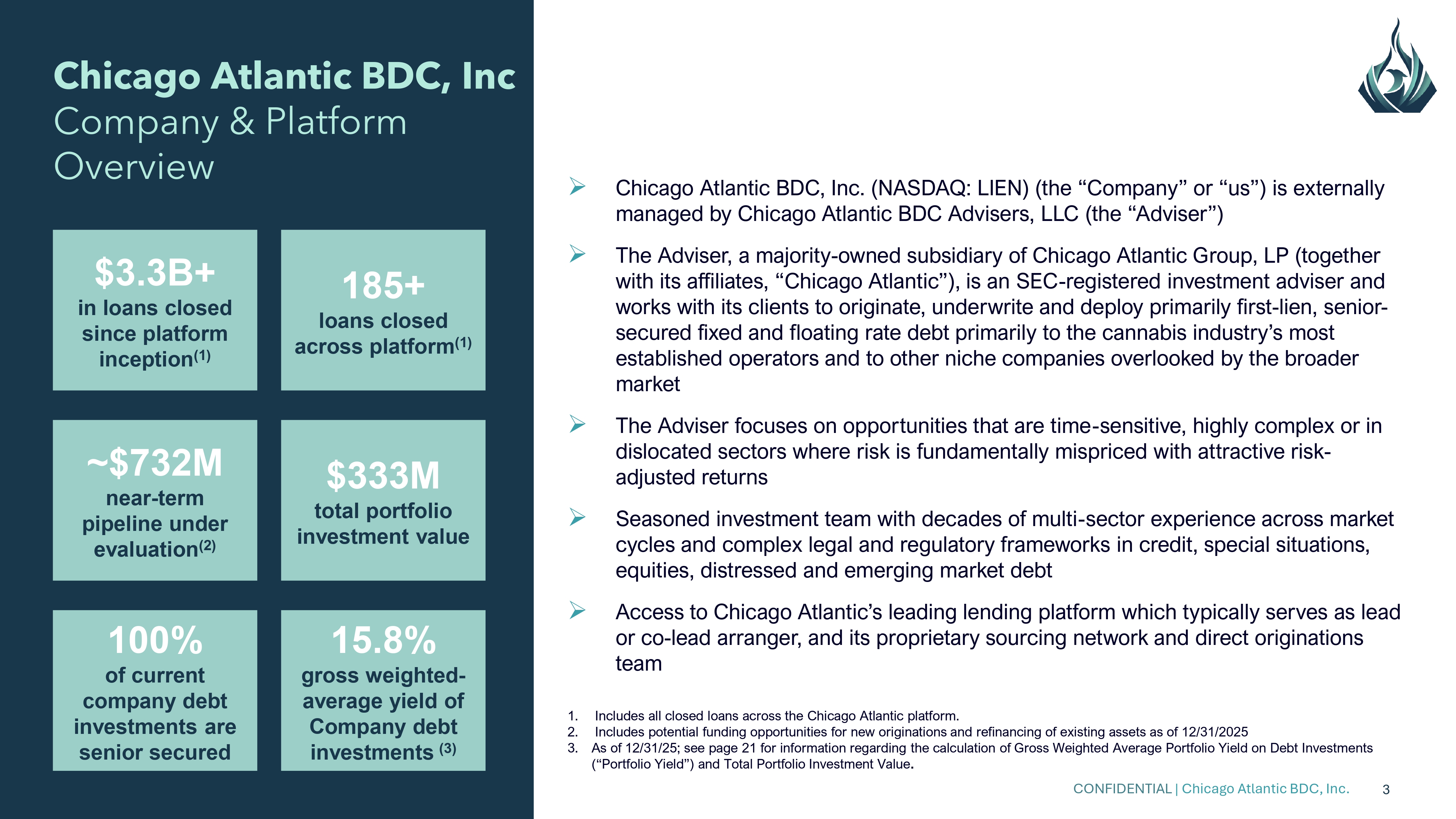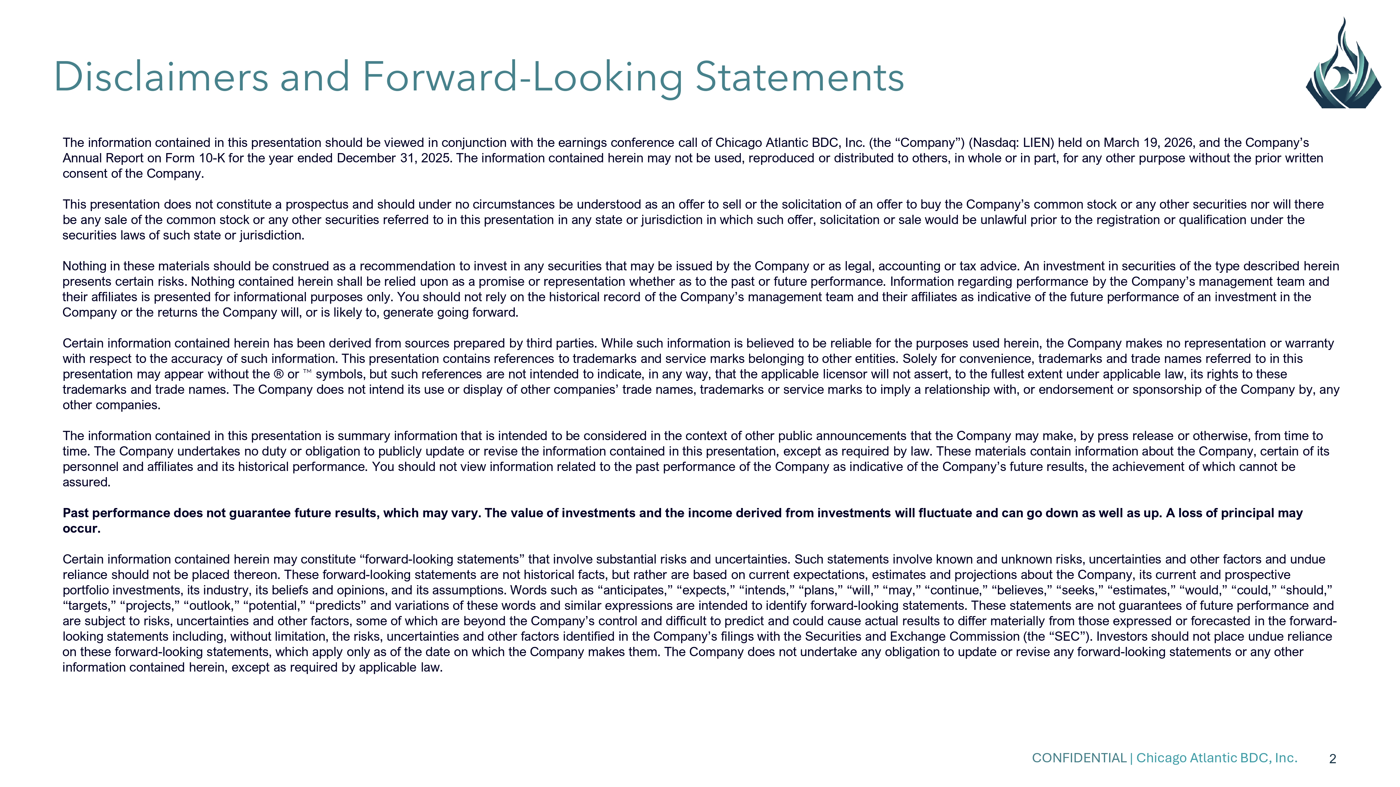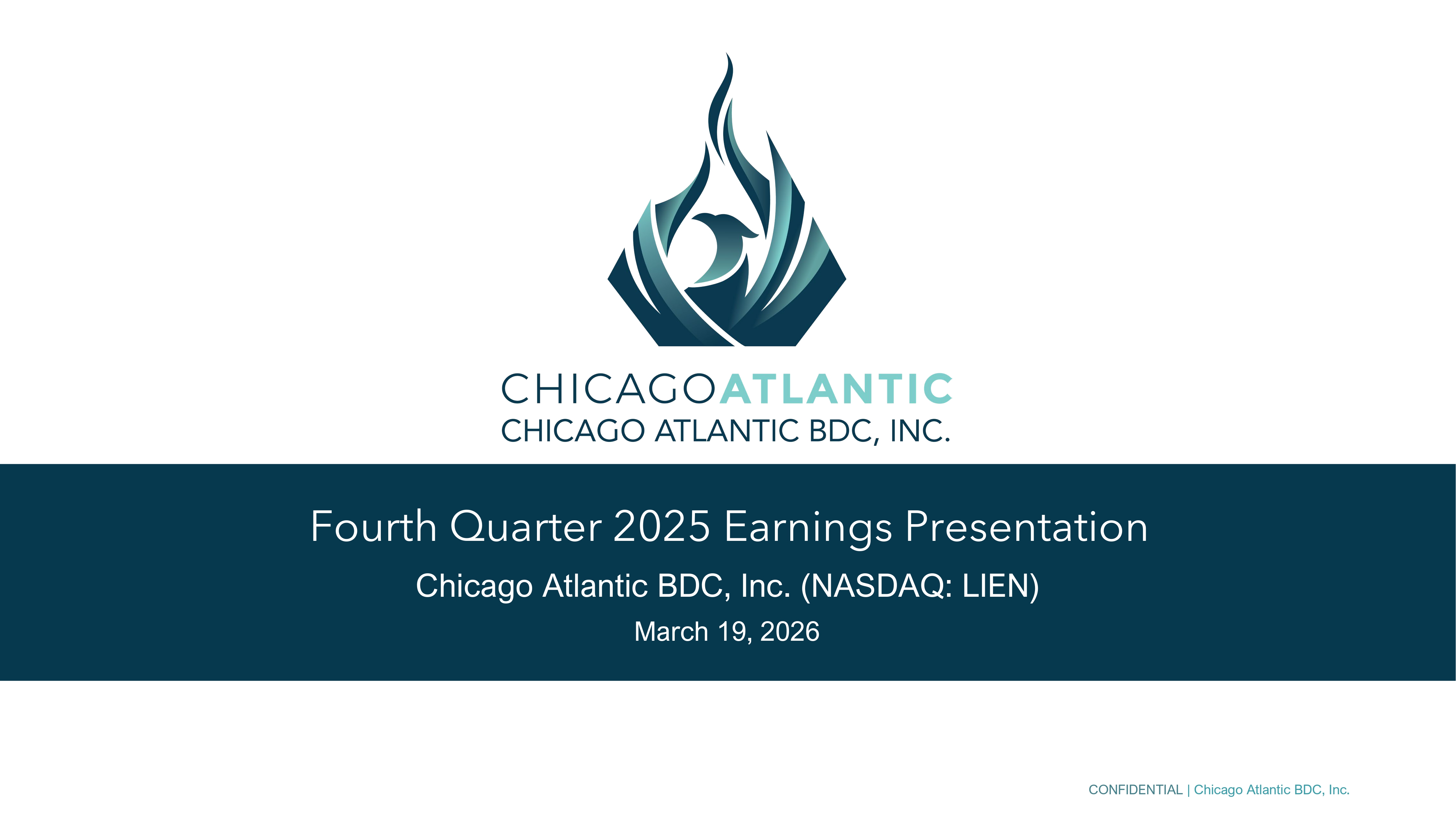 CONFIDENTIAL | Chicago Atlantic BDC, Inc. 2 The information contained in this presentation should be viewed in conjunction with the earnings conference call of Chicago A tla ntic BDC, Inc. (the “Company”) (Nasdaq: LIEN) held on March 19, 2026, and the Company’s Annual Report on Form 10 - K for the year ended December 31, 2025. The information contained herein may not be used, reproduced or distributed to others, in whole or in part, for any other purpose without the prior written consent of the Company. This presentation does not constitute a prospectus and should under no circumstances be understood as an offer to sell or the so licitation of an offer to buy the Company’s common stock or any other securities nor will there be any sale of the common stock or any other securities referred to in this presentation in any state or jurisdiction in whic h s uch offer, solicitation or sale would be unlawful prior to the registration or qualification under the securities laws of such state or jurisdiction. Nothing in these materials should be construed as a recommendation to invest in any securities that may be issued by the Comp any or as legal, accounting or tax advice. An investment in securities of the type described herein presents certain risks. Nothing contained herein shall be relied upon as a promise or representation whether as to the past o r f uture performance. Information regarding performance by the Company’s management team and their affiliates is presented for informational purposes only. You should not rely on the historical record of the Company’s man agement team and their affiliates as indicative of the future performance of an investment in the Company or the returns the Company will, or is likely to, generate going forward. Certain information contained herein has been derived from sources prepared by third parties. While such information is belie ved to be reliable for the purposes used herein, the Company makes no representation or warranty with respect to the accuracy of such information. This presentation contains references to trademarks and service marks belon gin g to other entities. Solely for convenience, trademarks and trade names referred to in this presentation may appear without the ® or symbols, but such references are not intended to indicate, in any way, that the applicable licensor will not assert, to the f ul lest extent under applicable law, its rights to these trademarks and trade names. The Company does not intend its use or display of other companies’ trade names, trademarks or ser vic e marks to imply a relationship with, or endorsement or sponsorship of the Company by, any other companies. The information contained in this presentation is summary information that is intended to be considered in the context of oth er public announcements that the Company may make, by press release or otherwise, from time to time. The Company undertakes no duty or obligation to publicly update or revise the information contained in this presentatio n, except as required by law. These materials contain information about the Company, certain of its personnel and affiliates and its historical performance. You should not view information related to the past performance of t he Company as indicative of the Company’s future results, the achievement of which cannot be assured. Past performance does not guarantee future results, which may vary. The value of investments and the income derived from inve stm ents will fluctuate and can go down as well as up. A loss of principal may occur. Certain information contained herein may constitute “forward - looking statements” that involve substantial risks and uncertaintie s. Such statements involve known and unknown risks, uncertainties and other factors and undue reliance should not be placed thereon. These forward - looking statements are not historical facts, but rather are based on curren t expectations, estimates and projections about the Company, its current and prospective portfolio investments, its industry, its beliefs and opinions, and its assumptions. Words such as “anticipates,” “expects,” “ int ends,” “plans,” “will,” “may,” “continue,” “believes,” “seeks,” “estimates,” “would,” “could,” “should,” “targets,” “projects,” “outlook,” “potential,” “predicts” and variations of these words and similar expressions are intended to identify forward - looking statements. These statements are not guarantees of future performance and are subject to risks, uncertainties and other factors, some of which are beyond the Company’s control and difficult to predic t a nd could cause actual results to differ materially from those expressed or forecasted in the forward - looking statements including, without limitation, the risks, uncertainties and other factors identified in the Company’s fili ngs with the Securities and Exchange Commission (the “SEC”). Investors should not place undue reliance on these forward - looking statements, which apply only as of the date on which the Company makes them. The Company does not under take any obligation to update or revise any forward - looking statements or any other information contained herein, except as required by applicable law. Disclaimers and Forward - Looking Statements
