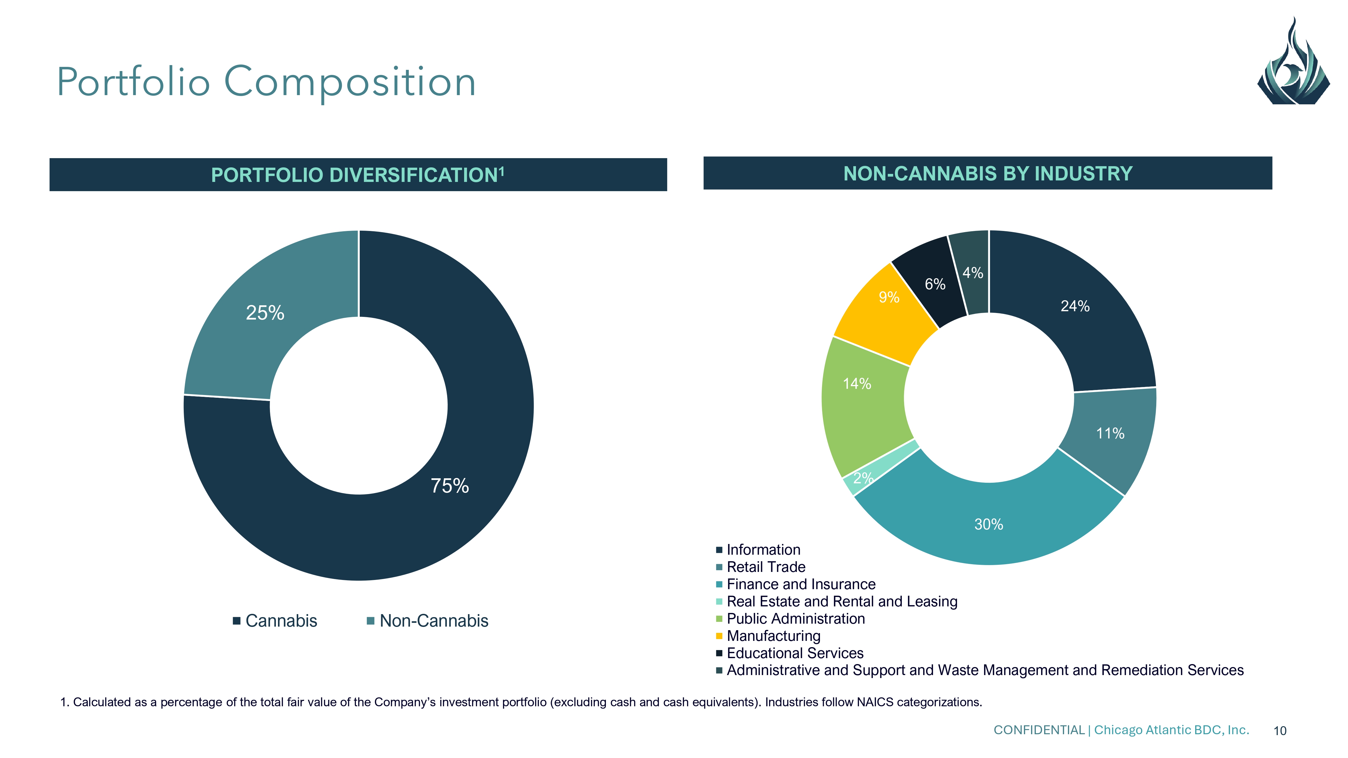 CONFIDENTIAL | Chicago Atlantic BDC, Inc. 9 Pro Forma Portfolio Investment Portfolio Highlights CHICAGO ATLANTIC BDC INC. PORTFOLIO AS OF 12/31/25 $303.4mm N ET A SSET V ALUE ( INCLUDING CASH ) $333.3mm I NVESTMENTS AT F AIR V ALUE 39 N UMBER OF P ORTFOLIO C OMPANIES 15.8% G ROSS W EIGHTED A VERAGE Y IELD OF D EBT I NVESTMENTS 1 82% I NTERNALLY A GENTED D EALS (% OF P ORTFOLIO C OMPANIES ) 0.0% N ON - ACCRUALS AT C OST (%) $7.89mm (2% of investments, at fair value) A VERAGE P OSITION S IZE 10.4% / 0.0% PIK I NTEREST (% OF T OTAL A NNUAL I NTEREST ) / P OST - ORIGINATION PIK 2 P ORTFOLIO C OMPANIES K EY F INANCIAL AND C REDIT M ETRICS 3 $82.9mm R EVENUE (M EDIAN ) $10.3mm EBITDA (M EDIAN ) 4 1.9x S R . S ECURED N ET D EBT / EBITDA ( W EIGHTED A VERAGE ) 4 2.5x I NTEREST C OVERAGE (W EIGHTED A VERAGE ) 4 Based on data for FYE 12/31/25, unless otherwise noted. Weighted average amounts are weighted by the fair market value of eac h r espective investment. See page 21 in the appendix for footnote legend.