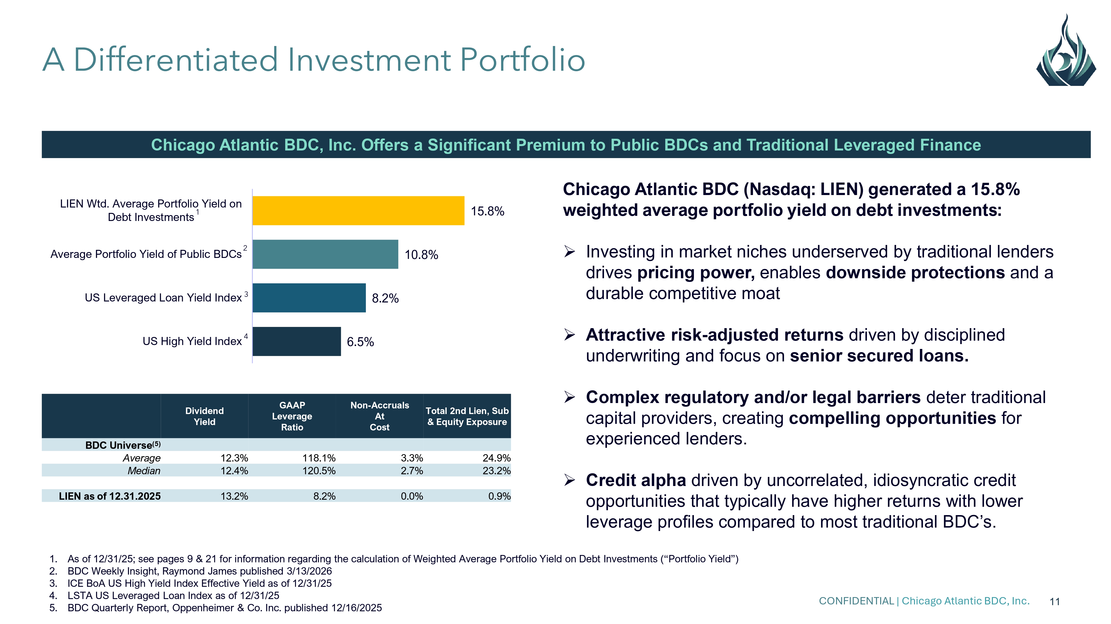CONFIDENTIAL | Chicago Atlantic BDC, Inc. 11 A Differentiated Investment Portfolio Chicago Atlantic BDC, Inc. Offers a Significant Premium to Public BDCs and Traditional Leveraged Finance Chicago Atlantic BDC (Nasdaq: LIEN) generated a 15.8% weighted average portfolio yield on debt investments: » Investing in market niches underserved by traditional lenders drives pricing power, enables downside protections and a durable competitive moat » Attractive risk - adjusted returns driven by disciplined underwriting and focus on senior secured loans. » Complex regulatory and/or legal barriers deter traditional capital providers, creating compelling opportunities for experienced lenders. » Credit alpha driven by uncorrelated, idiosyncratic credit opportunities that typically have higher returns with lower leverage profiles compared to most traditional BDC’s. 1. As of 12/31/25; see pages 9 & 21 for information regarding the calculation of Weighted Average Portfolio Yield on Debt Invest men ts (“Portfolio Yield”) 2. BDC Weekly Insight, Raymond James published 3/13/2026 3. ICE BoA US High Yield Index Effective Yield as of 12/31/25 4. LSTA US Leveraged Loan Index as of 12/31/25 5. BDC Quarterly Report, Oppenheimer & Co. Inc. published 12/16/2025 6.5% 8.2% 10.8% 15.8% US High Yield Index US Leveraged Loan Yield Index Average Portfolio Yield of Public BDCs LIEN Wtd. Average Portfolio Yield on Debt Investments 1 2 3 4 Total 2nd Lien, Sub & Equity Exposure Non - Accruals At Cost GAAP Leverage Ratio Dividend Yield BDC Universe (5) 24.9% 3.3% 118.1% 12.3% Average 23.2% 2.7% 120.5% 12.4% Median 0.9% 0.0% 8.2% 13.2% LIEN as of 12.31.2025
