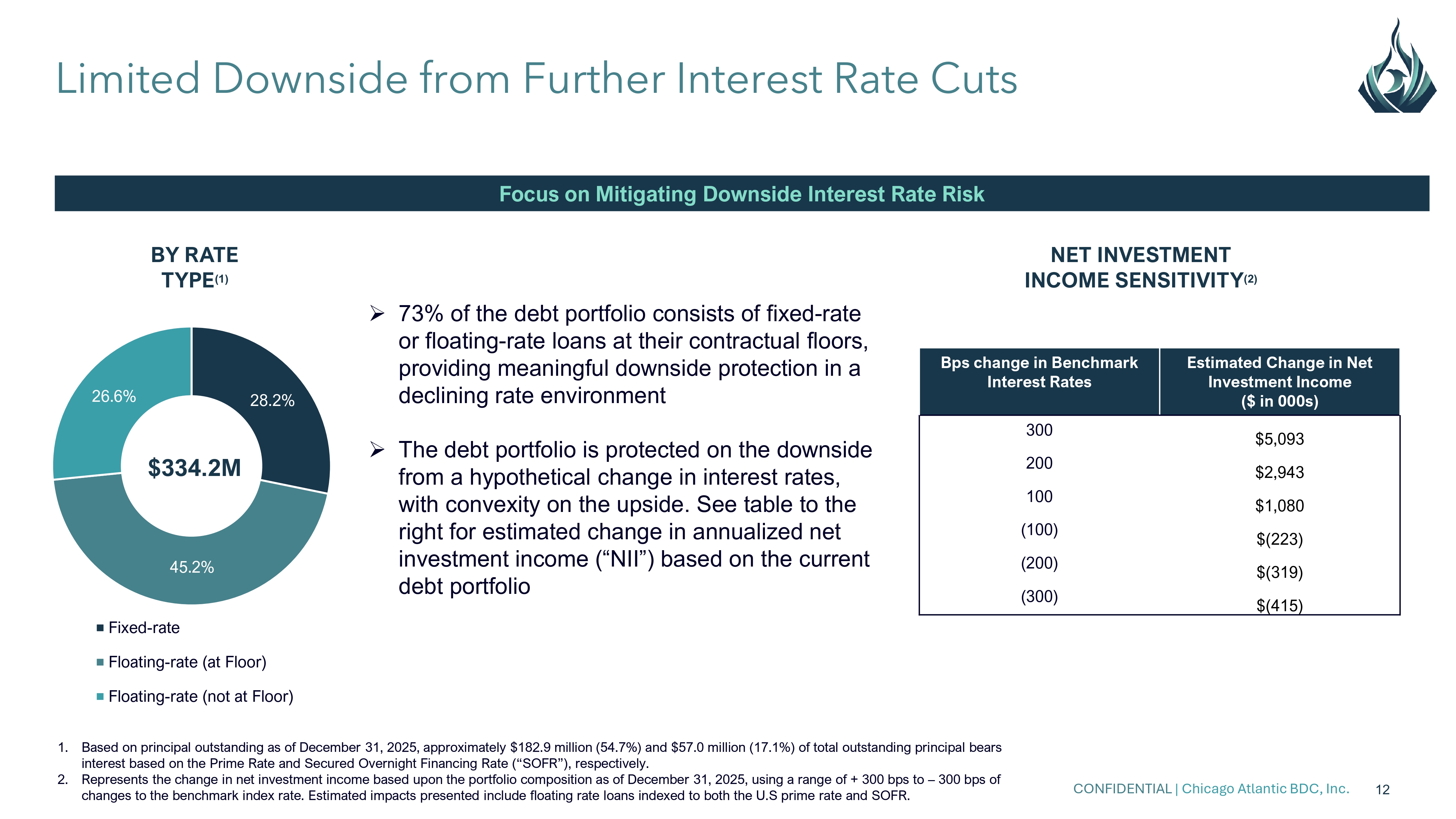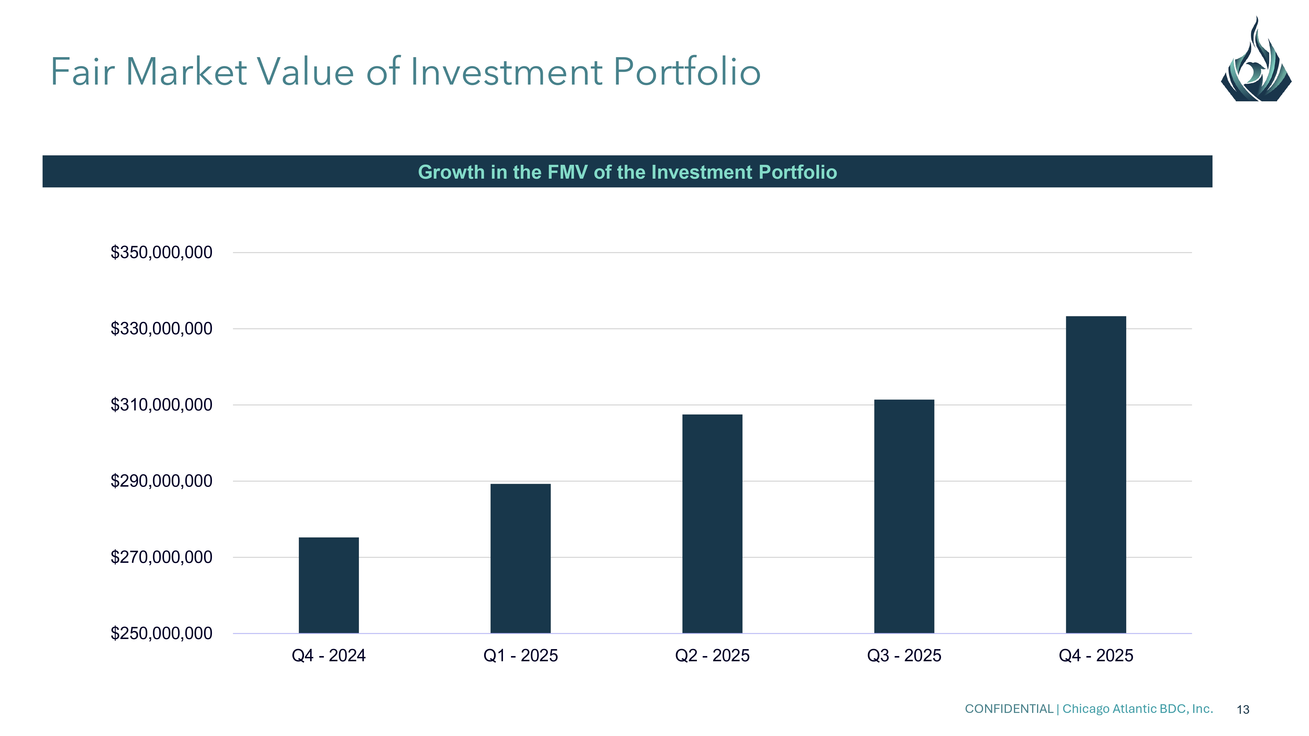 CONFIDENTIAL | Chicago Atlantic BDC, Inc. 12 Limited Downside from Further Interest Rate Cuts 1. Based on principal outstanding as of December 31, 2025, approximately $182.9 million (54.7%) and $57.0 million (17.1%) of tot al outstanding principal bears interest based on the Prime Rate and Secured Overnight Financing Rate (“SOFR”), respectively. 2. Represents the change in net investment income based upon the portfolio composition as of December 31, 2025, using a range of + 300 bps to – 300 bps of changes to the benchmark index rate. Estimated impacts presented include floating rate loans indexed to both the U.S prime ra te and SOFR. BY RATE TYPE (1) 28.2% 45.2% 26.6% Fixed-rate Floating-rate (at Floor) Floating-rate (not at Floor) $334.2M NET INVESTMENT INCOME SENSITIVITY (2) Estimated Change in Net Investment Income ($ in 000s) Bps change in Benchmark Interest Rates $5,093 300 $2,943 200 $1,080 100 $(223) (100) $(319) (200) $(415) (300) Focus on Mitigating Downside Interest Rate Risk » 73% of the debt portfolio consists of fixed - rate or floating - rate loans at their contractual floors, providing meaningful downside protection in a declining rate environment » The debt portfolio is protected on the downside from a hypothetical change in interest rates, with convexity on the upside. See table to the right for estimated change in annualized net investment income (“NII”) based on the current debt portfolio