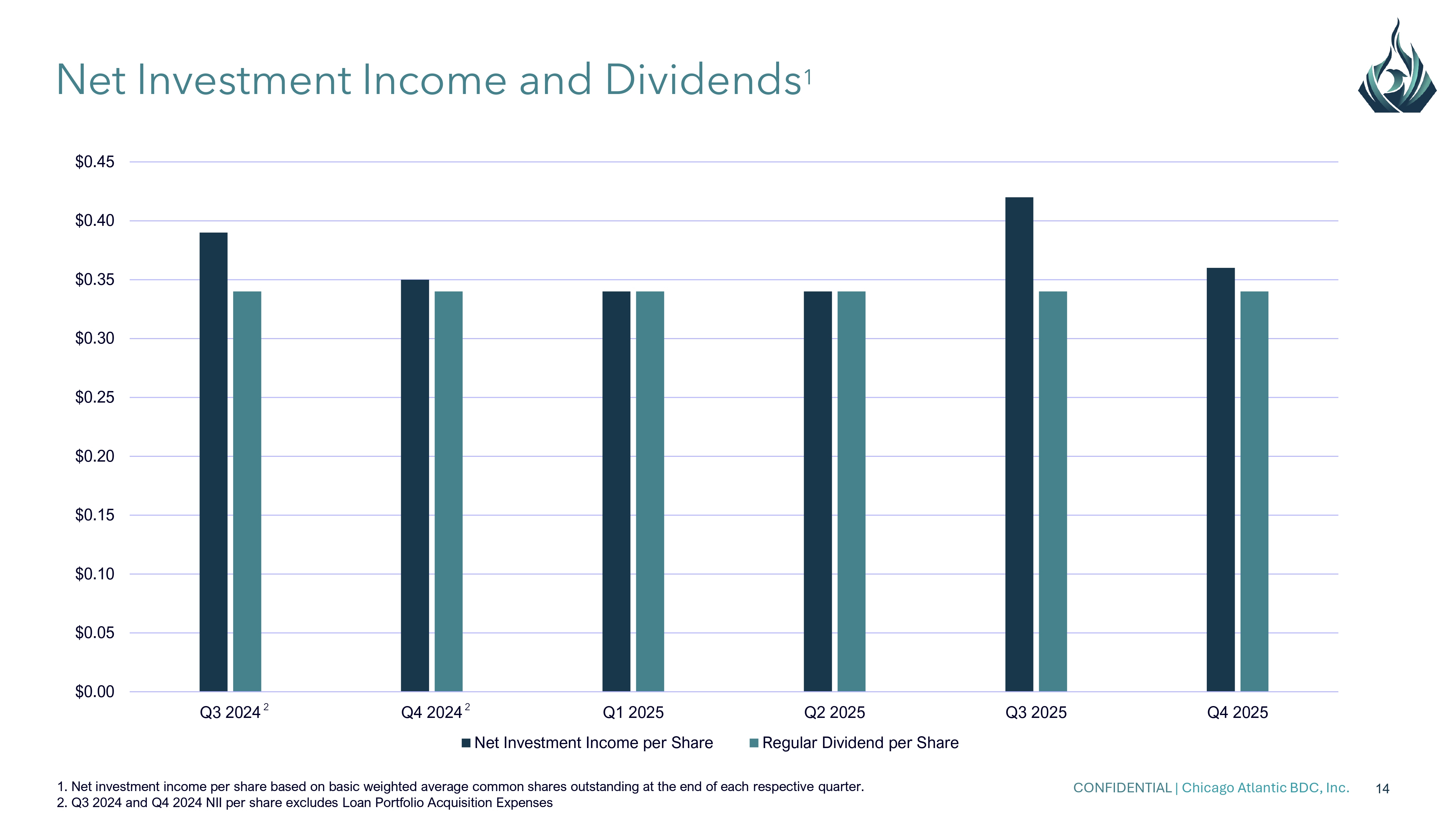 CONFIDENTIAL | Chicago Atlantic BDC, Inc. 14 $0.00 $0.05 $0.10 $0.15 $0.20 $0.25 $0.30 $0.35 $0.40 $0.45 Q3 2024 Q4 2024 Q1 2025 Q2 2025 Q3 2025 Q4 2025 Net Investment Income per Share Regular Dividend per Share 1. Net investment income per share based on basic weighted average common shares outstanding at the end of each respective qu art er. 2. Q3 2024 and Q4 2024 NII per share excludes Loan Portfolio Acquisition Expenses Net Investment Income and Dividends 1 2 2