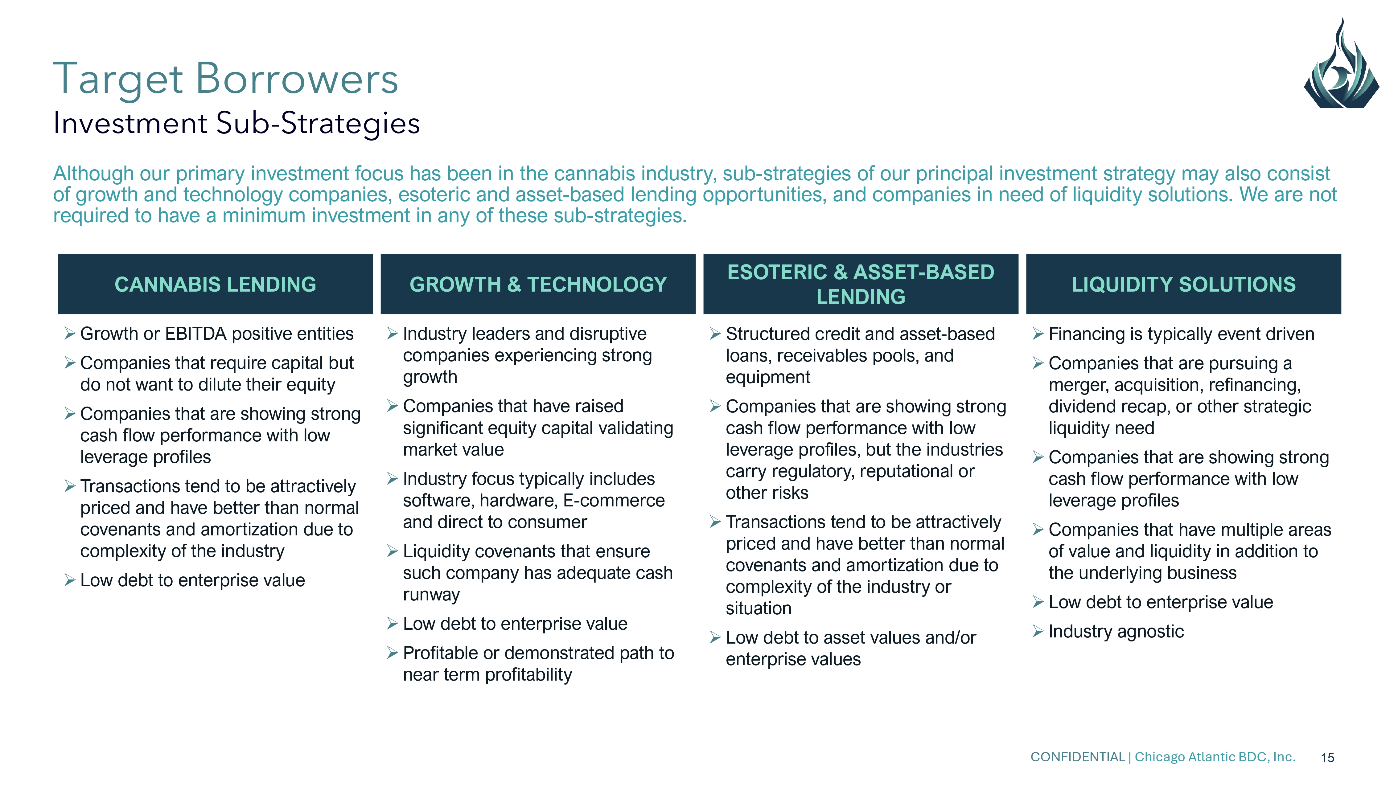 CONFIDENTIAL | Chicago Atlantic BDC, Inc. 15 Target Borrowers Investment Sub - Strategies LIQUIDITY SOLUTIONS ESOTERIC & ASSET - BASED LENDING GROWTH & TECHNOLOGY CANNABIS LENDING » Financing is typically event driven » Companies that are pursuing a merger, acquisition, refinancing, dividend recap, or other strategic liquidity need » Companies that are showing strong cash flow performance with low leverage profiles » Companies that have multiple areas of value and liquidity in addition to the underlying business » Low debt to enterprise value » Industry agnostic » Structured credit and asset - based loans, receivables pools, and equipment » Companies that are showing strong cash flow performance with low leverage profiles, but the industries carry regulatory, reputational or other risks » Transactions tend to be attractively priced and have better than normal covenants and amortization due to complexity of the industry or situation » Low debt to asset values and/or enterprise values » Industry leaders and disruptive companies experiencing strong growth » Companies that have raised significant equity capital validating market value » Industry focus typically includes software, hardware, E - commerce and direct to consumer » Liquidity covenants that ensure such company has adequate cash runway » Low debt to enterprise value » Profitable or demonstrated path to near term profitability » Growth or EBITDA positive entities » Companies that require capital but do not want to dilute their equity » Companies that are showing strong cash flow performance with low leverage profiles » Transactions tend to be attractively priced and have better than normal covenants and amortization due to complexity of the industry » Low debt to enterprise value Although our primary investment focus has been in the cannabis industry, sub - strategies of our principal investment strategy may also consist of growth and technology companies, esoteric and asset - based lending opportunities, and companies in need of liquidity solutions . We are not required to have a minimum investment in any of these sub - strategies.