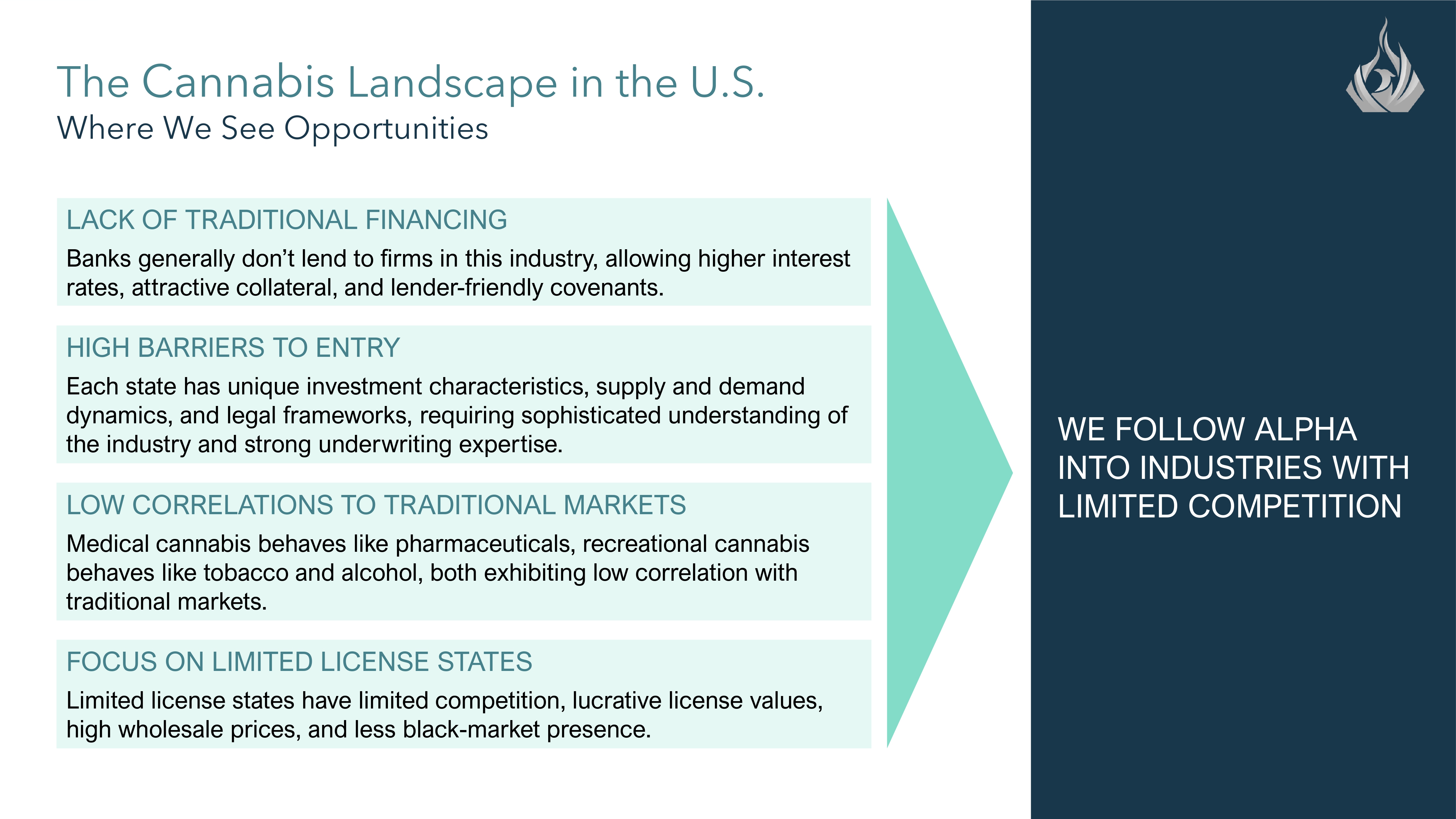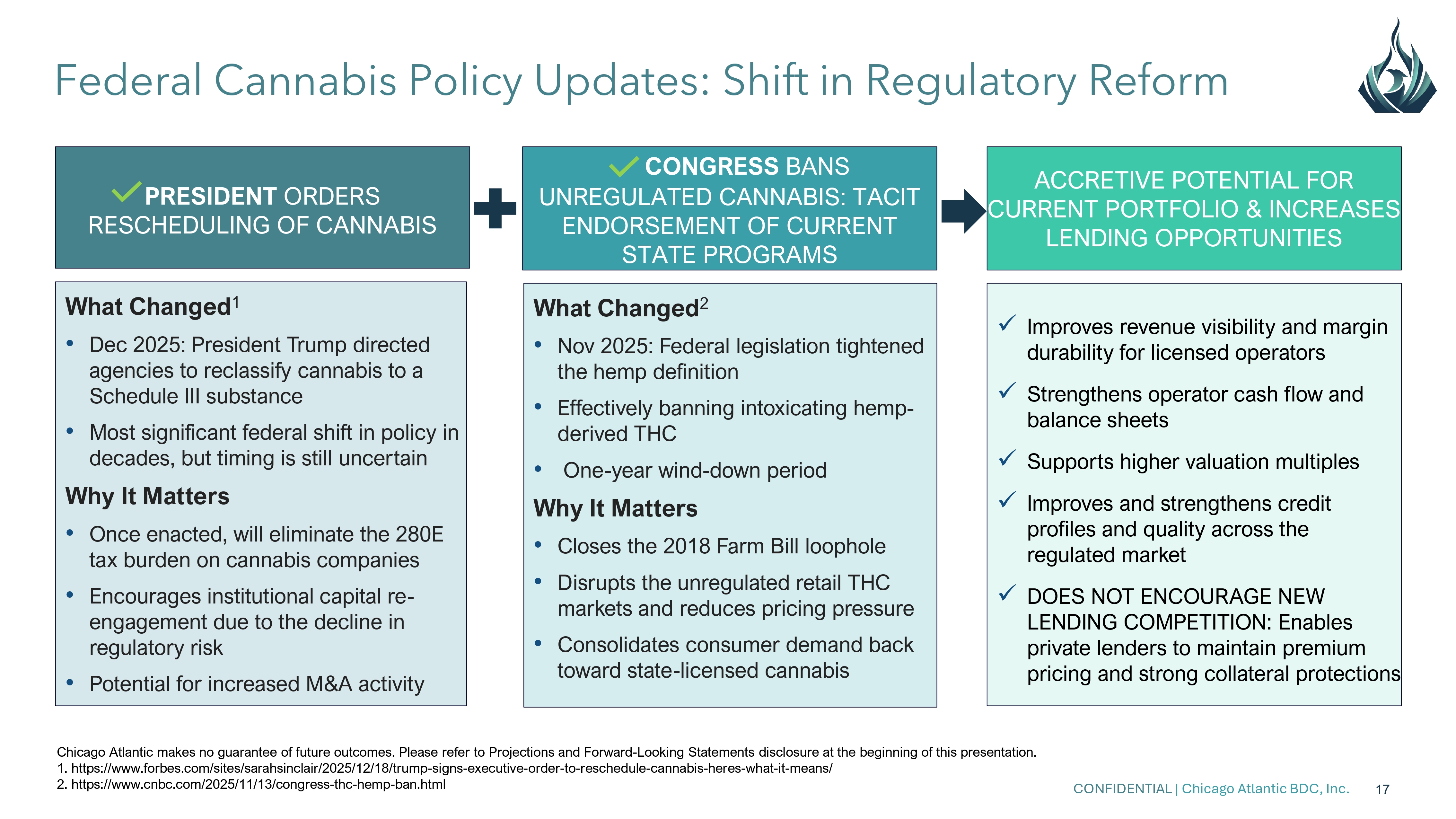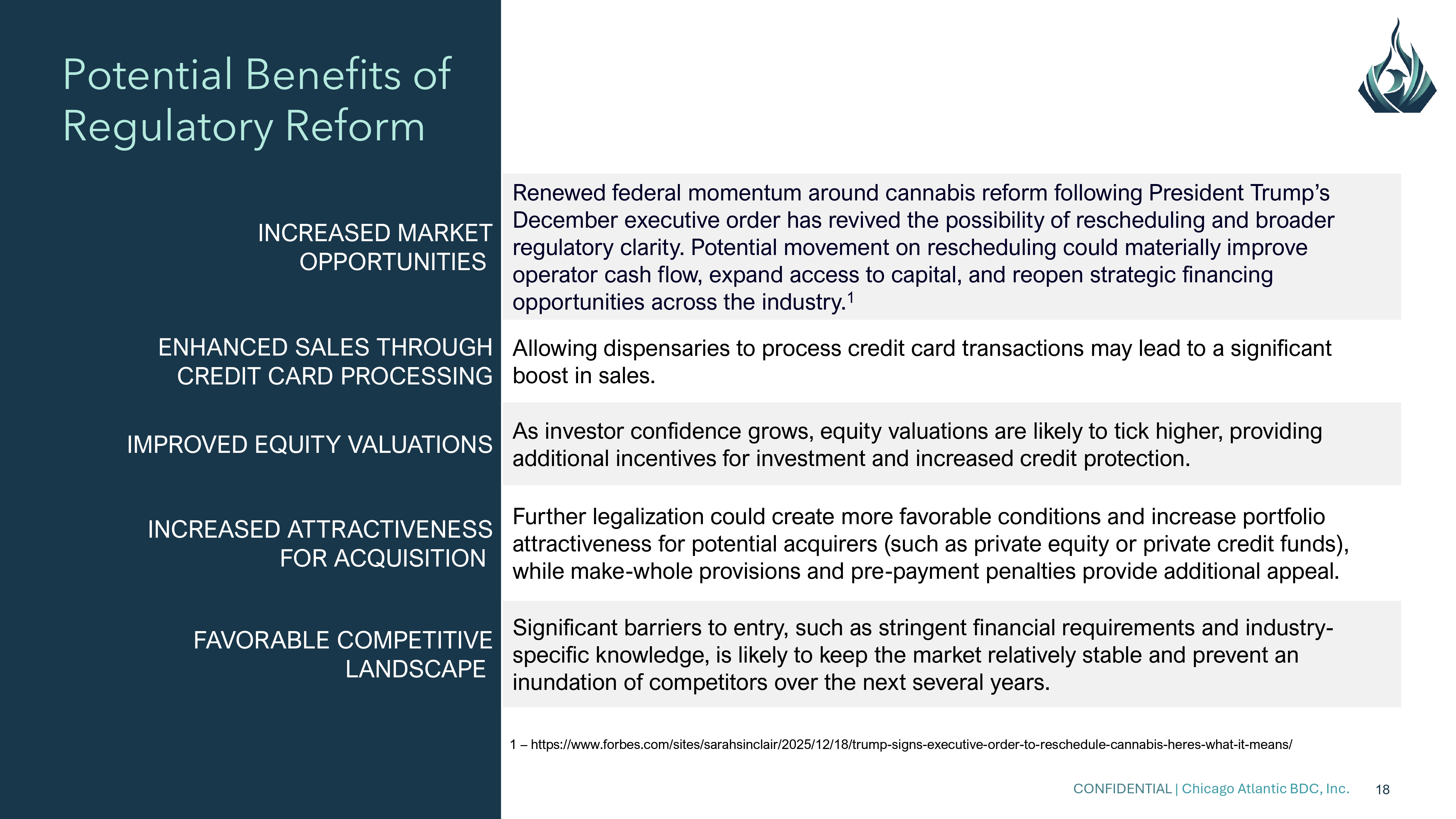 CONFIDENTIAL | Chicago Atlantic BDC, Inc. 17 Federal Cannabis Policy Updates: Shift in Regulatory Reform Chicago Atlantic makes no guarantee of future outcomes. Please refer to Projections and Forward - Looking Statements disclosure at the beginning of this presentation. 1. https://www.forbes.com/sites/sarahsinclair/2025/12/18/trump - signs - executive - order - to - reschedule - cannabis - heres - what - it - means/ 2. https://www.cnbc.com/2025/11/13/congress - thc - hemp - ban.html PRESIDENT ORDERS RESCHEDULING OF CANNABIS CONGRESS BANS UNREGULATED CANNABIS: TACIT ENDORSEMENT OF CURRENT STATE PROGRAMS What Changed 1 • Dec 2025: President Trump directed agencies to reclassify cannabis to a Schedule III substance • Most significant federal shift in policy in decades, but timing is still uncertain Why It Matters • Once enacted, will eliminate the 280E tax burden on cannabis companies • Encourages institutional capital re - engagement due to the decline in regulatory risk • Potential for increased M&A activity What Changed 2 • Nov 2025: Federal legislation tightened the hemp definition • Effectively banning intoxicating hemp - derived THC • One - year wind - down period Why It Matters • Closes the 2018 Farm Bill loophole • Disrupts the unregulated retail THC markets and reduces pricing pressure • Consolidates consumer demand back toward state - licensed cannabis ACCRETIVE POTENTIAL FOR CURRENT PORTFOLIO & INCREASES LENDING OPPORTUNITIES x Improves revenue visibility and margin durability for licensed operators x Strengthens operator cash flow and balance sheets x Supports higher valuation multiples x Improves and strengthens credit profiles and quality across the regulated market x DOES NOT ENCOURAGE NEW LENDING COMPETITION: Enables private lenders to maintain premium pricing and strong collateral protections
