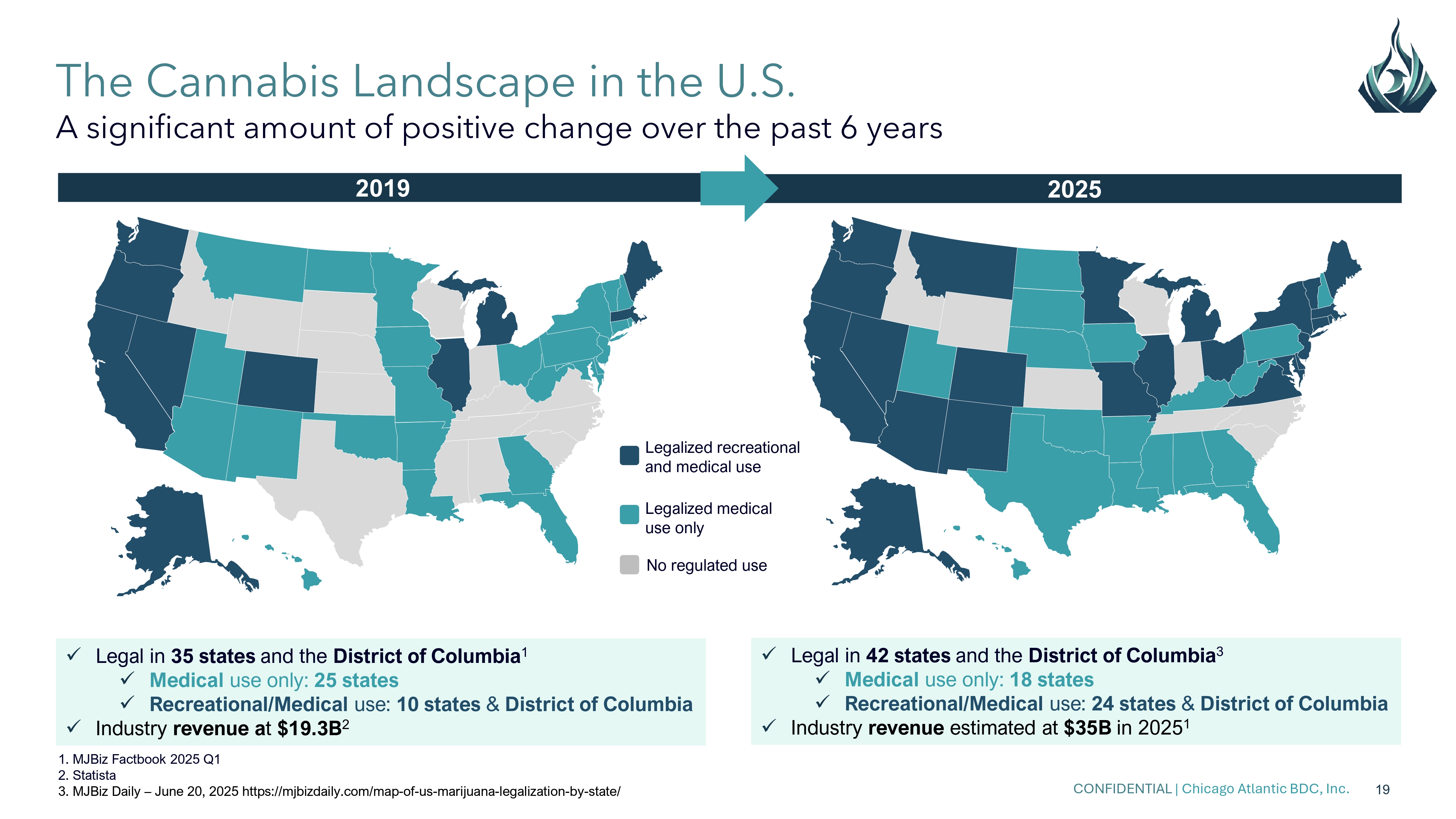 CONFIDENTIAL | Chicago Atlantic BDC, Inc. 18 Potential Benefits of Regulatory Reform Renewed federal momentum around cannabis reform following President Trump’s December executive order has revived the possibility of rescheduling and broader regulatory clarity. Potential movement on rescheduling could materially improve operator cash flow, expand access to capital, and reopen strategic financing opportunities across the industry. 1 INCREASED MARKET OPPORTUNITIES Allowing dispensaries to process credit card transactions may lead to a significant boost in sales. ENHANCED SALES THROUGH CREDIT CARD PROCESSING As investor confidence grows, equity valuations are likely to tick higher, providing additional incentives for investment and increased credit protection. IMPROVED EQUITY VALUATIONS Further legalization could create more favorable conditions and increase portfolio attractiveness for potential acquirers (such as private equity or private credit funds), while make - whole provisions and pre - payment penalties provide additional appeal. INCREASED ATTRACTIVENESS FOR ACQUISITION Significant barriers to entry, such as stringent financial requirements and industry - specific knowledge, is likely to keep the market relatively stable and prevent an inundation of competitors over the next several years. FAVORABLE COMPETITIVE LANDSCAPE 1 – https://www.forbes.com/sites/sarahsinclair/2025/12/18/trump - signs - executive - order - to - reschedule - cannabis - heres - what - it - means /