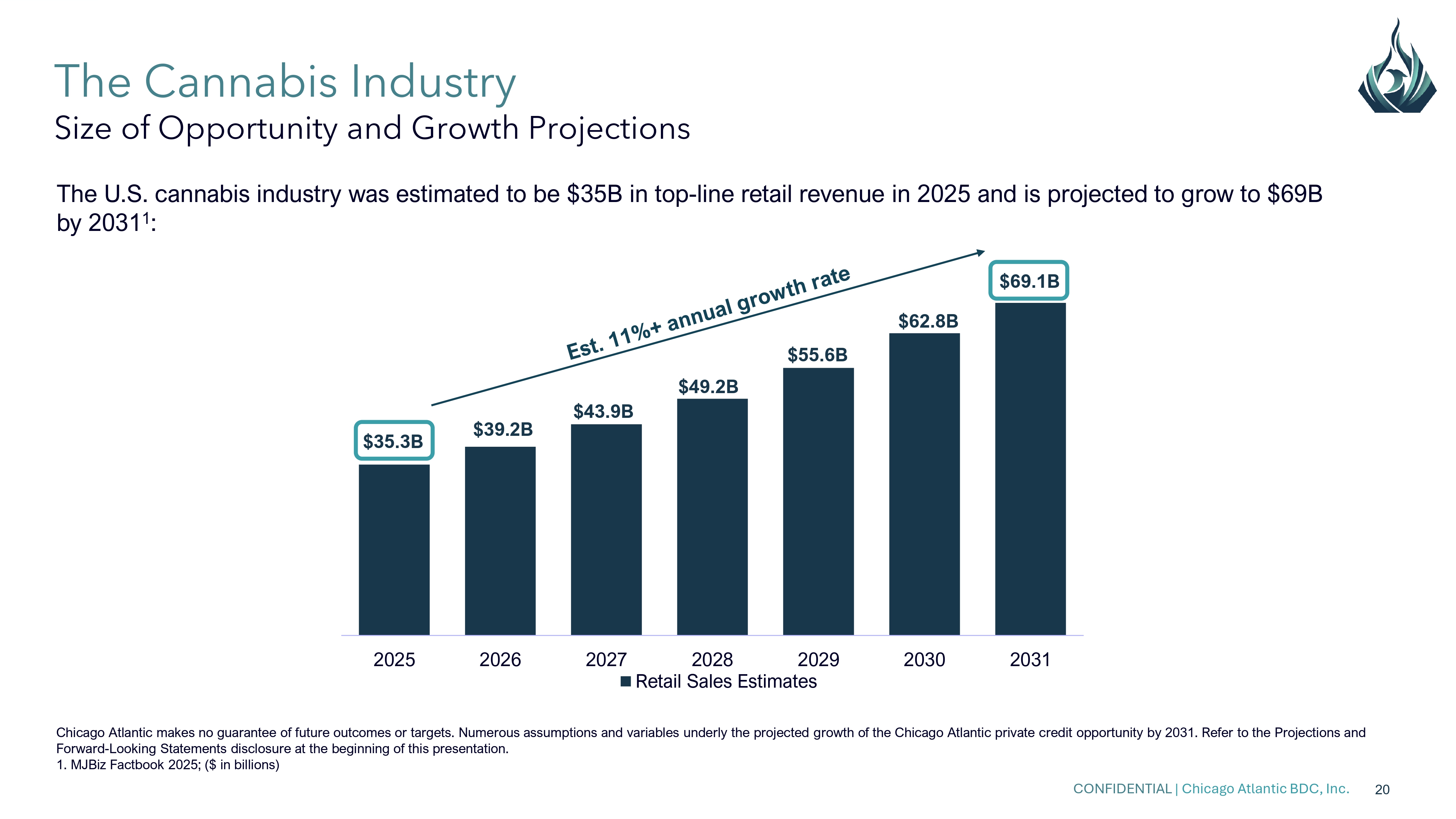 CONFIDENTIAL | Chicago Atlantic BDC, Inc. 20 The Cannabis Industry Size of Opportunity and Growth Projections Chicago Atlantic makes no guarantee of future outcomes or targets. Numerous assumptions and variables underly the projected g row th of the Chicago Atlantic private credit opportunity by 2031. Refer to the Projections and Forward - Looking Statements disclosure at the beginning of this presentation. 1. MJBiz Factbook 2025; ($ in billions) The U.S. cannabis industry was estimated to be $35B in top - line retail revenue in 2025 and is projected to grow to $69B by 2031 1 : 2025 2026 2027 2028 2029 2030 2031 Retail Sales Estimates $35.3B $39.2B $43.9B $49.2B $55.6B $62.8B $69.1B