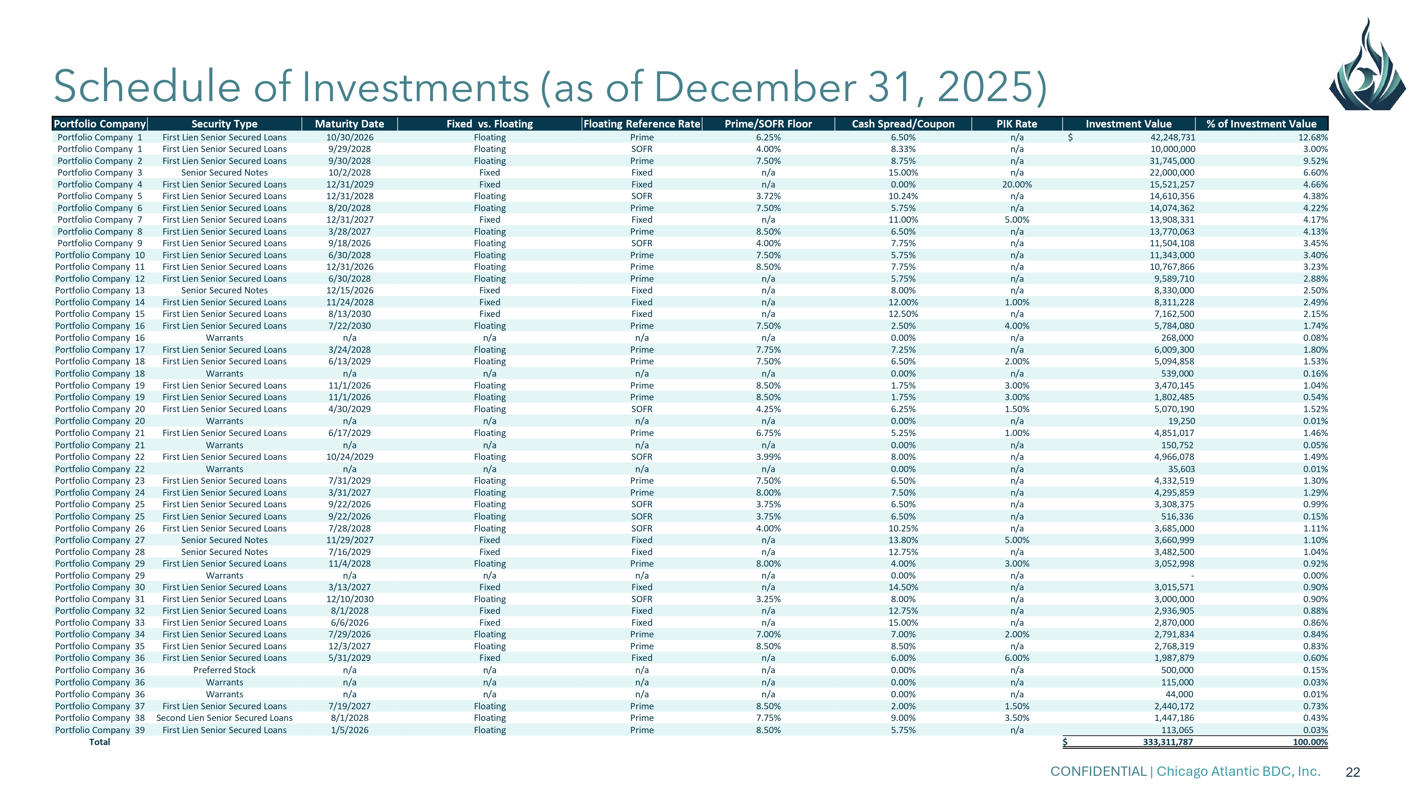 CONFIDENTIAL | Chicago Atlantic BDC, Inc. 22 Schedule of Investments (as of December 31, 2025) % of Investment Value Investment Value PIK Rate Cash Spread/Coupon Prime/SOFR Floor Floating Reference Rate Fixed vs. Floating Maturity Date Security Type Portfolio Company 12.68% $ 42,248,731 n/a 6.50% 6.25% Prime Floating 10/30/2026 First Lien Senior Secured Loans Portfolio Company 1 3.00% 10,000,000 n/a 8.33% 4.00% SOFR Floating 9/29/2028 First Lien Senior Secured Loans Portfolio Company 1 9.52% 31,745,000 n/a 8.75% 7.50% Prime Floating 9/30/2028 First Lien Senior Secured Loans Portfolio Company 2 6.60% 22,000,000 n/a 15.00% n/a Fixed Fixed 10/2/2028 Senior Secured Notes Portfolio Company 3 4.66% 15,521,257 20.00% 0.00% n/a Fixed Fixed 12/31/2029 First Lien Senior Secured Loans Portfolio Company 4 4.38% 14,610,356 n/a 10.24% 3.72% SOFR Floating 12/31/2028 First Lien Senior Secured Loans Portfolio Company 5 4.22% 14,074,362 n/a 5.75% 7.50% Prime Floating 8/20/2028 First Lien Senior Secured Loans Portfolio Company 6 4.17% 13,908,331 5.00% 11.00% n/a Fixed Fixed 12/31/2027 First Lien Senior Secured Loans Portfolio Company 7 4.13% 13,770,063 n/a 6.50% 8.50% Prime Floating 3/28/2027 First Lien Senior Secured Loans Portfolio Company 8 3.45% 11,504,108 n/a 7.75% 4.00% SOFR Floating 9/18/2026 First Lien Senior Secured Loans Portfolio Company 9 3.40% 11,343,000 n/a 5.75% 7.50% Prime Floating 6/30/2028 First Lien Senior Secured Loans Portfolio Company 10 3.23% 10,767,866 n/a 7.75% 8.50% Prime Floating 12/31/2026 First Lien Senior Secured Loans Portfolio Company 11 2.88% 9,589,710 n/a 5.75% n/a Prime Floating 6/30/2028 First Lien Senior Secured Loans Portfolio Company 12 2.50% 8,330,000 n/a 8.00% n/a Fixed Fixed 12/15/2026 Senior Secured Notes Portfolio Company 13 2.49% 8,311,228 1.00% 12.00% n/a Fixed Fixed 11/24/2028 First Lien Senior Secured Loans Portfolio Company 14 2.15% 7,162,500 n/a 12.50% n/a Fixed Fixed 8/13/2030 First Lien Senior Secured Loans Portfolio Company 15 1.74% 5,784,080 4.00% 2.50% 7.50% Prime Floating 7/22/2030 First Lien Senior Secured Loans Portfolio Company 16 0.08% 268,000 n/a 0.00% n/a n/a n/a n/a Warrants Portfolio Company 16 1.80% 6,009,300 n/a 7.25% 7.75% Prime Floating 3/24/2028 First Lien Senior Secured Loans Portfolio Company 17 1.53% 5,094,858 2.00% 6.50% 7.50% Prime Floating 6/13/2029 First Lien Senior Secured Loans Portfolio Company 18 0.16% 539,000 n/a 0.00% n/a n/a n/a n/a Warrants Portfolio Company 18 1.04% 3,470,145 3.00% 1.75% 8.50% Prime Floating 11/1/2026 First Lien Senior Secured Loans Portfolio Company 19 0.54% 1,802,485 3.00% 1.75% 8.50% Prime Floating 11/1/2026 First Lien Senior Secured Loans Portfolio Company 19 1.52% 5,070,190 1.50% 6.25% 4.25% SOFR Floating 4/30/2029 First Lien Senior Secured Loans Portfolio Company 20 0.01% 19,250 n/a 0.00% n/a n/a n/a n/a Warrants Portfolio Company 20 1.46% 4,851,017 1.00% 5.25% 6.75% Prime Floating 6/17/2029 First Lien Senior Secured Loans Portfolio Company 21 0.05% 150,752 n/a 0.00% n/a n/a n/a n/a Warrants Portfolio Company 21 1.49% 4,966,078 n/a 8.00% 3.99% SOFR Floating 10/24/2029 First Lien Senior Secured Loans Portfolio Company 22 0.01% 35,603 n/a 0.00% n/a n/a n/a n/a Warrants Portfolio Company 22 1.30% 4,332,519 n/a 6.50% 7.50% Prime Floating 7/31/2029 First Lien Senior Secured Loans Portfolio Company 23 1.29% 4,295,859 n/a 7.50% 8.00% Prime Floating 3/31/2027 First Lien Senior Secured Loans Portfolio Company 24 0.99% 3,308,375 n/a 6.50% 3.75% SOFR Floating 9/22/2026 First Lien Senior Secured Loans Portfolio Company 25 0.15% 516,336 n/a 6.50% 3.75% SOFR Floating 9/22/2026 First Lien Senior Secured Loans Portfolio Company 25 1.11% 3,685,000 n/a 10.25% 4.00% SOFR Floating 7/28/2028 First Lien Senior Secured Loans Portfolio Company 26 1.10% 3,660,999 5.00% 13.80% n/a Fixed Fixed 11/29/2027 Senior Secured Notes Portfolio Company 27 1.04% 3,482,500 n/a 12.75% n/a Fixed Fixed 7/16/2029 Senior Secured Notes Portfolio Company 28 0.92% 3,052,998 3.00% 4.00% 8.00% Prime Floating 11/4/2028 First Lien Senior Secured Loans Portfolio Company 29 0.00% - n/a 0.00% n/a n/a n/a n/a Warrants Portfolio Company 29 0.90% 3,015,571 n/a 14.50% n/a Fixed Fixed 3/13/2027 First Lien Senior Secured Loans Portfolio Company 30 0.90% 3,000,000 n/a 8.00% 3.25% SOFR Floating 12/10/2030 First Lien Senior Secured Loans Portfolio Company 31 0.88% 2,936,905 n/a 12.75% n/a Fixed Fixed 8/1/2028 First Lien Senior Secured Loans Portfolio Company 32 0.86% 2,870,000 n/a 15.00% n/a Fixed Fixed 6/6/2026 First Lien Senior Secured Loans Portfolio Company 33 0.84% 2,791,834 2.00% 7.00% 7.00% Prime Floating 7/29/2026 First Lien Senior Secured Loans Portfolio Company 34 0.83% 2,768,319 n/a 8.50% 8.50% Prime Floating 12/3/2027 First Lien Senior Secured Loans Portfolio Company 35 0.60% 1,987,879 6.00% 6.00% n/a Fixed Fixed 5/31/2029 First Lien Senior Secured Loans Portfolio Company 36 0.15% 500,000 n/a 0.00% n/a n/a n/a n/a Preferred Stock Portfolio Company 36 0.03% 115,000 n/a 0.00% n/a n/a n/a n/a Warrants Portfolio Company 36 0.01% 44,000 n/a 0.00% n/a n/a n/a n/a Warrants Portfolio Company 36 0.73% 2,440,172 1.50% 2.00% 8.50% Prime Floating 7/19/2027 First Lien Senior Secured Loans Portfolio Company 37 0.43% 1,447,186 3.50% 9.00% 7.75% Prime Floating 8/1/2028 Second Lien Senior Secured Loans Portfolio Company 38 0.03% 113,065 n/a 5.75% 8.50% Prime Floating 1/5/2026 First Lien Senior Secured Loans Portfolio Company 39 100.00% $ 333,311,787 Total