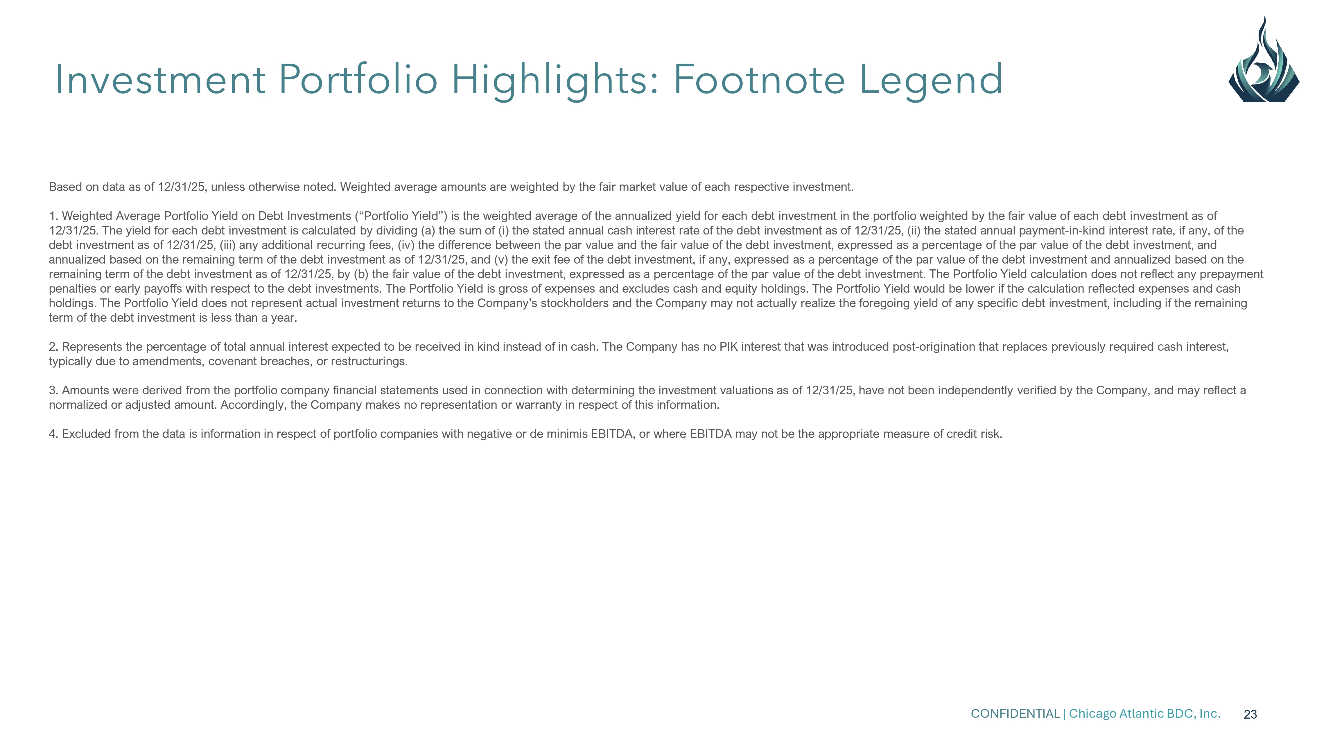 CONFIDENTIAL | Chicago Atlantic BDC, Inc. 23 Pro Forma Portfolio Investment Portfolio Highlights: Footnote Legend Based on data as of 12/31/25, unless otherwise noted. Weighted average amounts are weighted by the fair market value of each res pective investment. 1. Weighted Average Portfolio Yield on Debt Investments (“Portfolio Yield”) is the weighted average of the annualized yield f or each debt investment in the portfolio weighted by the fair value of each debt investment as of 12/31/25. The yield for each debt investment is calculated by dividing (a) the sum of ( i ) the stated annual cash interest rate of the debt investment as of 12/31/25, (ii) the stated annual payment - in - kind interest ra te, if any, of the debt investment as of 12/31/25, (iii) any additional recurring fees, (iv) the difference between the par value and the fair value of the debt investment, expressed as a percentage of the par value of th e debt investment, and annualized based on the remaining term of the debt investment as of 12/31/25, and (v) the exit fee of the debt investment, if an y, expressed as a percentage of the par value of the debt investment and annualized based on the remaining term of the debt investment as of 12/31/25, by (b) the fair value of the debt investment, expressed as a percentage of the par value of the debt investment. The Portfolio Yield calculation does not reflect any prepayment penalties or early payoffs with respect to the debt investments. The Portfolio Yield is gross of expenses and excludes cash a nd equity holdings. The Portfolio Yield would be lower if the calculation reflected expenses and cash holdings. The Portfolio Yield does not represent actual investment returns to the Company’s stockholders and the Company may not actually realize the foregoing yield of any specific debt investment, including if the remaining term of the debt investment is less than a year. 2. Represents the percentage of total annual interest expected to be received in kind instead of in cash. The Company has no PIK interest that was introduced post - origination that replaces previously required cash interest, typically due to amendments, covenant breaches, or restructurings. 3. Amounts were derived from the portfolio company financial statements used in connection with determining the investment va lua tions as of 12/31/25, have not been independently verified by the Company, and may reflect a normalized or adjusted amount. Accordingly, the Company makes no representation or warranty in respect of this information. 4. Excluded from the data is information in respect of portfolio companies with negative or de minimis EBITDA, or where EBITD A m ay not be the appropriate measure of credit risk.