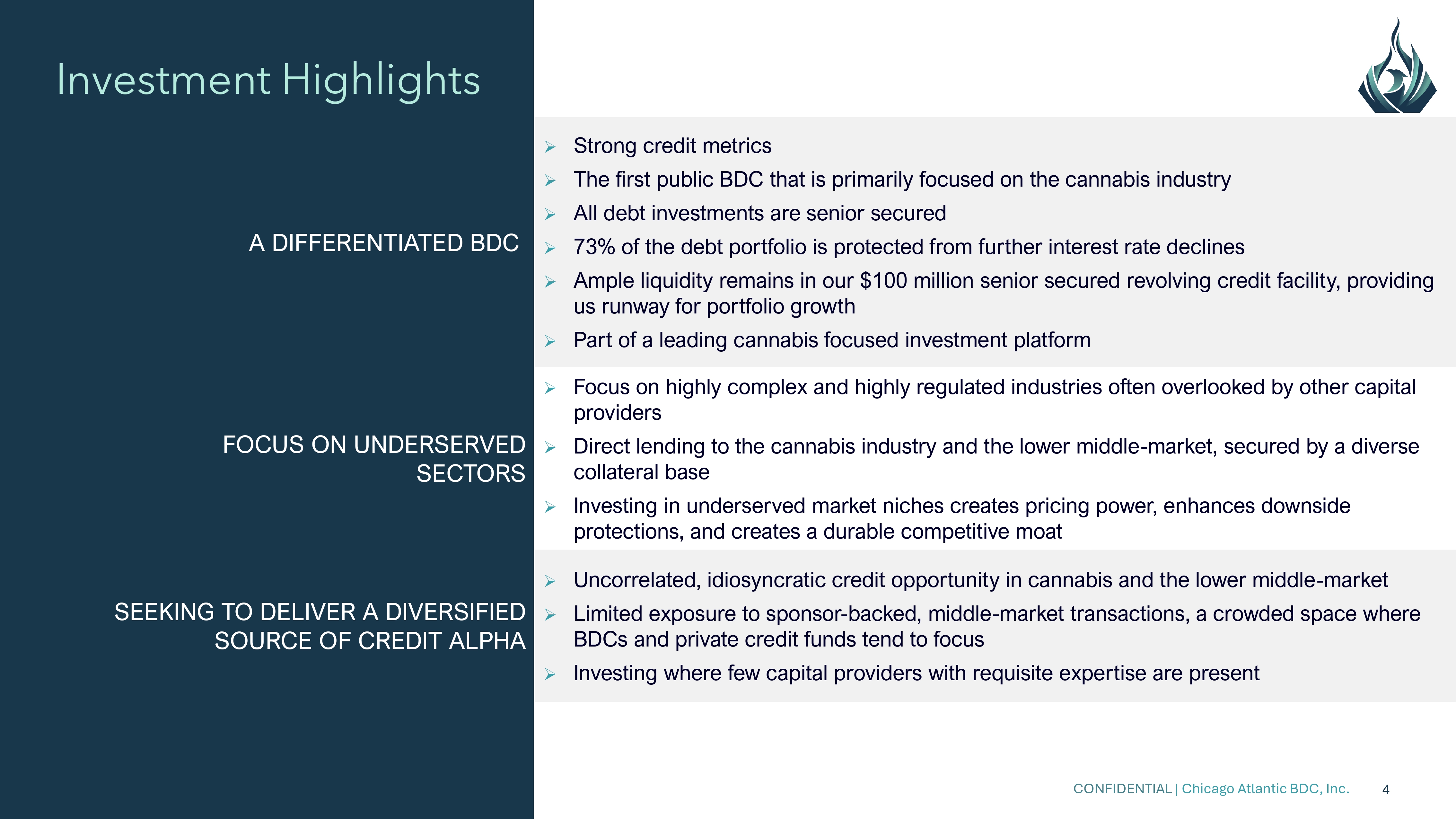 CONFIDENTIAL | Chicago Atlantic BDC, Inc. 3 Chicago Atlantic BDC, Inc Company & Platform Overview ~$732M near - term pipeline under evaluation (2) $3.3B+ in loans closed since platform inception (1) 185+ loans closed across platform (1) $333M total portfolio investment value 15.8% gross weighted - average yield of Company debt investments (3) 100% of current company debt investments are senior secured » Chicago Atlantic BDC, Inc. (NASDAQ: LIEN) (the “Company” or “us”) is externally managed by Chicago Atlantic BDC Advisers, LLC (the “Adviser”) » The Adviser, a majority - owned subsidiary of Chicago Atlantic Group, LP (together with its affiliates, “Chicago Atlantic”), is an SEC - registered investment adviser and works with its clients to originate, underwrite and deploy primarily first - lien, senior - secured fixed and floating rate debt primarily to the cannabis industry’s most established operators and to other niche companies overlooked by the broader market » The Adviser focuses on opportunities that are time - sensitive, highly complex or in dislocated sectors where risk is fundamentally mispriced with attractive risk - adjusted returns » Seasoned investment team with decades of multi - sector experience across market cycles and complex legal and regulatory frameworks in credit, special situations, equities, distressed and emerging market debt » Access to Chicago Atlantic’s leading lending platform which typically serves as lead or co - lead arranger, and its proprietary sourcing network and direct originations team 1. Includes all closed loans across the Chicago Atlantic platform. 2. Includes potential funding opportunities for new originations and refinancing of existing assets as of 12/31/2025 3. As of 12/31/25; see page 21 for information regarding the calculation of Gross Weighted Average Portfolio Yield on Debt Inves tme nts (“Portfolio Yield”) and Total Portfolio Investment Value .