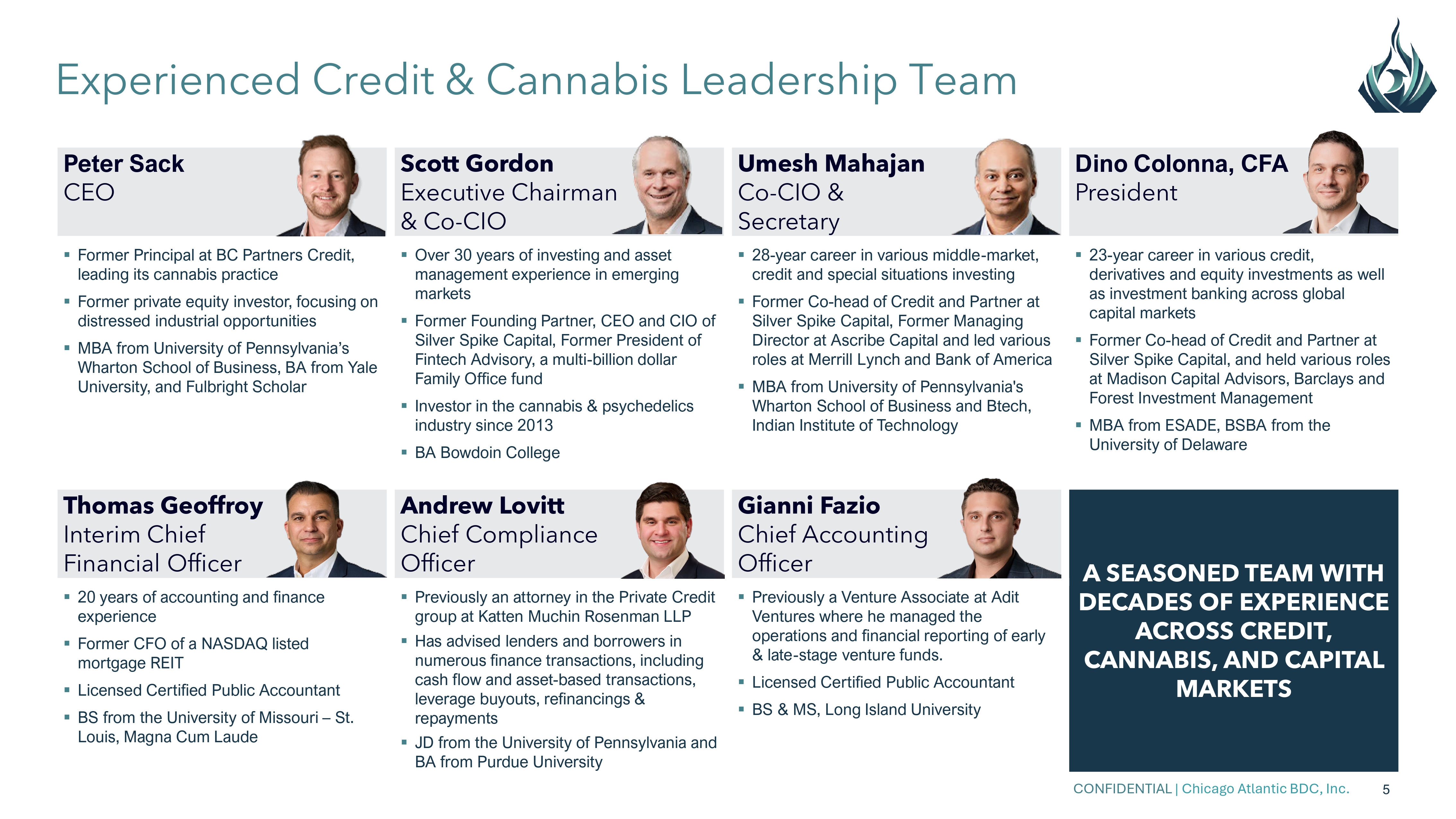 CONFIDENTIAL | Chicago Atlantic BDC, Inc. 4 Investment Highlights » Strong credit metrics » The first public BDC that is primarily focused on the cannabis industry » All debt investments are senior secured » 73% of the debt portfolio is protected from further interest rate declines » Ample liquidity remains in our $100 million senior secured revolving credit facility, providing us runway for portfolio growth » Part of a leading cannabis focused investment platform A DIFFERENTIATED BDC » Focus on highly complex and highly regulated industries often overlooked by other capital providers » Direct lending to the cannabis industry and the lower middle - market, secured by a diverse collateral base » Investing in underserved market niches creates pricing power, enhances downside protections, and creates a durable competitive moat FOCUS ON UNDERSERVED SECTORS » Uncorrelated, idiosyncratic credit opportunity in cannabis and the lower middle - market » Limited exposure to sponsor - backed, middle - market transactions, a crowded space where BDCs and private credit funds tend to focus » Investing where few capital providers with requisite expertise are present SEEKING TO DELIVER A DIVERSIFIED SOURCE OF CREDIT ALPHA