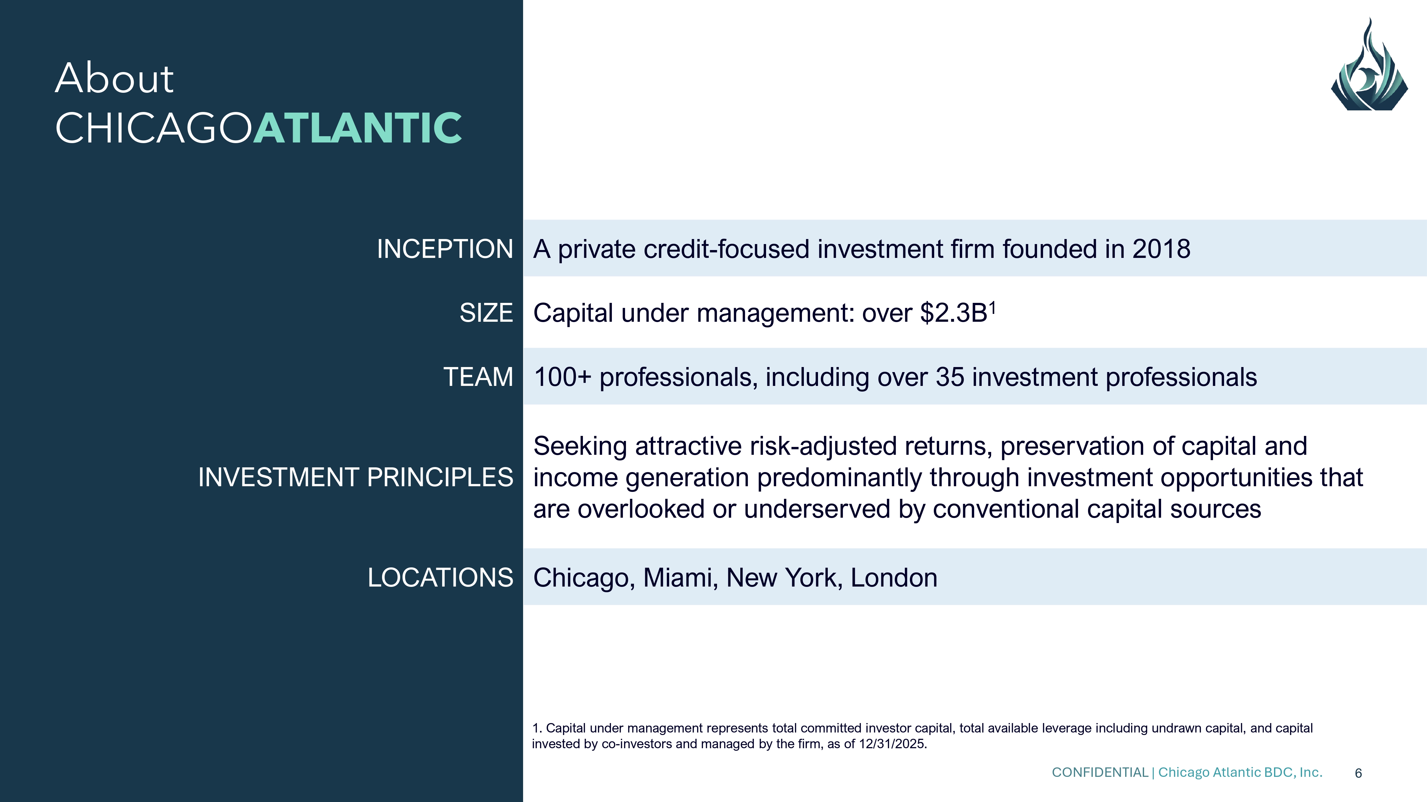 CONFIDENTIAL | Chicago Atlantic BDC, Inc. 5 Dino Colonna, CFA President Umesh Mahajan Co - CIO & Secretary Scott Gordon Executive Chairman & Co - CIO Peter Sack CEO ▪ 23 - year career in various credit, derivatives and equity investments as well as investment banking across global capital markets ▪ Former Co - head of Credit and Partner at Silver Spike Capital, and held various roles at Madison Capital Advisors, Barclays and Forest Investment Management ▪ MBA from ESADE, BSBA from the University of Delaware ▪ 28 - year career in various middle - market, credit and special situations investing ▪ Former Co - head of Credit and Partner at Silver Spike Capital, Former Managing Director at Ascribe Capital and led various roles at Merrill Lynch and Bank of America ▪ MBA from University of Pennsylvania's Wharton School of Business and Btech , Indian Institute of Technology ▪ Over 30 years of investing and asset management experience in emerging markets ▪ Former Founding Partner, CEO and CIO of Silver Spike Capital, Former President of Fintech Advisory, a multi - billion dollar Family Office fund ▪ Investor in the cannabis & psychedelics industry since 2013 ▪ BA Bowdoin College ▪ Former Principal at BC Partners Credit, leading its cannabis practice ▪ Former private equity investor, focusing on distressed industrial opportunities ▪ MBA from University of Pennsylvania’s Wharton School of Business, BA from Yale University, and Fulbright Scholar A SEASONED TEAM WITH DECADES OF EXPERIENCE ACROSS CREDIT, CANNABIS, AND CAPITAL MARKETS Gianni Fazio Chief Accounting Officer Andrew Lovitt Chief Compliance Officer Thomas Geoffroy Interim Chief Financial Officer ▪ Previously a Venture Associate at Adit Ventures where he managed the operations and financial reporting of early & late - stage venture funds. ▪ Licensed Certified Public Accountant ▪ BS & MS, Long Island University ▪ Previously an attorney in the Private Credit group at Katten Muchin Rosenman LLP ▪ Has advised lenders and borrowers in numerous finance transactions, including cash flow and asset - based transactions, leverage buyouts, refinancings & repayments ▪ JD from the University of Pennsylvania and BA from Purdue University ▪ 20 years of accounting and finance experience ▪ Former CFO of a NASDAQ listed mortgage REIT ▪ Licensed Certified Public Accountant ▪ BS from the University of Missouri – St. Louis, Magna Cum Laude Experienced Credit & Cannabis Leadership Team