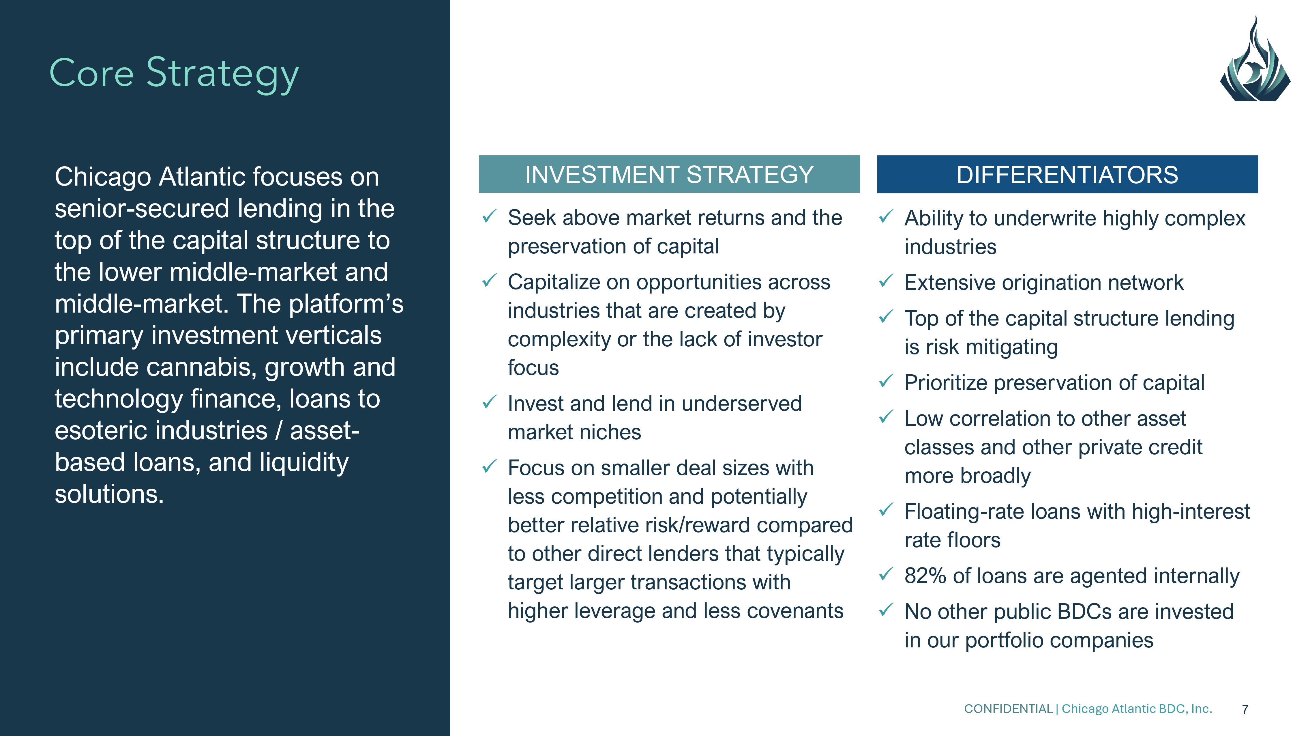 CONFIDENTIAL | Chicago Atlantic BDC, Inc. 6 About CHICAGO ATLANTIC 1. Capital under management represents total committed investor capital, total available leverage including undrawn capital, and capital invested by co - investors and managed by the firm, as of 12/31/2025. A private credit - focused investment firm founded in 2018 INCEPTION Capital under management: over $2.3B 1 SIZE 100+ professionals, including over 35 investment professionals TEAM Seeking attractive risk - adjusted returns, preservation of capital and income generation predominantly through investment opportunities that are overlooked or underserved by conventional capital sources INVESTMENT PRINCIPLES Chicago, Miami, New York, London LOCATIONS