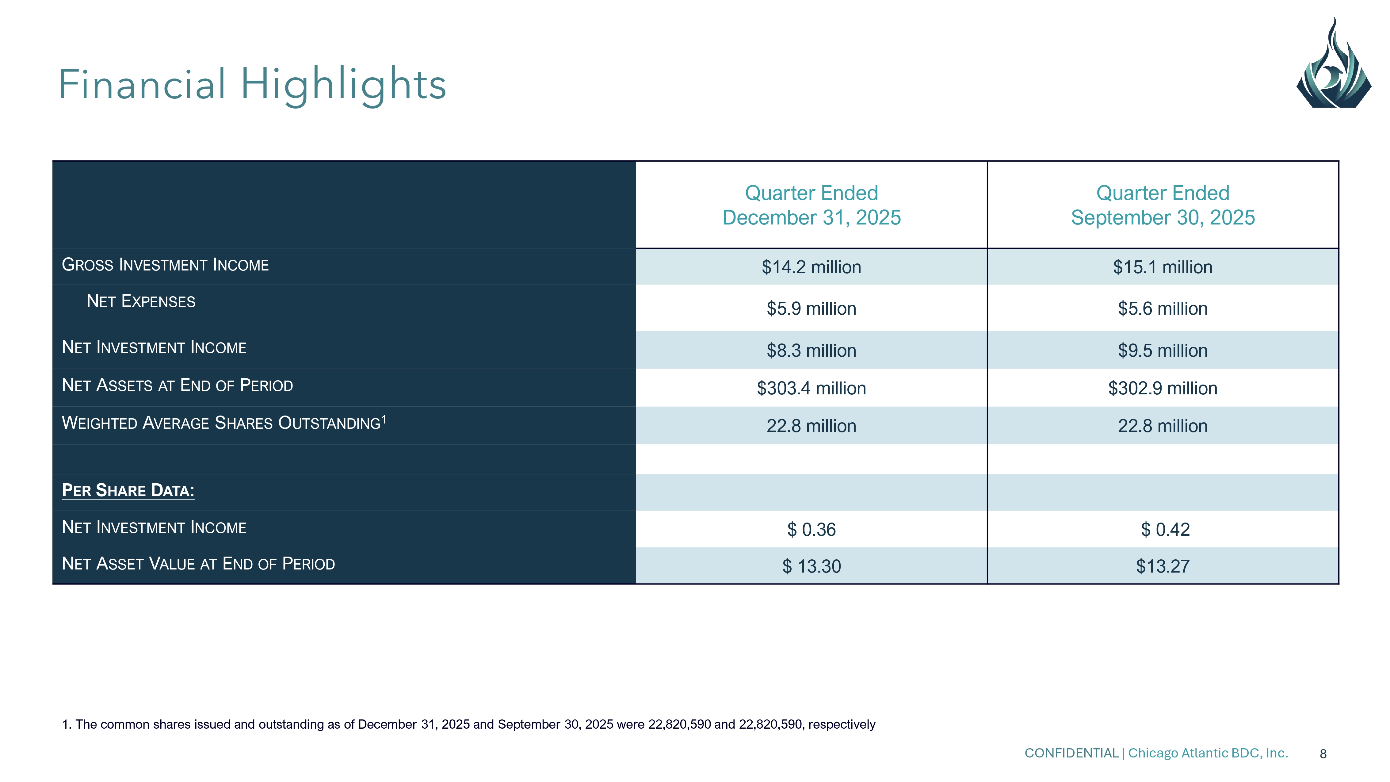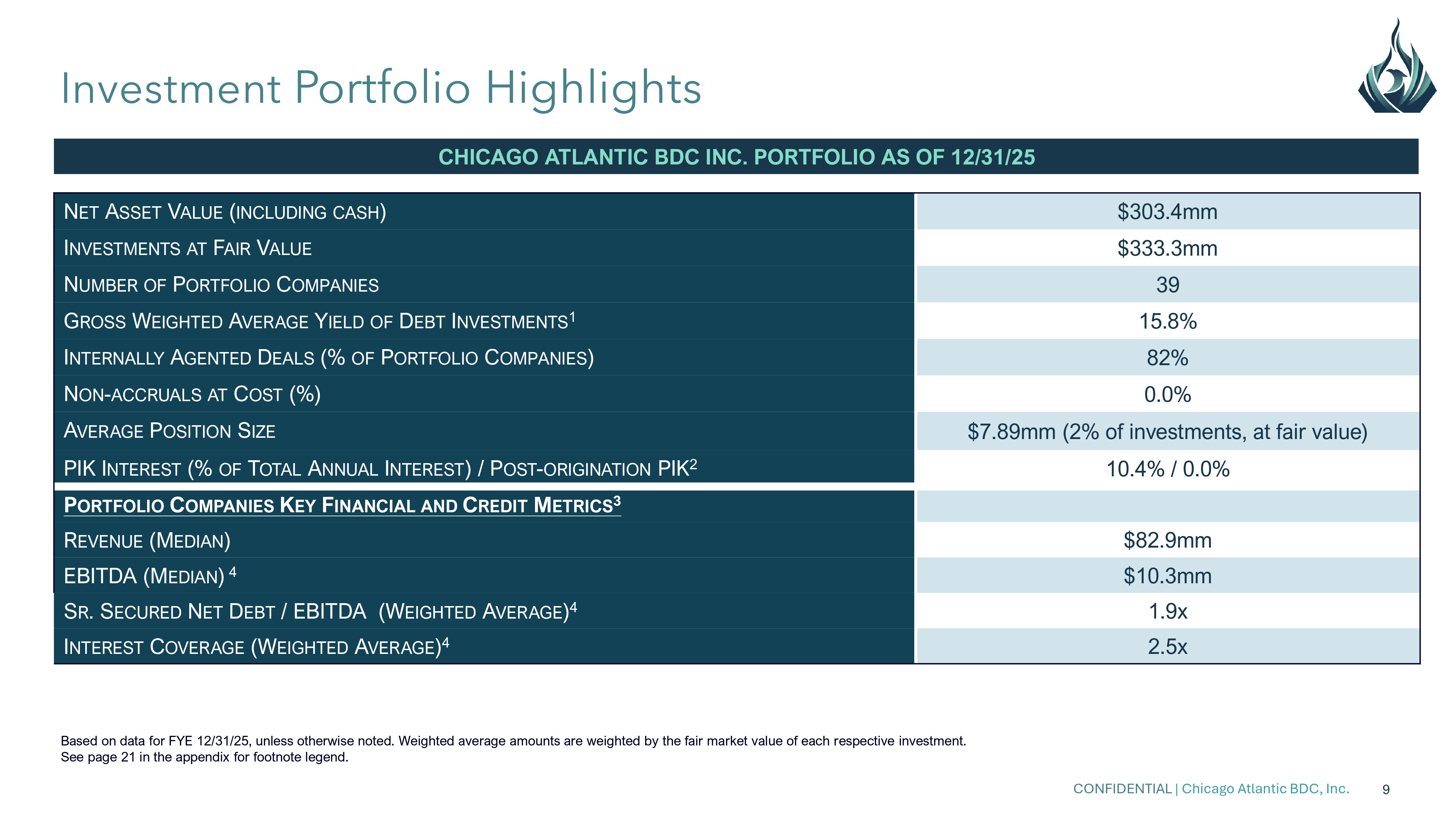 CONFIDENTIAL | Chicago Atlantic BDC, Inc. 8 Pro Forma Portfolio Financial Highlights 1. The common shares issued and outstanding as of December 31, 2025 and September 30, 2025 were 22,820,590 and 22,820,590, re spe ctively Quarter Ended September 30, 2025 Quarter Ended December 31, 2025 $15.1 million $14.2 million G ROSS I NVESTMENT I NCOME $5.6 million $5.9 million N ET E XPENSES $9.5 million $8.3 million N ET I NVESTMENT I NCOME $302.9 million $303.4 million N ET A SSETS AT E ND OF P ERIOD 22.8 million 22.8 million W EIGHTED A VERAGE S HARES O UTSTANDING 1 P ER S HARE D ATA : $ 0.42 $ 0.36 N ET I NVESTMENT I NCOME $13.27 $ 13.30 N ET A SSET V ALUE AT E ND OF P ERIOD