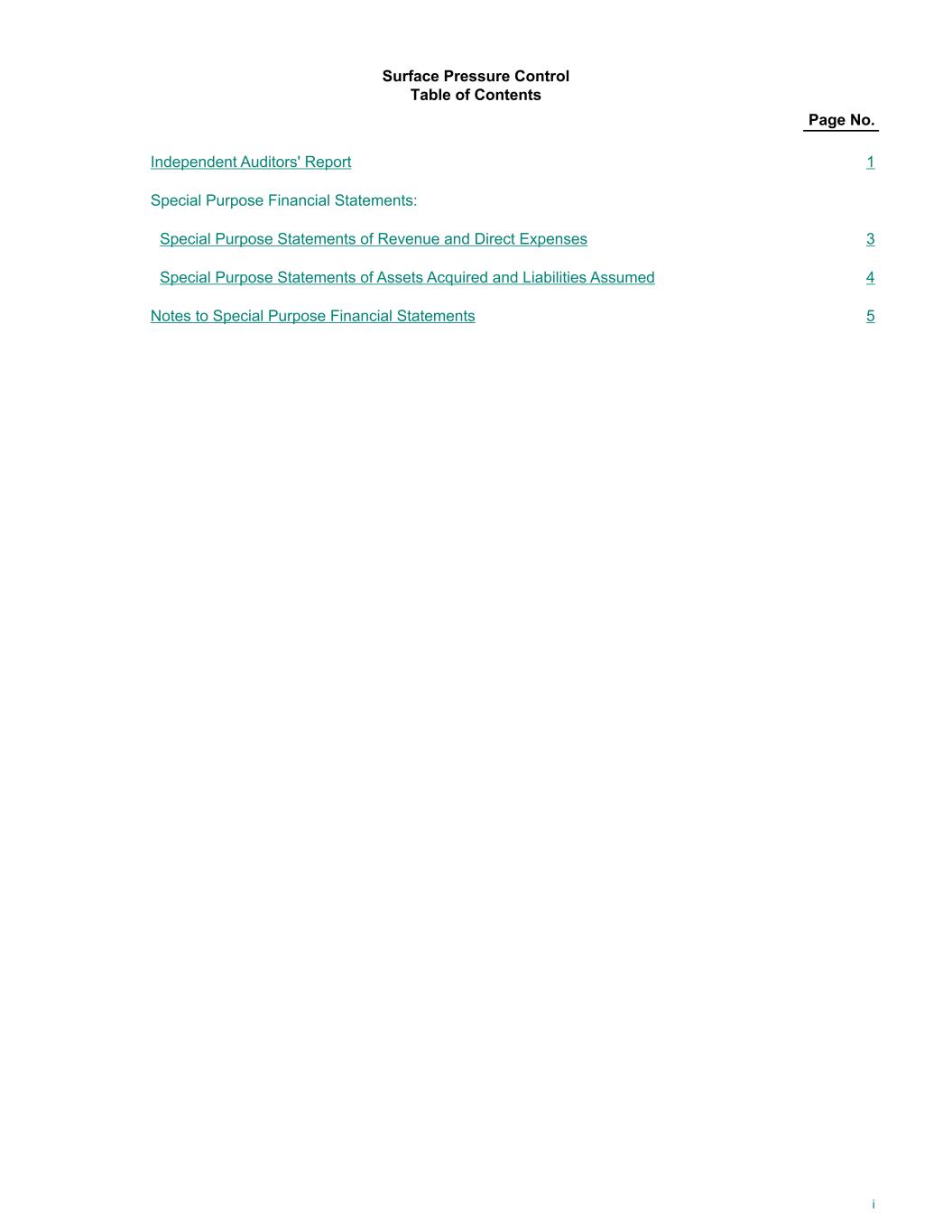 Surface Pressure Control Table of Contents Page No. Independent Auditors' Report 1 Special Purpose Financial Statements: Special Purpose Statements of Revenue and Direct Expenses 3 Special Purpose Statements of Assets Acquired and Liabilities Assumed 4 Notes to Special Purpose Financial Statements 5 i