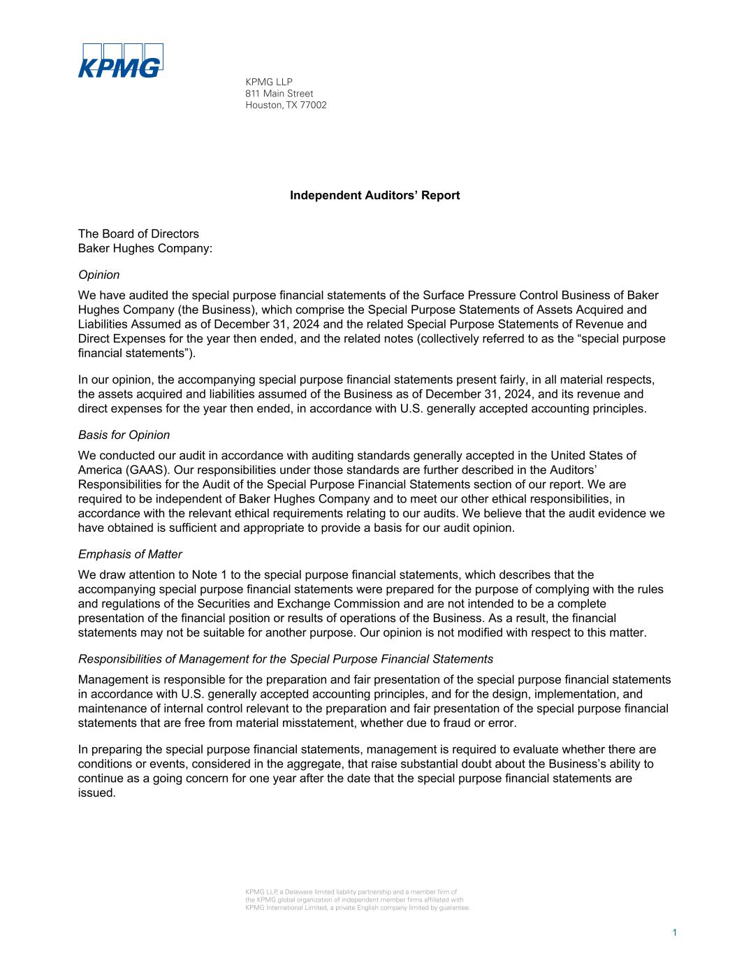 Independent Auditors’ Report The Board of Directors Baker Hughes Company: Opinion We have audited the special purpose financial statements of the Surface Pressure Control Business of Baker Hughes Company (the Business), which comprise the Special Purpose Statements of Assets Acquired and Liabilities Assumed as of December 31, 2024 and the related Special Purpose Statements of Revenue and Direct Expenses for the year then ended, and the related notes (collectively referred to as the “special purpose financial statements”). In our opinion, the accompanying special purpose financial statements present fairly, in all material respects, the assets acquired and liabilities assumed of the Business as of December 31, 2024, and its revenue and direct expenses for the year then ended, in accordance with U.S. generally accepted accounting principles. Basis for Opinion We conducted our audit in accordance with auditing standards generally accepted in the United States of America (GAAS). Our responsibilities under those standards are further described in the Auditors’ Responsibilities for the Audit of the Special Purpose Financial Statements section of our report. We are required to be independent of Baker Hughes Company and to meet our other ethical responsibilities, in accordance with the relevant ethical requirements relating to our audits. We believe that the audit evidence we have obtained is sufficient and appropriate to provide a basis for our audit opinion. Emphasis of Matter We draw attention to Note 1 to the special purpose financial statements, which describes that the accompanying special purpose financial statements were prepared for the purpose of complying with the rules and regulations of the Securities and Exchange Commission and are not intended to be a complete presentation of the financial position or results of operations of the Business. As a result, the financial statements may not be suitable for another purpose. Our opinion is not modified with respect to this matter. Responsibilities of Management for the Special Purpose Financial Statements Management is responsible for the preparation and fair presentation of the special purpose financial statements in accordance with U.S. generally accepted accounting principles, and for the design, implementation, and maintenance of internal control relevant to the preparation and fair presentation of the special purpose financial statements that are free from material misstatement, whether due to fraud or error. In preparing the special purpose financial statements, management is required to evaluate whether there are conditions or events, considered in the aggregate, that raise substantial doubt about the Business’s ability to continue as a going concern for one year after the date that the special purpose financial statements are issued. KPMG LLP 811 Main Street Houston, TX 77002 KPMG LLP, a Delaware limited liability partnership and a member firm of the KPMG global organization of independent member firms affiliated with KPMG International Limited, a private English company limited by guarantee. 1