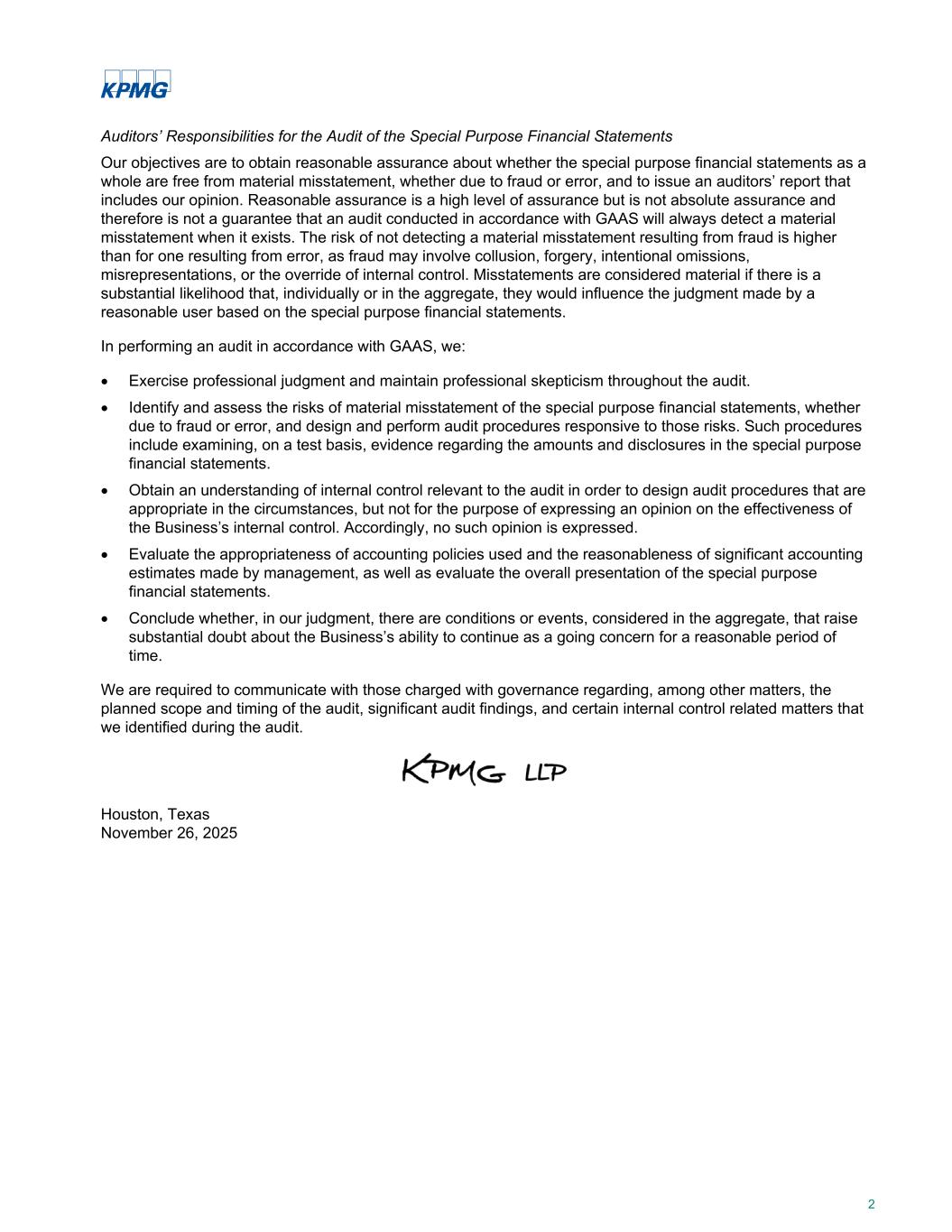 Auditors’ Responsibilities for the Audit of the Special Purpose Financial Statements Our objectives are to obtain reasonable assurance about whether the special purpose financial statements as a whole are free from material misstatement, whether due to fraud or error, and to issue an auditors’ report that includes our opinion. Reasonable assurance is a high level of assurance but is not absolute assurance and therefore is not a guarantee that an audit conducted in accordance with GAAS will always detect a material misstatement when it exists. The risk of not detecting a material misstatement resulting from fraud is higher than for one resulting from error, as fraud may involve collusion, forgery, intentional omissions, misrepresentations, or the override of internal control. Misstatements are considered material if there is a substantial likelihood that, individually or in the aggregate, they would influence the judgment made by a reasonable user based on the special purpose financial statements. In performing an audit in accordance with GAAS, we: • Exercise professional judgment and maintain professional skepticism throughout the audit. • Identify and assess the risks of material misstatement of the special purpose financial statements, whether due to fraud or error, and design and perform audit procedures responsive to those risks. Such procedures include examining, on a test basis, evidence regarding the amounts and disclosures in the special purpose financial statements. • Obtain an understanding of internal control relevant to the audit in order to design audit procedures that are appropriate in the circumstances, but not for the purpose of expressing an opinion on the effectiveness of the Business’s internal control. Accordingly, no such opinion is expressed. • Evaluate the appropriateness of accounting policies used and the reasonableness of significant accounting estimates made by management, as well as evaluate the overall presentation of the special purpose financial statements. • Conclude whether, in our judgment, there are conditions or events, considered in the aggregate, that raise substantial doubt about the Business’s ability to continue as a going concern for a reasonable period of time. We are required to communicate with those charged with governance regarding, among other matters, the planned scope and timing of the audit, significant audit findings, and certain internal control related matters that we identified during the audit. Houston, Texas November 26, 2025 2