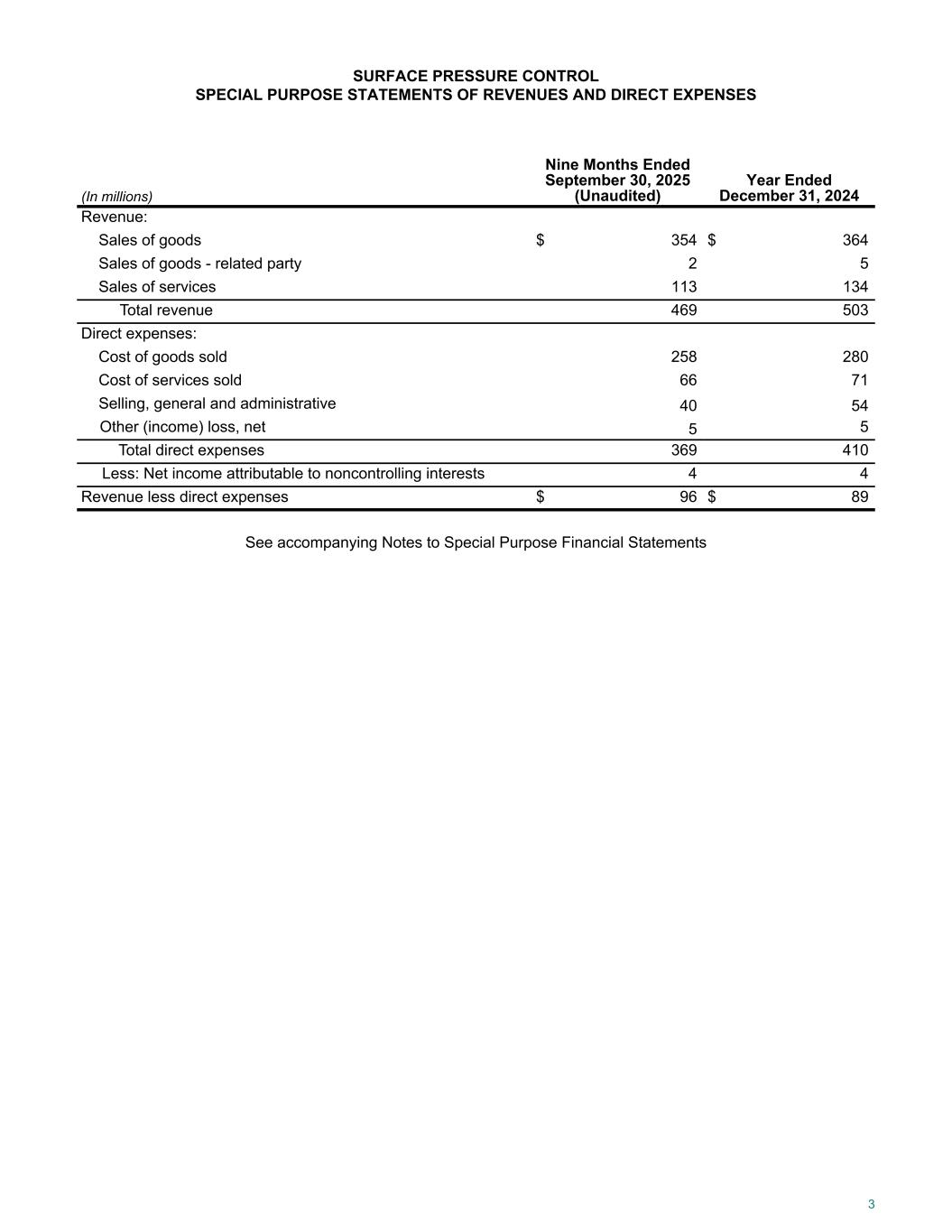 SURFACE PRESSURE CONTROL SPECIAL PURPOSE STATEMENTS OF REVENUES AND DIRECT EXPENSES (In millions) Nine Months Ended September 30, 2025 (Unaudited) Year Ended December 31, 2024 Revenue: Sales of goods $ 354 $ 364 Sales of goods - related party 2 5 Sales of services 113 134 Total revenue 469 503 Direct expenses: Cost of goods sold 258 280 Cost of services sold 66 71 Selling, general and administrative 40 54 Other (income) loss, net 5 5 Total direct expenses 369 410 Less: Net income attributable to noncontrolling interests 4 4 Revenue less direct expenses $ 96 $ 89 See accompanying Notes to Special Purpose Financial Statements 3