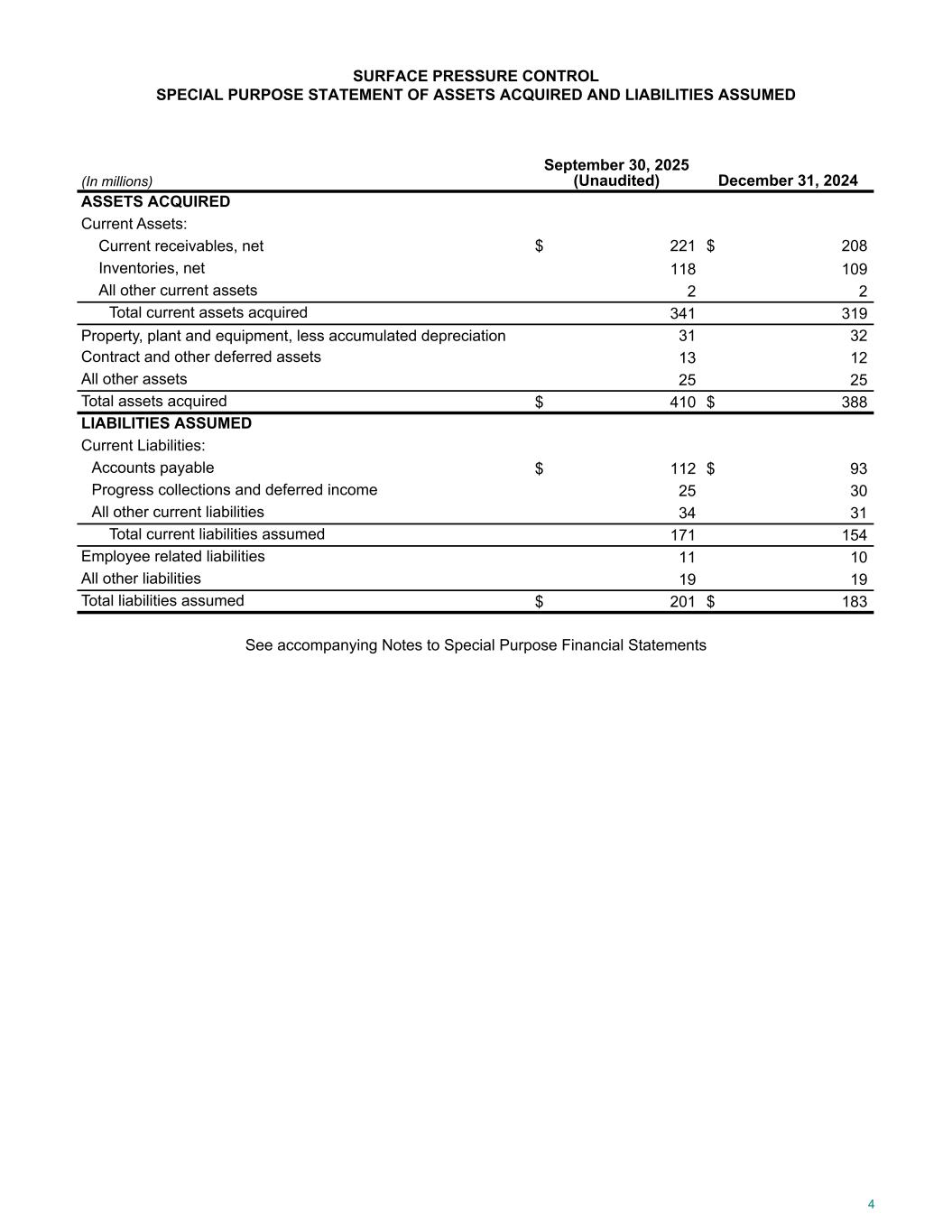 SURFACE PRESSURE CONTROL SPECIAL PURPOSE STATEMENT OF ASSETS ACQUIRED AND LIABILITIES ASSUMED (In millions) September 30, 2025 (Unaudited) December 31, 2024 ASSETS ACQUIRED Current Assets: Current receivables, net $ 221 $ 208 Inventories, net 118 109 All other current assets 2 2 Total current assets acquired 341 319 Property, plant and equipment, less accumulated depreciation 31 32 Contract and other deferred assets 13 12 All other assets 25 25 Total assets acquired $ 410 $ 388 LIABILITIES ASSUMED Current Liabilities: Accounts payable $ 112 $ 93 Progress collections and deferred income 25 30 All other current liabilities 34 31 Total current liabilities assumed 171 154 Employee related liabilities 11 10 All other liabilities 19 19 Total liabilities assumed $ 201 $ 183 See accompanying Notes to Special Purpose Financial Statements 4