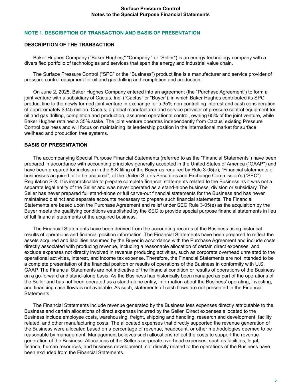 NOTE 1. DESCRIPTION OF TRANSACTION AND BASIS OF PRESENTATION DESCRIPTION OF THE TRANSACTION Baker Hughes Company ("Baker Hughes," “Company,” or "Seller") is an energy technology company with a diversified portfolio of technologies and services that span the energy and industrial value chain. The Surface Pressure Control (“SPC” or the “Business”) product line is a manufacturer and service provider of pressure control equipment for oil and gas drilling and completion and production. On June 2, 2025, Baker Hughes Company entered into an agreement (the “Purchase Agreement”) to form a joint venture with a subsidiary of Cactus, Inc. (“Cactus” or “Buyer”), in which Baker Hughes contributed its SPC product line to the newly formed joint venture in exchange for a 35% non-controlling interest and cash consideration of approximately $345 million. Cactus, a global manufacturer and service provider of pressure control equipment for oil and gas drilling, completion and production, assumed operational control, owning 65% of the joint venture, while Baker Hughes retained a 35% stake. The joint venture operates independently from Cactus’ existing Pressure Control business and will focus on maintaining its leadership position in the international market for surface wellhead and production tree systems. BASIS OF PRESENTATION The accompanying Special Purpose Financial Statements (referred to as the "Financial Statements") have been prepared in accordance with accounting principles generally accepted in the United States of America ("GAAP") and have been prepared for inclusion in the 8-K filing of the Buyer as required by Rule 3-05(e), “Financial statements of businesses acquired or to be acquired”, of the United States Securities and Exchange Commission’s (“SEC”) Regulation S-X. It is impracticable to prepare complete financial statements related to the Business as it was not a separate legal entity of the Seller and was never operated as a stand-alone business, division or subsidiary. The Seller has never prepared full stand-alone or full carve-out financial statements for the Business and has never maintained distinct and separate accounts necessary to prepare such financial statements. The Financial Statements are based upon the Purchase Agreement and relief under SEC Rule 3-05(e) as the acquisition by the Buyer meets the qualifying conditions established by the SEC to provide special purpose financial statements in lieu of full financial statements of the acquired business. The Financial Statements have been derived from the accounting records of the Business using historical results of operations and financial position information. The Financial Statements have been prepared to reflect the assets acquired and liabilities assumed by the Buyer in accordance with the Purchase Agreement and include costs directly associated with producing revenue, including a reasonable allocation of certain direct expenses, and exclude expenses not directly involved in revenue producing activities, such as corporate overhead unrelated to the operational activities, interest, and income tax expense. Therefore, the Financial Statements are not intended to be a complete presentation of the financial position or results of operations of the Business in conformity with U.S. GAAP. The Financial Statements are not indicative of the financial condition or results of operations of the Business on a go-forward and stand-alone basis. As the Business has historically been managed as part of the operations of the Seller and has not been operated as a stand-alone entity, information about the Business’ operating, investing, and financing cash flows is not available. As such, statements of cash flows are not presented in the Financial Statements. The Financial Statements include revenue generated by the Business less expenses directly attributable to the Business and certain allocations of direct expenses incurred by the Seller. Direct expenses allocated to the Business include employee costs, warehousing, freight, shipping and handling, research and development, facility related, and other manufacturing costs. The allocated expenses that directly supported the revenue generation of the Business were allocated based on a percentage of revenue, headcount, or other methodologies deemed to be reasonable by management. Management believes such allocations reflect the costs to support the revenue generation of the Business. Allocations of the Seller’s corporate overhead expenses, such as facilities, legal, finance, human resources, and business development, not directly related to the operations of the Business have been excluded from the Financial Statements. Surface Pressure Control Notes to the Special Purpose Financial Statements 5