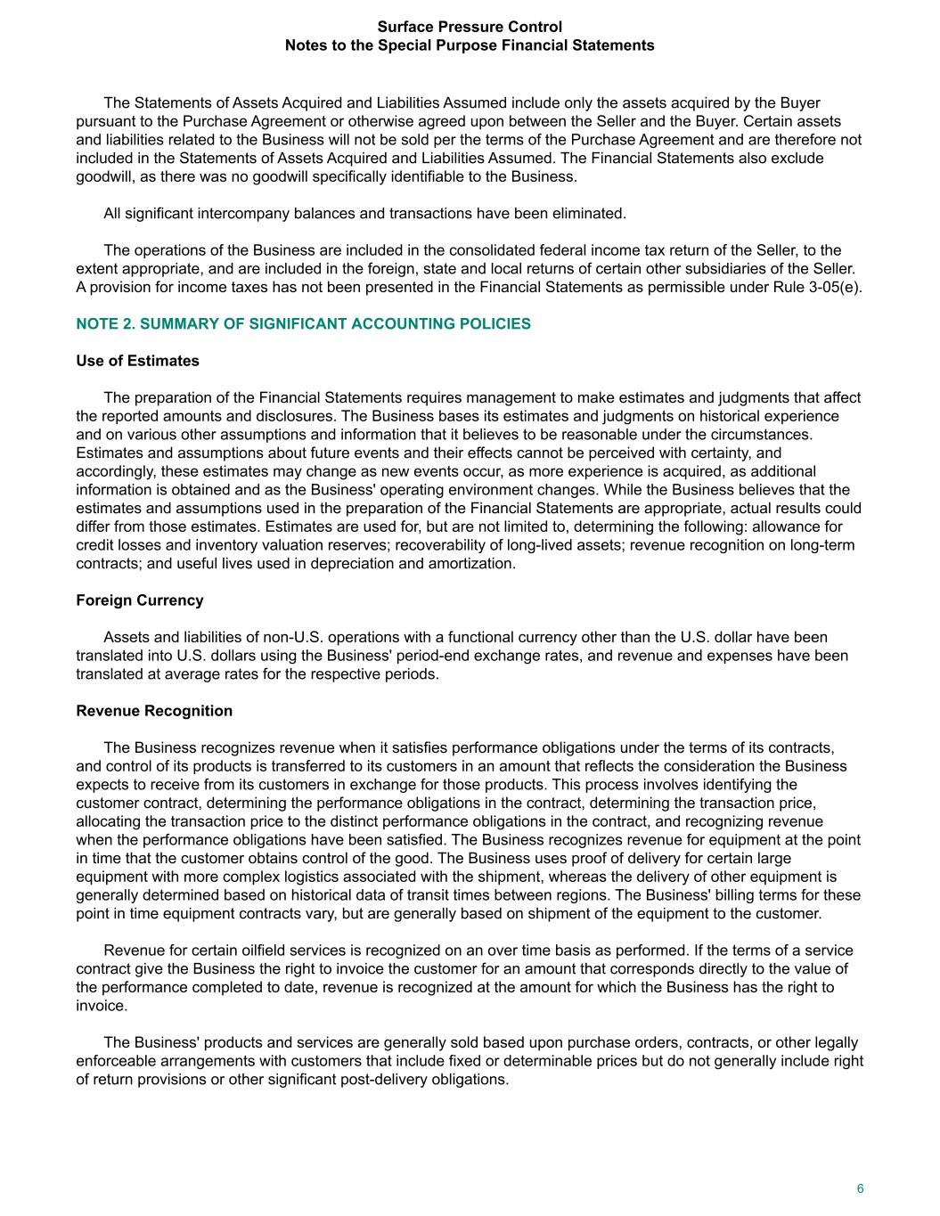 The Statements of Assets Acquired and Liabilities Assumed include only the assets acquired by the Buyer pursuant to the Purchase Agreement or otherwise agreed upon between the Seller and the Buyer. Certain assets and liabilities related to the Business will not be sold per the terms of the Purchase Agreement and are therefore not included in the Statements of Assets Acquired and Liabilities Assumed. The Financial Statements also exclude goodwill, as there was no goodwill specifically identifiable to the Business. All significant intercompany balances and transactions have been eliminated. The operations of the Business are included in the consolidated federal income tax return of the Seller, to the extent appropriate, and are included in the foreign, state and local returns of certain other subsidiaries of the Seller. A provision for income taxes has not been presented in the Financial Statements as permissible under Rule 3-05(e). NOTE 2. SUMMARY OF SIGNIFICANT ACCOUNTING POLICIES Use of Estimates The preparation of the Financial Statements requires management to make estimates and judgments that affect the reported amounts and disclosures. The Business bases its estimates and judgments on historical experience and on various other assumptions and information that it believes to be reasonable under the circumstances. Estimates and assumptions about future events and their effects cannot be perceived with certainty, and accordingly, these estimates may change as new events occur, as more experience is acquired, as additional information is obtained and as the Business' operating environment changes. While the Business believes that the estimates and assumptions used in the preparation of the Financial Statements are appropriate, actual results could differ from those estimates. Estimates are used for, but are not limited to, determining the following: allowance for credit losses and inventory valuation reserves; recoverability of long-lived assets; revenue recognition on long-term contracts; and useful lives used in depreciation and amortization. Foreign Currency Assets and liabilities of non-U.S. operations with a functional currency other than the U.S. dollar have been translated into U.S. dollars using the Business' period-end exchange rates, and revenue and expenses have been translated at average rates for the respective periods. Revenue Recognition The Business recognizes revenue when it satisfies performance obligations under the terms of its contracts, and control of its products is transferred to its customers in an amount that reflects the consideration the Business expects to receive from its customers in exchange for those products. This process involves identifying the customer contract, determining the performance obligations in the contract, determining the transaction price, allocating the transaction price to the distinct performance obligations in the contract, and recognizing revenue when the performance obligations have been satisfied. The Business recognizes revenue for equipment at the point in time that the customer obtains control of the good. The Business uses proof of delivery for certain large equipment with more complex logistics associated with the shipment, whereas the delivery of other equipment is generally determined based on historical data of transit times between regions. The Business' billing terms for these point in time equipment contracts vary, but are generally based on shipment of the equipment to the customer. Revenue for certain oilfield services is recognized on an over time basis as performed. If the terms of a service contract give the Business the right to invoice the customer for an amount that corresponds directly to the value of the performance completed to date, revenue is recognized at the amount for which the Business has the right to invoice. The Business' products and services are generally sold based upon purchase orders, contracts, or other legally enforceable arrangements with customers that include fixed or determinable prices but do not generally include right of return provisions or other significant post-delivery obligations. Surface Pressure Control Notes to the Special Purpose Financial Statements 6