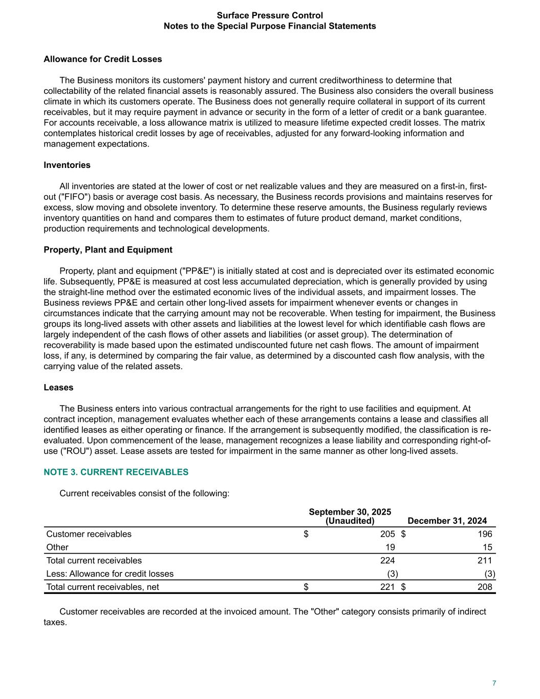 Allowance for Credit Losses The Business monitors its customers' payment history and current creditworthiness to determine that collectability of the related financial assets is reasonably assured. The Business also considers the overall business climate in which its customers operate. The Business does not generally require collateral in support of its current receivables, but it may require payment in advance or security in the form of a letter of credit or a bank guarantee. For accounts receivable, a loss allowance matrix is utilized to measure lifetime expected credit losses. The matrix contemplates historical credit losses by age of receivables, adjusted for any forward-looking information and management expectations. Inventories All inventories are stated at the lower of cost or net realizable values and they are measured on a first-in, first- out ("FIFO") basis or average cost basis. As necessary, the Business records provisions and maintains reserves for excess, slow moving and obsolete inventory. To determine these reserve amounts, the Business regularly reviews inventory quantities on hand and compares them to estimates of future product demand, market conditions, production requirements and technological developments. Property, Plant and Equipment Property, plant and equipment ("PP&E") is initially stated at cost and is depreciated over its estimated economic life. Subsequently, PP&E is measured at cost less accumulated depreciation, which is generally provided by using the straight-line method over the estimated economic lives of the individual assets, and impairment losses. The Business reviews PP&E and certain other long-lived assets for impairment whenever events or changes in circumstances indicate that the carrying amount may not be recoverable. When testing for impairment, the Business groups its long-lived assets with other assets and liabilities at the lowest level for which identifiable cash flows are largely independent of the cash flows of other assets and liabilities (or asset group). The determination of recoverability is made based upon the estimated undiscounted future net cash flows. The amount of impairment loss, if any, is determined by comparing the fair value, as determined by a discounted cash flow analysis, with the carrying value of the related assets. Leases The Business enters into various contractual arrangements for the right to use facilities and equipment. At contract inception, management evaluates whether each of these arrangements contains a lease and classifies all identified leases as either operating or finance. If the arrangement is subsequently modified, the classification is re- evaluated. Upon commencement of the lease, management recognizes a lease liability and corresponding right-of- use ("ROU") asset. Lease assets are tested for impairment in the same manner as other long-lived assets. NOTE 3. CURRENT RECEIVABLES Current receivables consist of the following: September 30, 2025 (Unaudited) December 31, 2024 Customer receivables $ 205 $ 196 Other 19 15 Total current receivables 224 211 Less: Allowance for credit losses (3) (3) Total current receivables, net $ 221 $ 208 Customer receivables are recorded at the invoiced amount. The "Other" category consists primarily of indirect taxes. Surface Pressure Control Notes to the Special Purpose Financial Statements 7