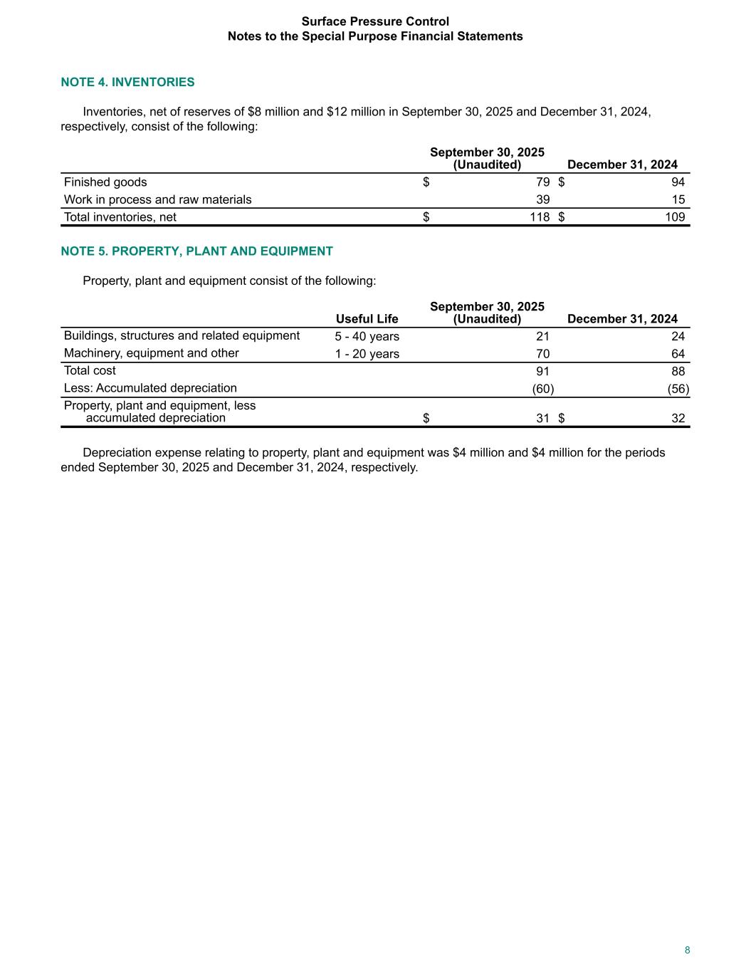 NOTE 4. INVENTORIES Inventories, net of reserves of $8 million and $12 million in September 30, 2025 and December 31, 2024, respectively, consist of the following: September 30, 2025 (Unaudited) December 31, 2024 Finished goods $ 79 $ 94 Work in process and raw materials 39 15 Total inventories, net $ 118 $ 109 NOTE 5. PROPERTY, PLANT AND EQUIPMENT Property, plant and equipment consist of the following: Useful Life September 30, 2025 (Unaudited) December 31, 2024 Buildings, structures and related equipment 5 - 40 years 21 24 Machinery, equipment and other 1 - 20 years 70 64 Total cost 91 88 Less: Accumulated depreciation (60) (56) Property, plant and equipment, less accumulated depreciation $ 31 $ 32 Depreciation expense relating to property, plant and equipment was $4 million and $4 million for the periods ended September 30, 2025 and December 31, 2024, respectively. Surface Pressure Control Notes to the Special Purpose Financial Statements 8