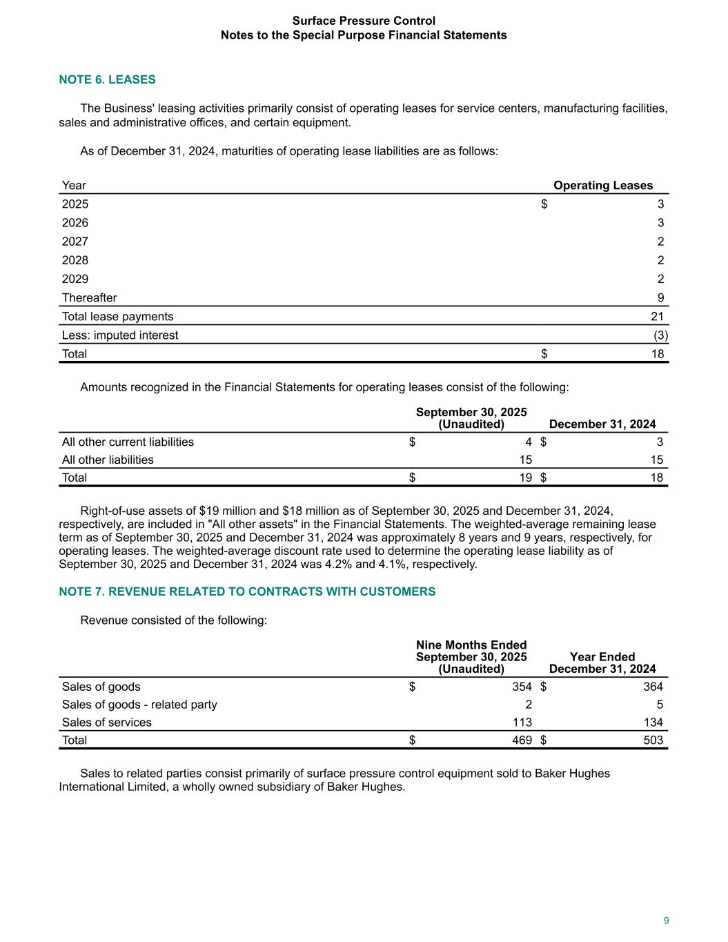 NOTE 6. LEASES The Business' leasing activities primarily consist of operating leases for service centers, manufacturing facilities, sales and administrative offices, and certain equipment. As of December 31, 2024, maturities of operating lease liabilities are as follows: Year Operating Leases 2025 $ 3 2026 3 2027 2 2028 2 2029 2 Thereafter 9 Total lease payments 21 Less: imputed interest (3) Total $ 18 Amounts recognized in the Financial Statements for operating leases consist of the following: September 30, 2025 (Unaudited) December 31, 2024 All other current liabilities $ 4 $ 3 All other liabilities 15 15 Total $ 19 $ 18 Right-of-use assets of $19 million and $18 million as of September 30, 2025 and December 31, 2024, respectively, are included in "All other assets" in the Financial Statements. The weighted-average remaining lease term as of September 30, 2025 and December 31, 2024 was approximately 8 years and 9 years, respectively, for operating leases. The weighted-average discount rate used to determine the operating lease liability as of September 30, 2025 and December 31, 2024 was 4.2% and 4.1%, respectively. NOTE 7. REVENUE RELATED TO CONTRACTS WITH CUSTOMERS Revenue consisted of the following: Nine Months Ended September 30, 2025 (Unaudited) Year Ended December 31, 2024 Sales of goods $ 354 $ 364 Sales of goods - related party 2 5 Sales of services 113 134 Total $ 469 $ 503 Sales to related parties consist primarily of surface pressure control equipment sold to Baker Hughes International Limited, a wholly owned subsidiary of Baker Hughes. Surface Pressure Control Notes to the Special Purpose Financial Statements 9
