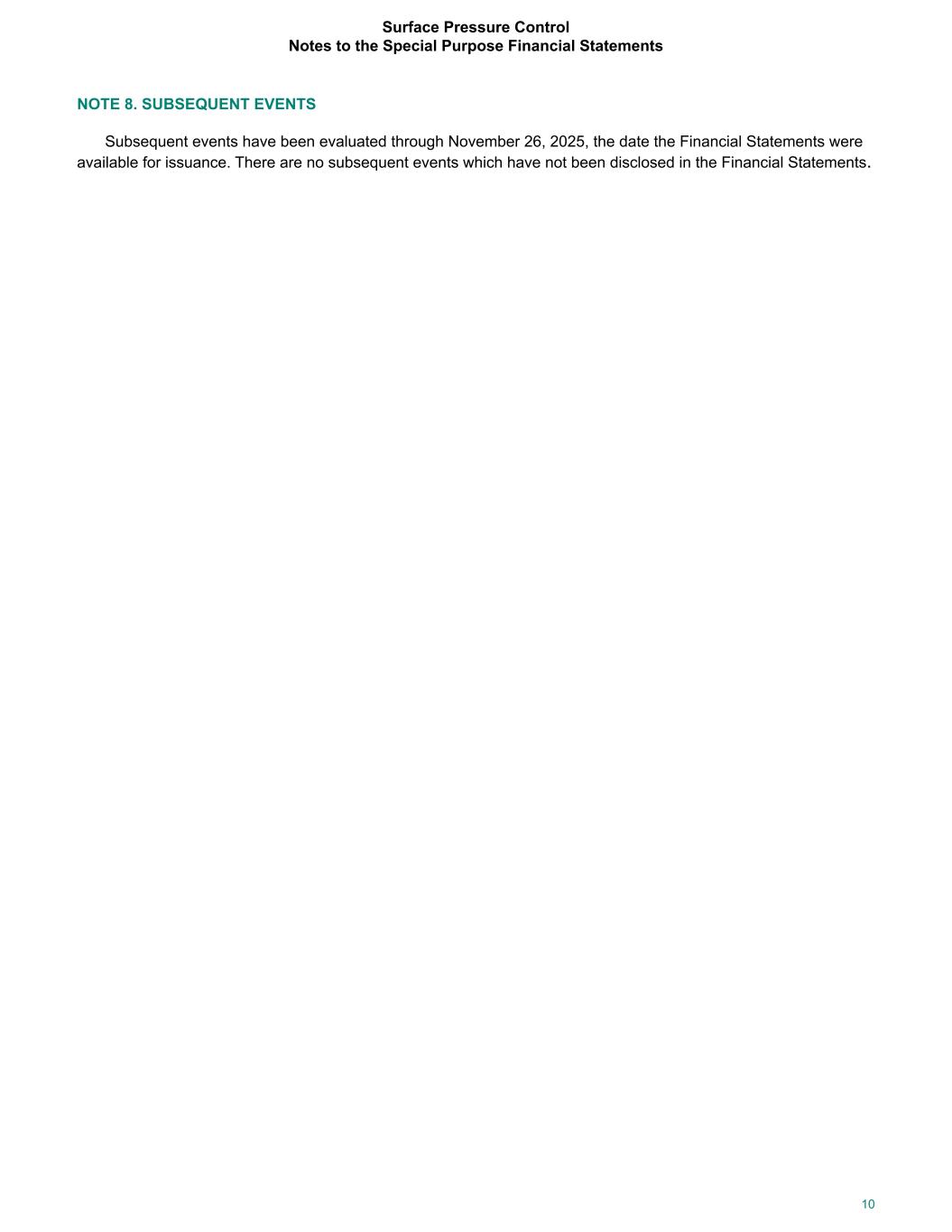 NOTE 8. SUBSEQUENT EVENTS Subsequent events have been evaluated through November 26, 2025, the date the Financial Statements were available for issuance. There are no subsequent events which have not been disclosed in the Financial Statements. Surface Pressure Control Notes to the Special Purpose Financial Statements 10