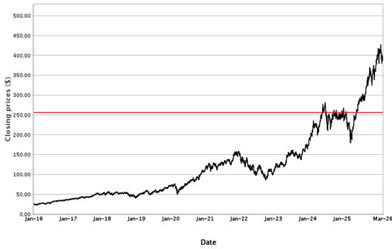 The following graphs set forth historical closing values of the Underliers for the period from January 1, 2016 to March 18, 2026. Each red line represents the Coupon Threshold and Barrier Value of the relevant Underlier. We obtained the information in the graphs from Bloomberg Financial Markets, without independent investigation. We cannot give you assurance that the performance of the Underliers will result in the return of all of your initial investment.