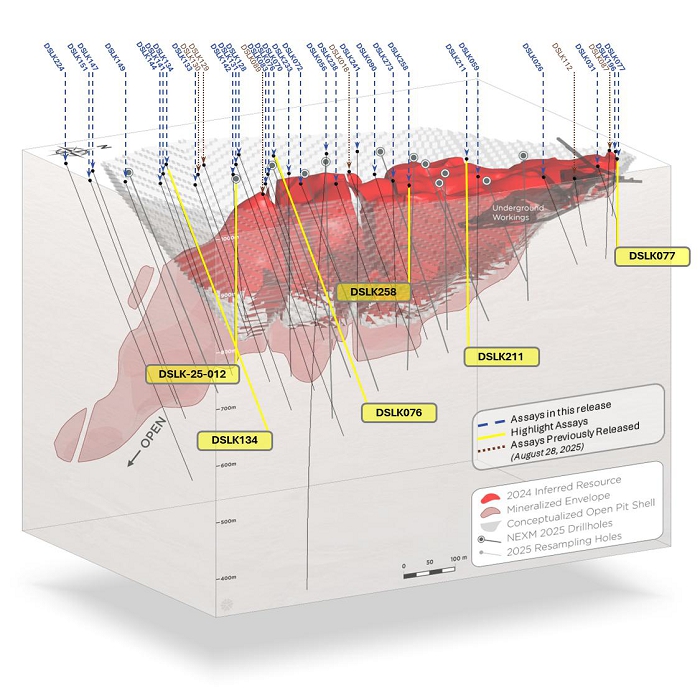 | ● | DSLK-25-012 was drilled to infill a gap in the resource and achieve a minimum drill spacing density of 60m across the deposit. | |