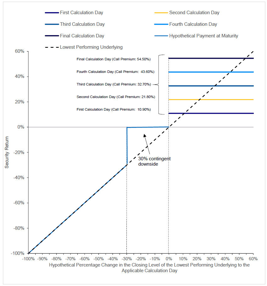 If, on any calculation day, beginning on April 1, 2027, the closing level of each underlying is greater than or equal to its respective starting level, the securities will be automatically called for the applicable call payment on the related call settlement date. |