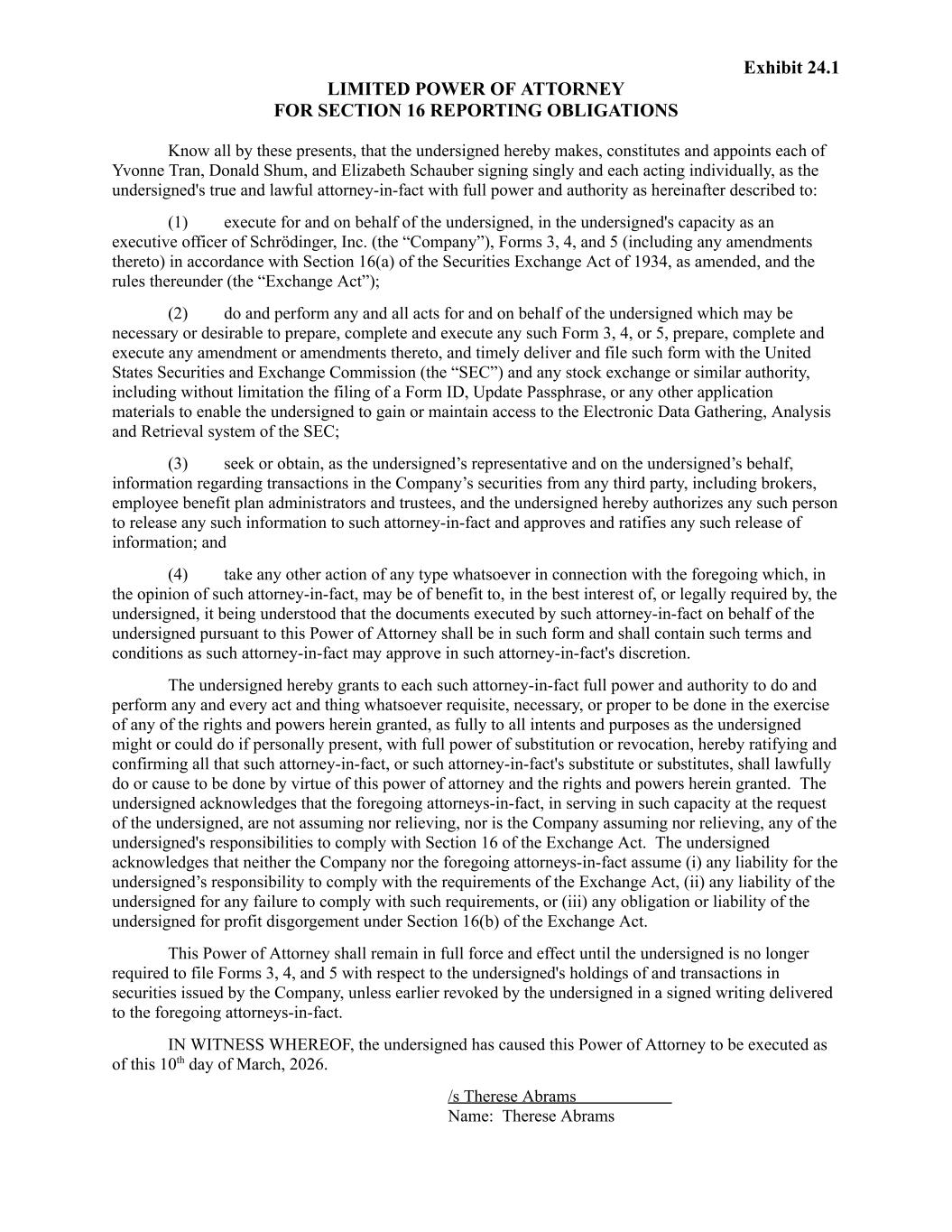 Exhibit 24.1 LIMITED POWER OF ATTORNEY FOR SECTION 16 REPORTING OBLIGATIONS Know all by these presents, that the undersigned hereby makes, constitutes and appoints each of Yvonne Tran, Donald Shum, and Elizabeth Schauber signing singly and each acting individually, as the undersigned's true and lawful attorney-in-fact with full power and authority as hereinafter described to: (1) execute for and on behalf of the undersigned, in the undersigned's capacity as an executive officer of Schrödinger, Inc. (the “Company”), Forms 3, 4, and 5 (including any amendments thereto) in accordance with Section 16(a) of the Securities Exchange Act of 1934, as amended, and the rules thereunder (the “Exchange Act”); (2) do and perform any and all acts for and on behalf of the undersigned which may be necessary or desirable to prepare, complete and execute any such Form 3, 4, or 5, prepare, complete and execute any amendment or amendments thereto, and timely deliver and file such form with the United States Securities and Exchange Commission (the “SEC”) and any stock exchange or similar authority, including without limitation the filing of a Form ID, Update Passphrase, or any other application materials to enable the undersigned to gain or maintain access to the Electronic Data Gathering, Analysis and Retrieval system of the SEC; (3) seek or obtain, as the undersigned’s representative and on the undersigned’s behalf, information regarding transactions in the Company’s securities from any third party, including brokers, employee benefit plan administrators and trustees, and the undersigned hereby authorizes any such person to release any such information to such attorney-in-fact and approves and ratifies any such release of information; and (4) take any other action of any type whatsoever in connection with the foregoing which, in the opinion of such attorney-in-fact, may be of benefit to, in the best interest of, or legally required by, the undersigned, it being understood that the documents executed by such attorney-in-fact on behalf of the undersigned pursuant to this Power of Attorney shall be in such form and shall contain such terms and conditions as such attorney-in-fact may approve in such attorney-in-fact's discretion. The undersigned hereby grants to each such attorney-in-fact full power and authority to do and perform any and every act and thing whatsoever requisite, necessary, or proper to be done in the exercise of any of the rights and powers herein granted, as fully to all intents and purposes as the undersigned might or could do if personally present, with full power of substitution or revocation, hereby ratifying and confirming all that such attorney-in-fact, or such attorney-in-fact's substitute or substitutes, shall lawfully do or cause to be done by virtue of this power of attorney and the rights and powers herein granted. The undersigned acknowledges that the foregoing attorneys-in-fact, in serving in such capacity at the request of the undersigned, are not assuming nor relieving, nor is the Company assuming nor relieving, any of the undersigned's responsibilities to comply with Section 16 of the Exchange Act. The undersigned acknowledges that neither the Company nor the foregoing attorneys-in-fact assume (i) any liability for the undersigned’s responsibility to comply with the requirements of the Exchange Act, (ii) any liability of the undersigned for any failure to comply with such requirements, or (iii) any obligation or liability of the undersigned for profit disgorgement under Section 16(b) of the Exchange Act. This Power of Attorney shall remain in full force and effect until the undersigned is no longer required to file Forms 3, 4, and 5 with respect to the undersigned's holdings of and transactions in securities issued by the Company, unless earlier revoked by the undersigned in a signed writing delivered to the foregoing attorneys-in-fact. IN WITNESS WHEREOF, the undersigned has caused this Power of Attorney to be executed as of this 10th day of March, 2026. /s Therese Abrams Name: Therese Abrams