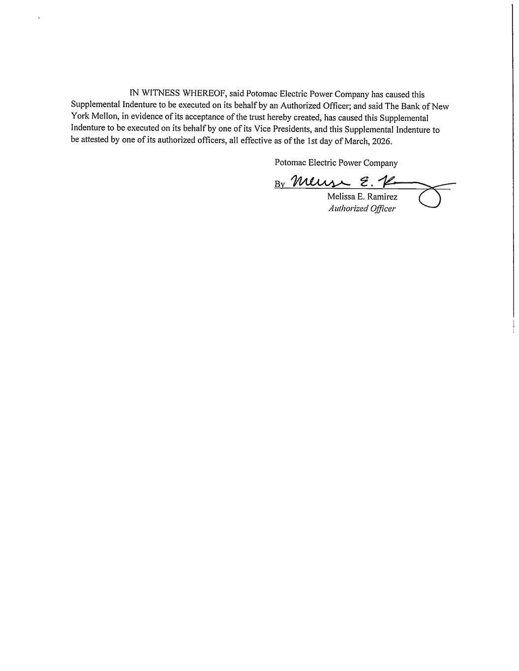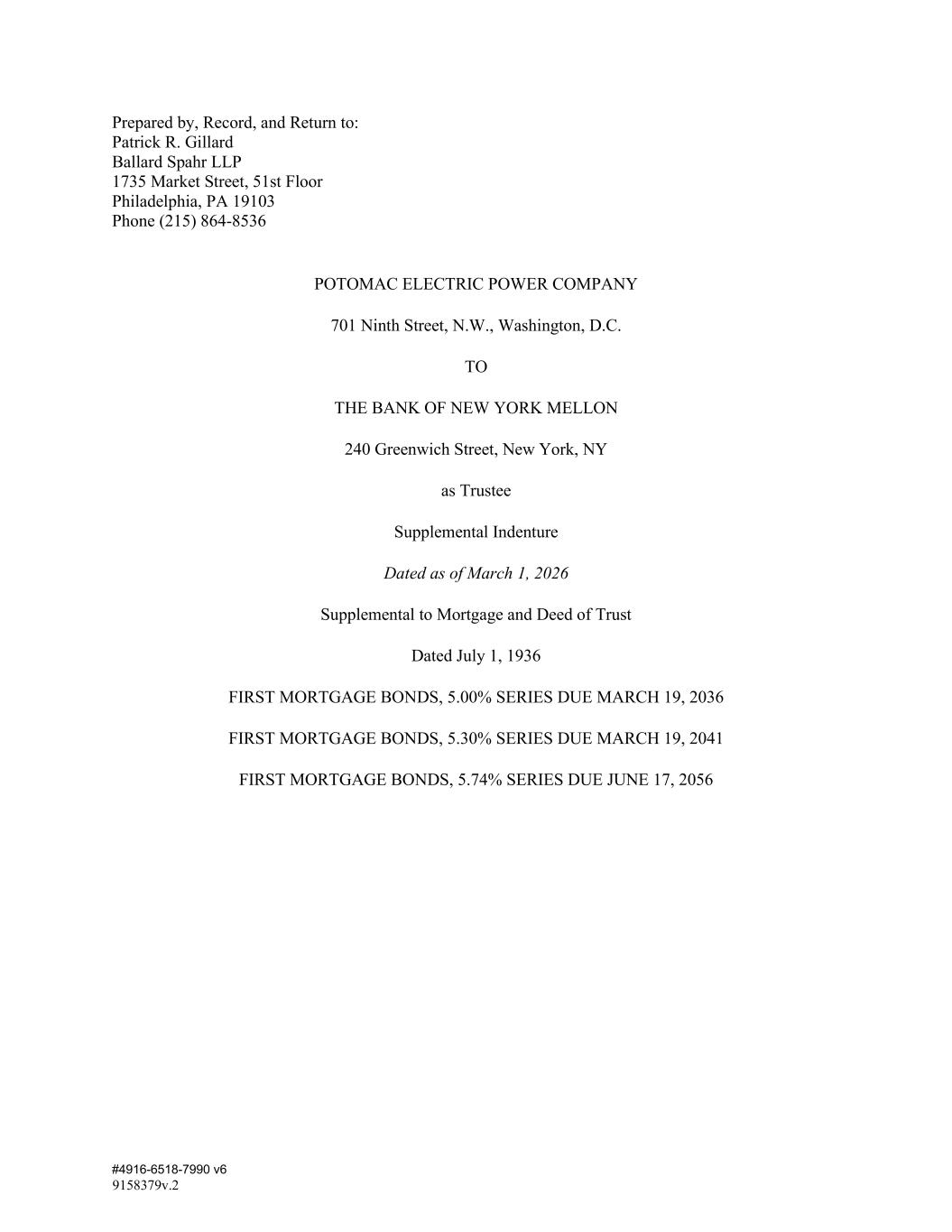 #4916-6518-7990 v6 Prepared by, Record, and Return to: Patrick R. Gillard Ballard Spahr LLP 1735 Market Street, 51st Floor Philadelphia, PA 19103 Phone (215) 864-8536 POTOMAC ELECTRIC POWER COMPANY 701 Ninth Street, N.W., Washington, D.C. TO THE BANK OF NEW YORK MELLON 240 Greenwich Street, New York, NY as Trustee Supplemental Indenture Dated as of March 1, 2026 Supplemental to Mortgage and Deed of Trust Dated July 1, 1936 FIRST MORTGAGE BONDS, 5.00% SERIES DUE MARCH 19, 2036 FIRST MORTGAGE BONDS, 5.30% SERIES DUE MARCH 19, 2041 FIRST MORTGAGE BONDS, 5.74% SERIES DUE JUNE 17, 2056 9158379v.2
