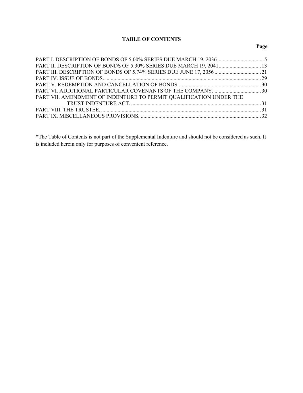 TABLE OF CONTENTS Page PART I. DESCRIPTION OF BONDS OF 5.00% SERIES DUE MARCH 19, 2036 .................................. 5 PART II. DESCRIPTION OF BONDS OF 5.30% SERIES DUE MARCH 19, 2041 ............................... 13 PART III. DESCRIPTION OF BONDS OF 5.74% SERIES DUE JUNE 17, 2056 .................................. 21 PART IV. ISSUE OF BONDS. ................................................................................................................. 29 PART V. REDEMPTION AND CANCELLATION OF BONDS. ............................................................ 30 PART VI. ADDITIONAL PARTICULAR COVENANTS OF THE COMPANY. .................................. 30 PART VII. AMENDMENT OF INDENTURE TO PERMIT QUALIFICATION UNDER THE TRUST INDENTURE ACT. ............................................................................................... 31 PART VIII. THE TRUSTEE. ..................................................................................................................... 31 PART IX. MISCELLANEOUS PROVISIONS. ........................................................................................ 32 *The Table of Contents is not part of the Supplemental Indenture and should not be considered as such. It is included herein only for purposes of convenient reference.